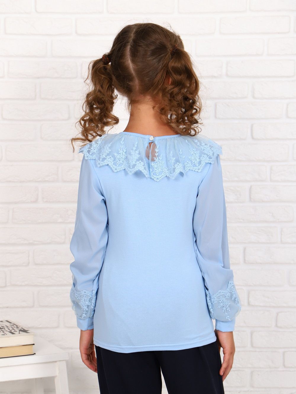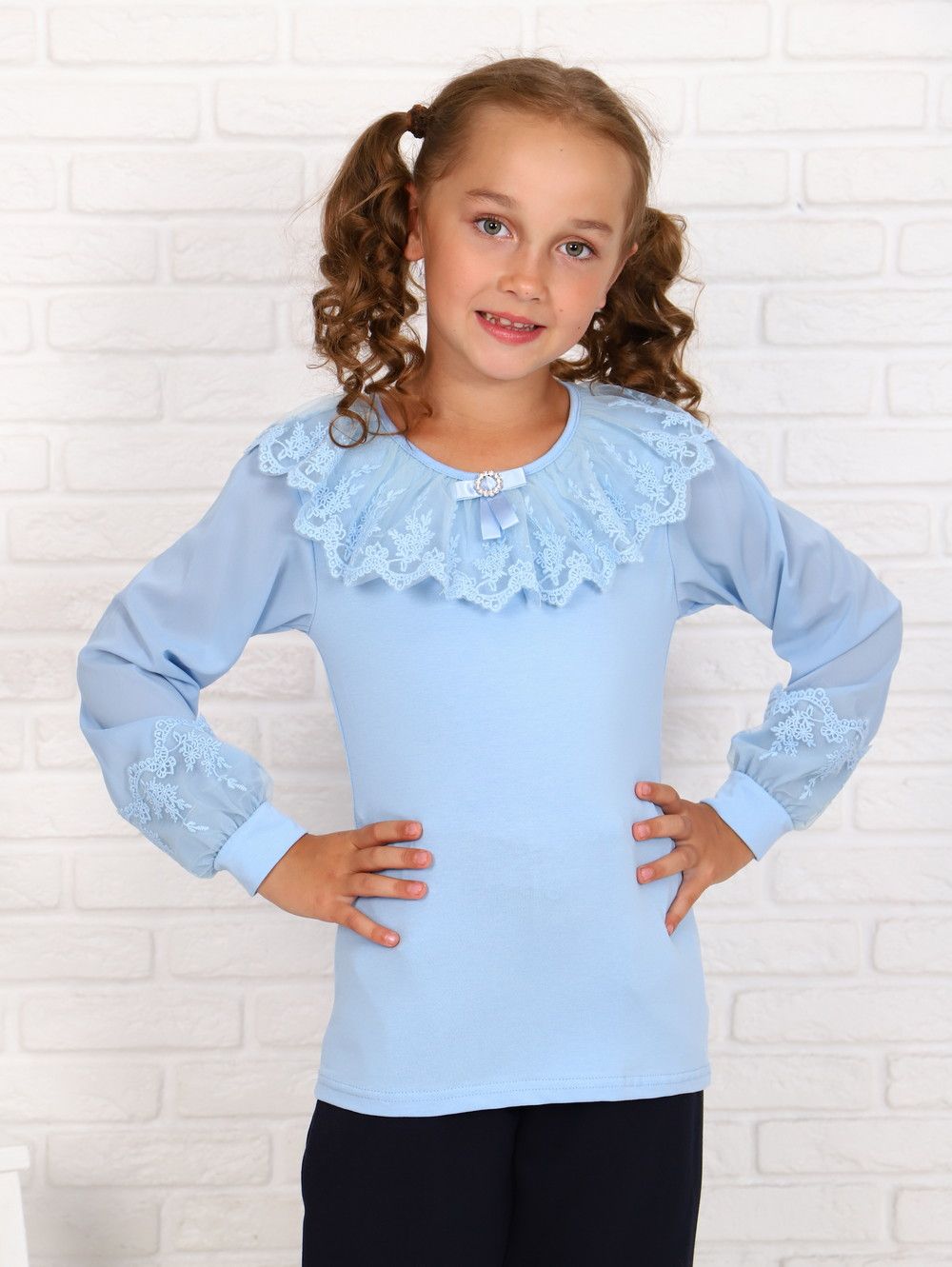 Блузка для девочек с длинным рукавом. Данная модель станет основой школьного или праздничного образа. Элегантное мягкое кружево на горловине можно красиво разложить на сарафан или пиджак, что создаст нарядный look. Оригинальная модель добавит романтизма в образ и подчеркнет индивидуальность, можно сочетать с юбкой, сарафаном и брюками. Шифоновые рукава на манжете, по низу настрочено кружево. На спинке вырез в виде капли с застежкой на петлю и пуговицу. Блузка сшита из качественного трикотажа - кулирка с лайкрой, используемый материал не теряет форму после многократных стирок, мягкий и приятный к телу, устойчив к износу. Для сохранения первоначальных свойств изделия, важно соблюдать рекомендации по уходу.
