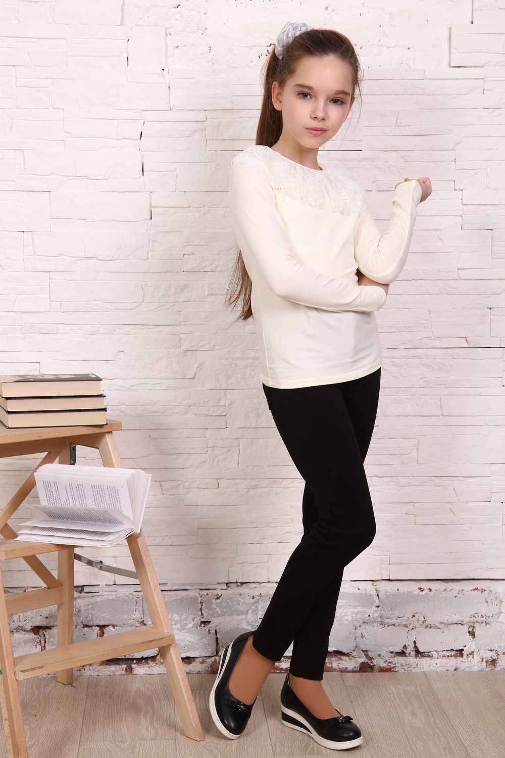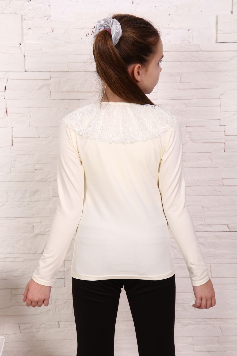 Блузка для девочек дошкольного, младшего и старшего школьного возраста, из однотонного трикотажного полотна кулирка с лайкрой. Блузка полуприлегающего силуэта, с втачным рукавом, без застежки. Спереди и на спинке отсутствуют линии членения. Срез горловины обработан узкой окантовочной лентой из того же полотна в 4 сложения, с вложением присборенного кружева. Рукав одношовный, длинный. Низ рукава без манжеты, подогнут.
