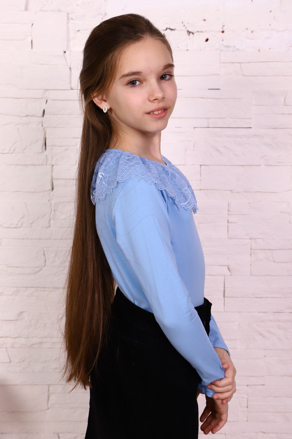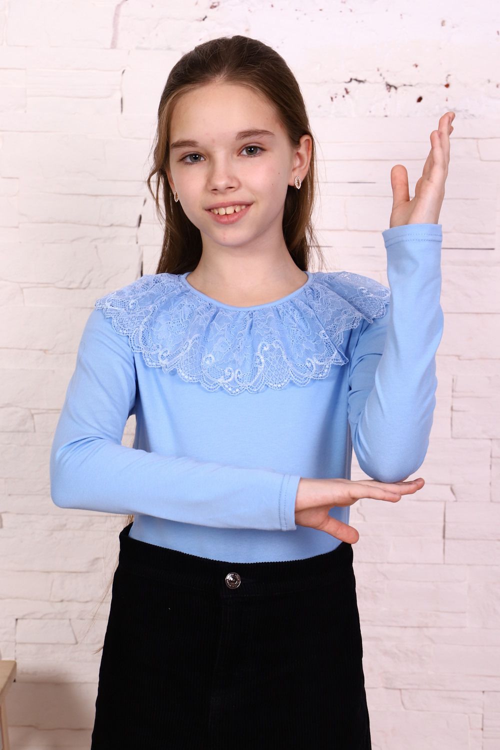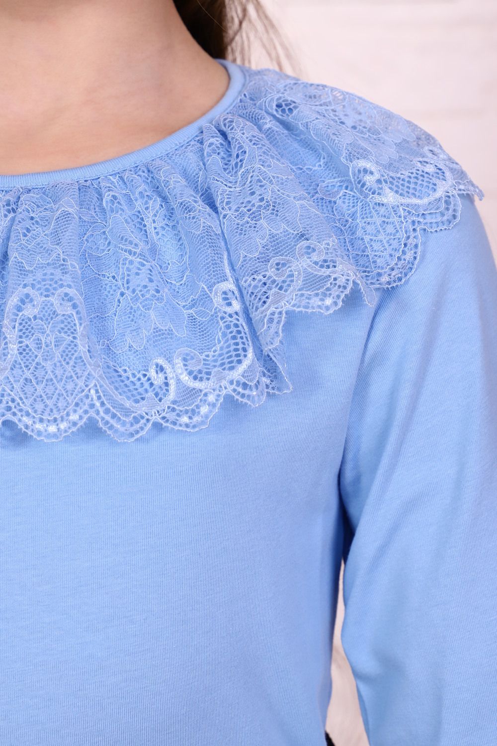 Блузка для девочек дошкольного, младшего и старшего школьного возраста, из однотонного трикотажного полотна кулирка с лайкрой. Блузка полуприлегающего силуэта, с втачным рукавом, без застежки. Спереди и на спинке отсутствуют линии членения. Срез горловины обработан узкой окантовочной лентой из того же полотна в 4 сложения, с вложением присборенного кружева. Рукав одношовный, длинный. Низ рукава без манжеты, подогнут.
