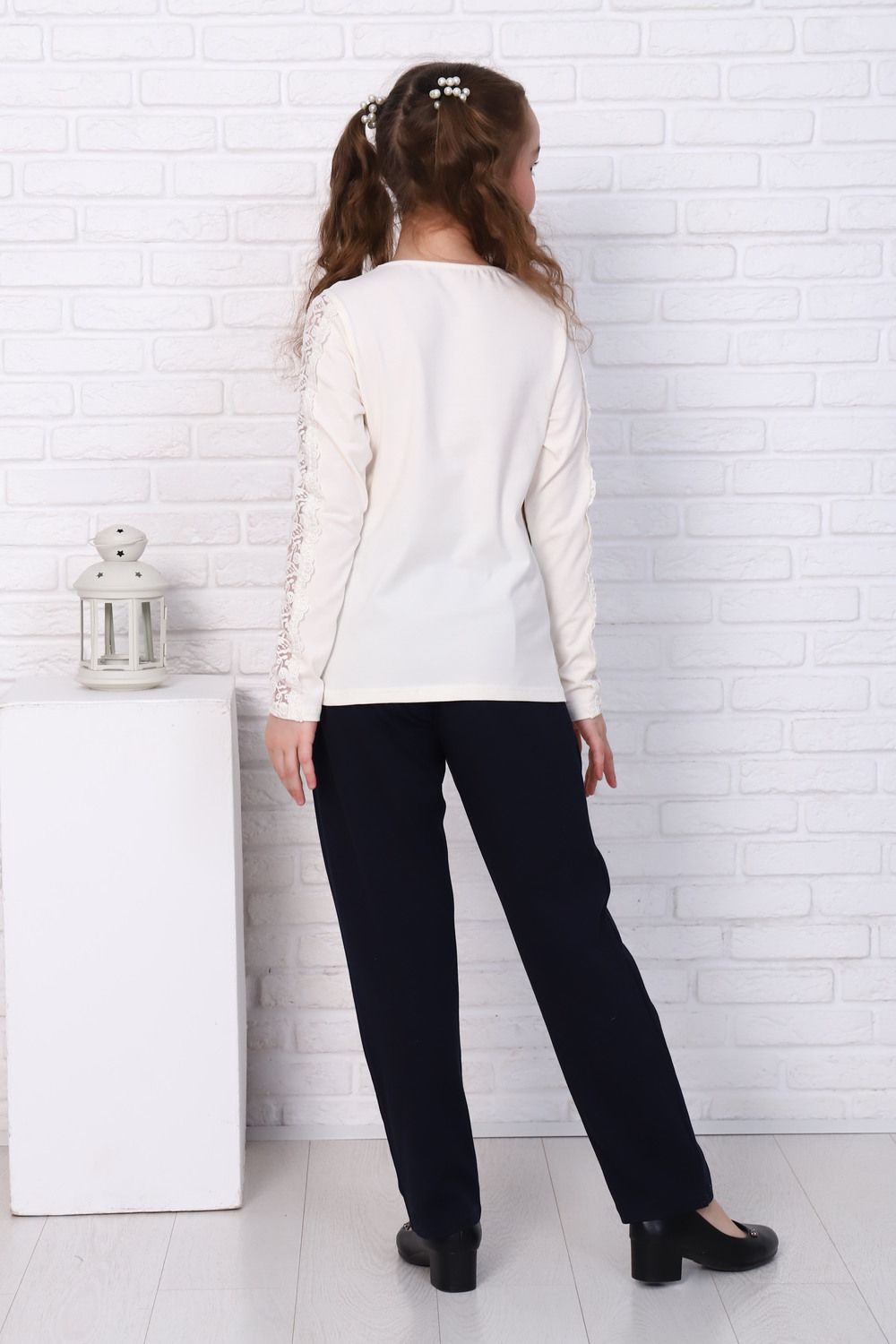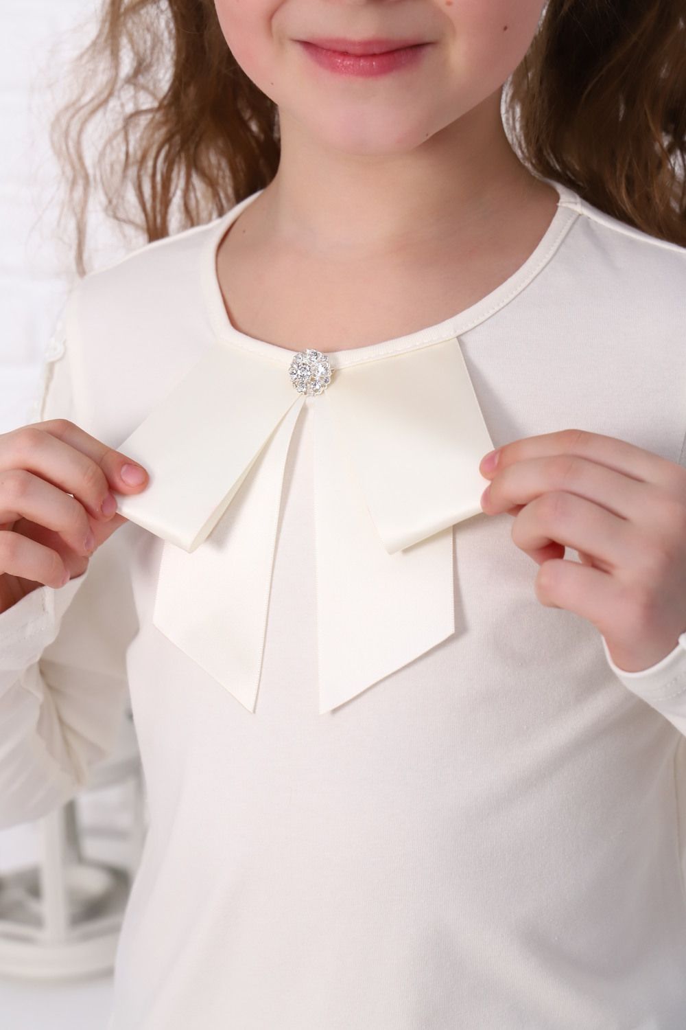 Базовая школьная блузка для девочек с длинным рукавом. Нарядная блузка станет основой как повседневного, так и праздничного образа. Мягкое кружево на рукавах придает модели нежность и шарм. Спереди под окантовку вставлен атласный бант и прикреплена съемная брошь. Модель составит одинаково удачный комплект и с юбкой, и с брюками. Блузка сшита из качественного трикотажа, используемый материал не теряет форму после многократных стирок, мягкий и приятный к телу, устойчив к износу. Для сохранения первоначальных свойств изделия, важно соблюдать рекомендации по уходу.