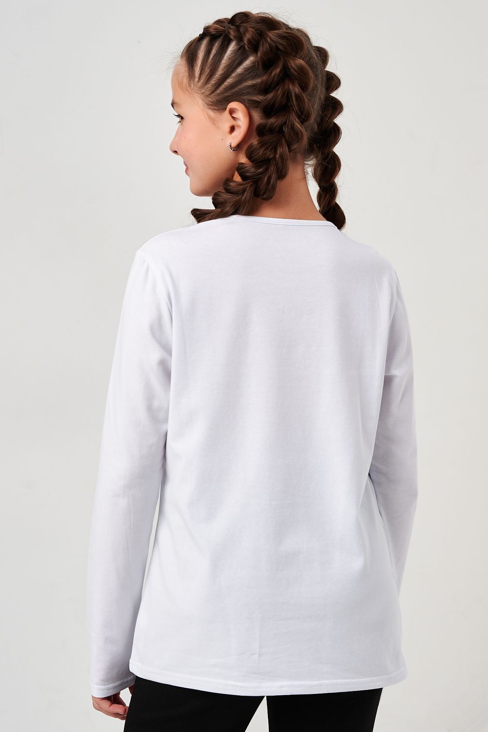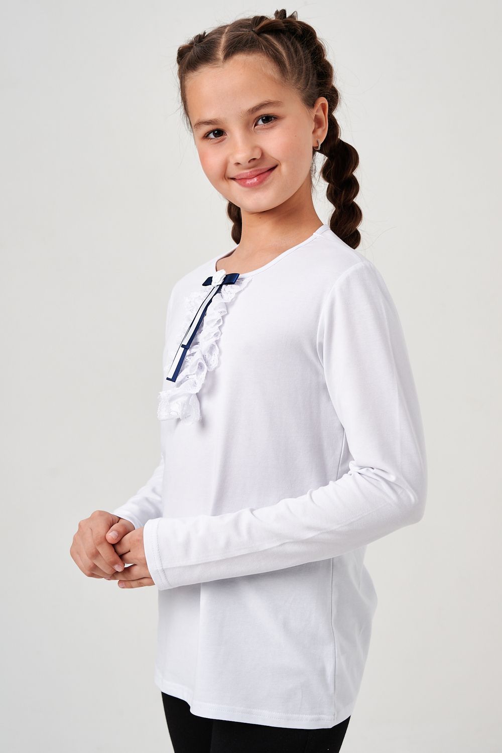 Блузка для девочек младшего и старшего школьного возраста, из однотонного трикотажного полотна. Блузка прилегающего силуэта, с втачным рукавом. Спереди и на спинке отсутствуют линии членения. По центру переда настрочено жабо из кружева. Рукава длинные. Низа рукавов и изделия подогнуты. Горловина окантована. Спереди прикреплен декоративный элемент.