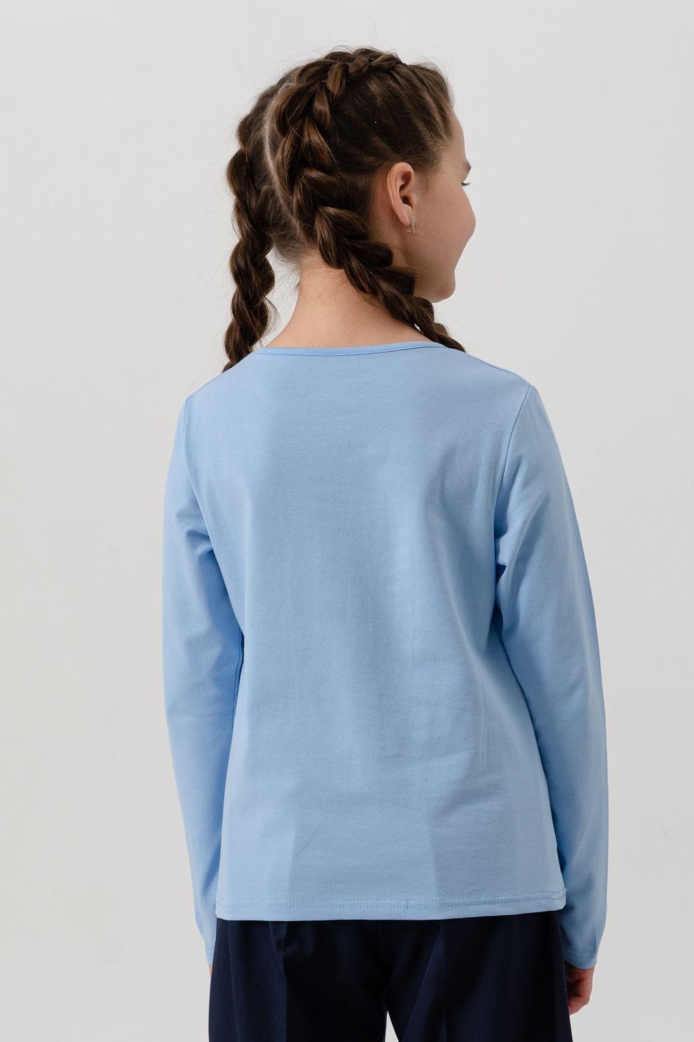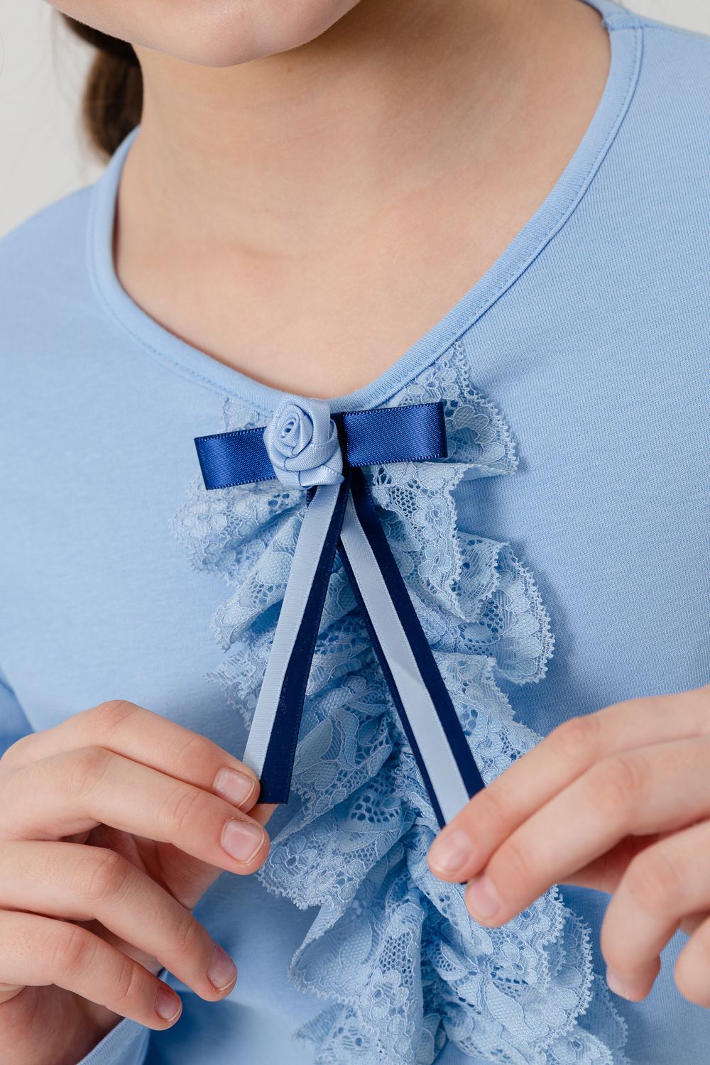 Блузка для девочек младшего и старшего школьного возраста, из однотонного трикотажного полотна. Блузка прилегающего силуэта, с втачным рукавом. Спереди и на спинке отсутствуют линии членения. По центру переда настрочено жабо из кружева. Рукава длинные. Низа рукавов и изделия подогнуты. Горловина окантована. Спереди прикреплен декоративный элемент.