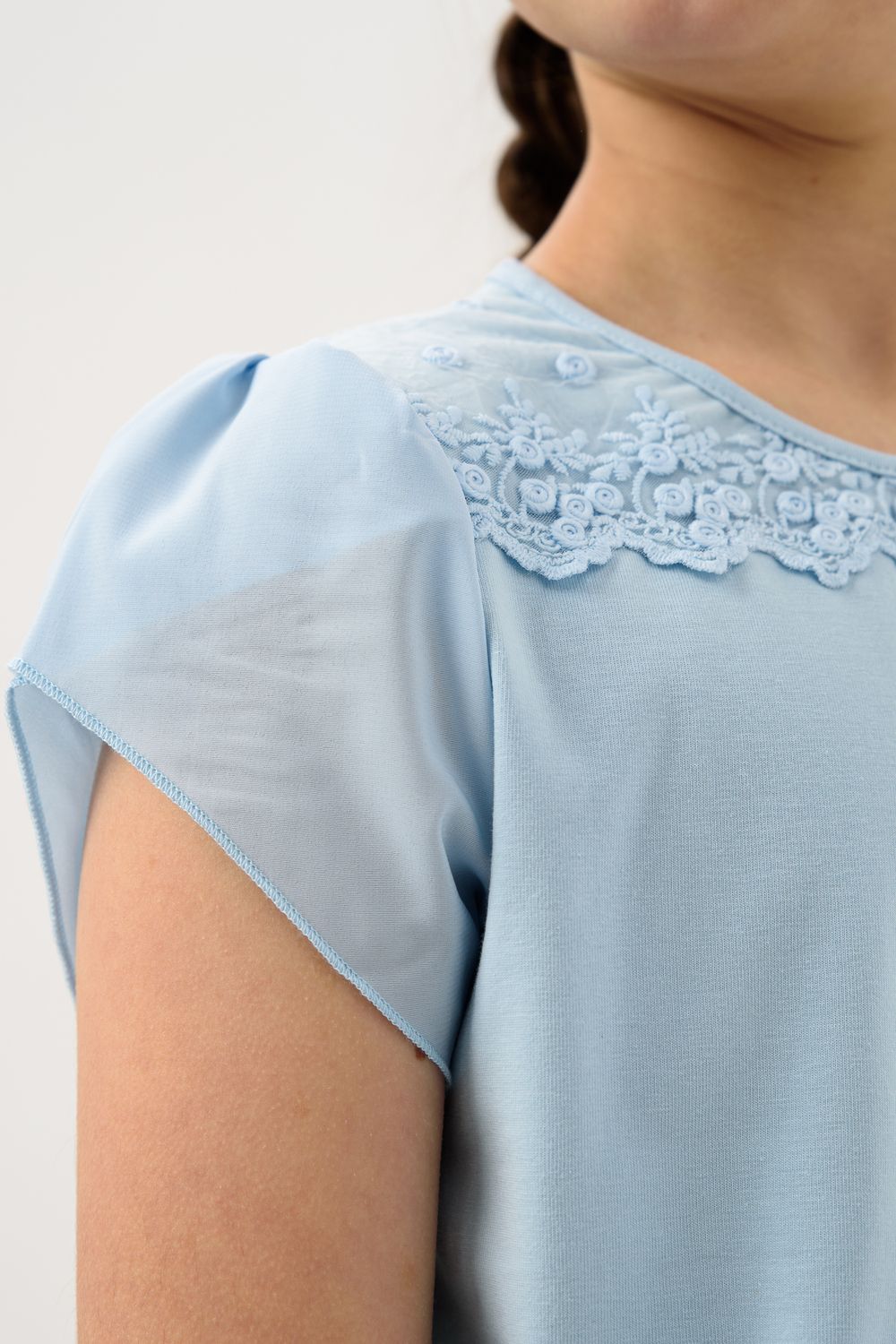 Джемпер для девочки из трикотажного полотна кулирка с лайкрой с коротким рукавом. Джемпер полуприлегающего силуэта, с втачным рукавом из шифона, без застежки. Спереди на кокетке настрочено кружево, прикреплен декоративный элемент. Рукав короткий, из двух частей, присборенный по окату. Низ рукавов обметан на краеобметочной машине. Низ изделия подогнут. Срез горловины обработан узкой окантовочной лентой из того же полотна.