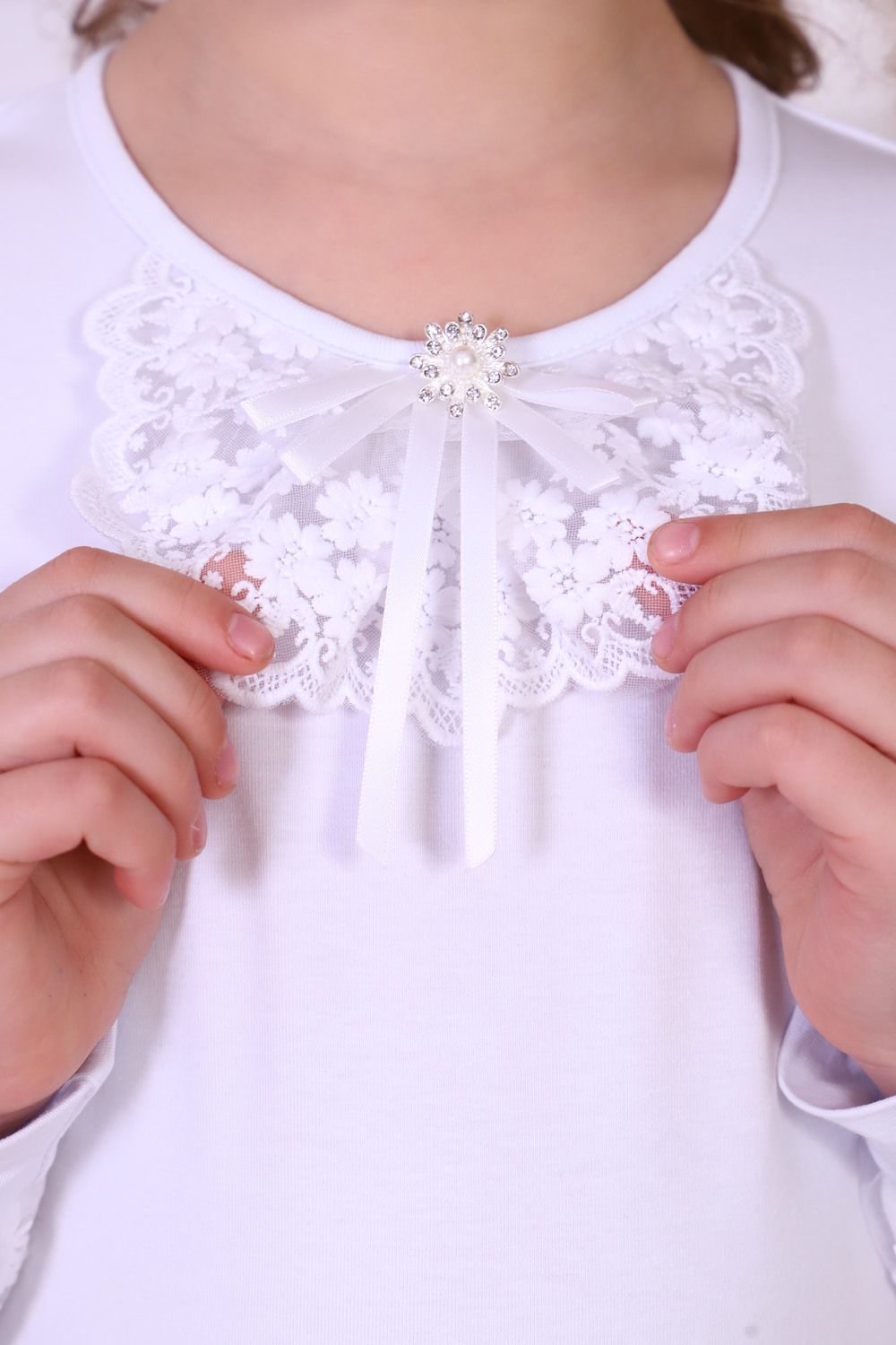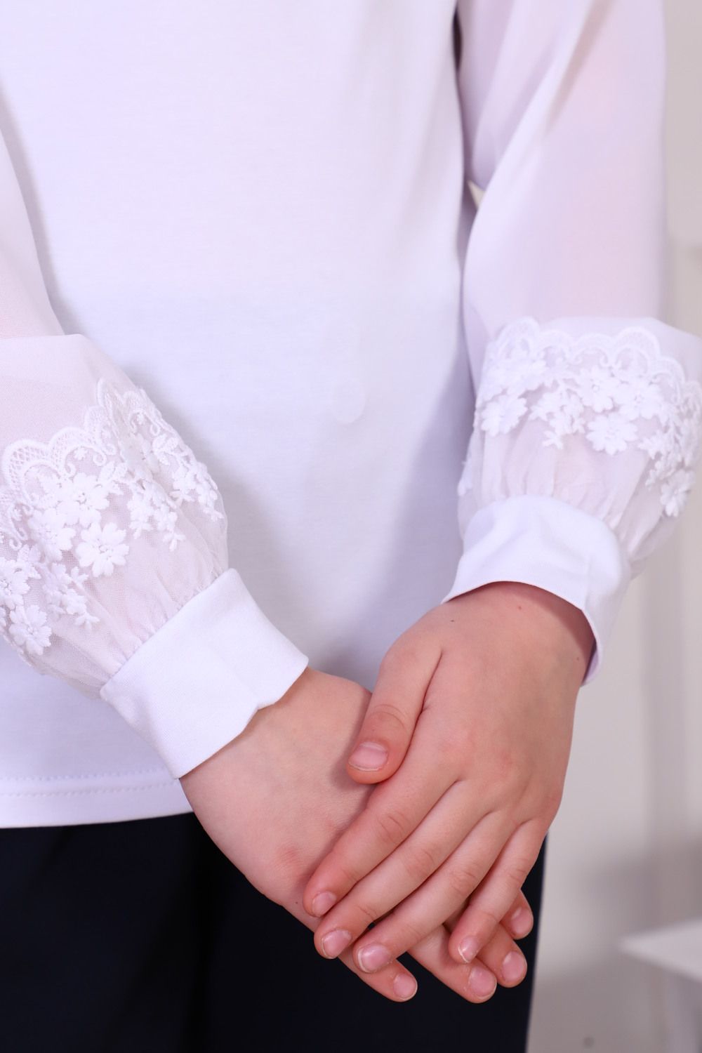 Блузка школьная для девочки с шифоновыми длинными рукавами, круглым вырезом горловины, с жабо, с застежкой сзади на петлю и пуговицу, полуприлегающего силуэта, сшита из основного материала: однотонного трикотажного полотна - кулирка с лайкрой с добавлением в состав хлопка 92% и лайкры 8 % и отделочного материала: шифон и кружево. Перед, спинка и манжеты выполнены из основного материала, рукава – из шифона, жабо и нашивка на рукав – из кружева. Рукав на манжете, по низу настрочено кружево. Жабо со складками и декоративным бантиком из атласной ленты, съёмная брошь. Блузка отлично сидит по фигуре, движения в нем комфортные, позволяет выглядеть ребенку изящно. Хорошо смотрится в сочетании с юбками, сарафанами, брюками.