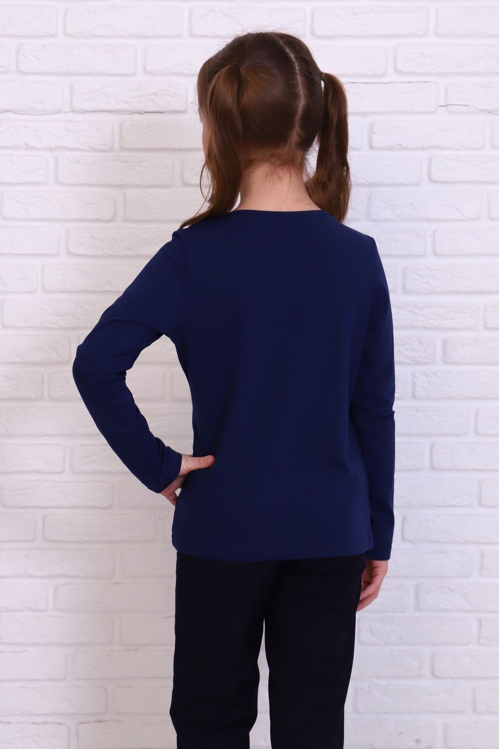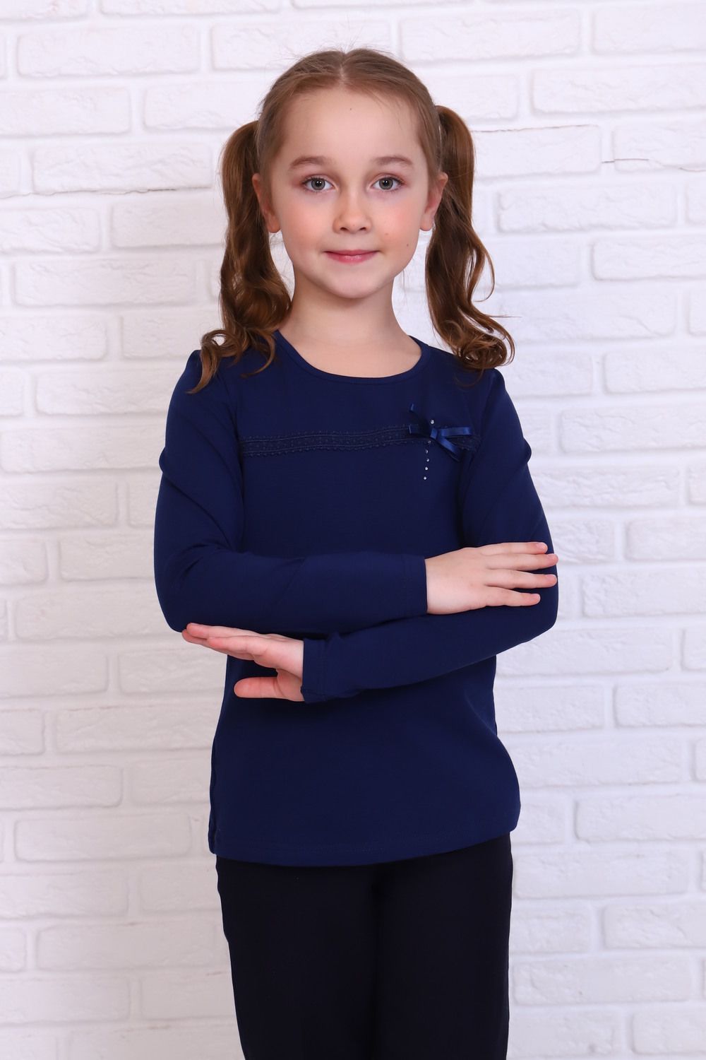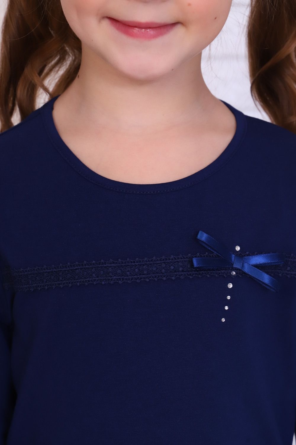 Блузка для девочек младшего и старшего школьного возраста, из однотонного трикотажного полотна. Блузка прилегающего силуэта, с втачным рукавом. Спереди и на спинке отсутствуют линии членения. Рукава длинные. Низа рукавов и изделия подогнуты. Горловина окантована. Спереди по линии груди настрочено кружево и прикреплен декоративный элемент из страз и атласной ленты.