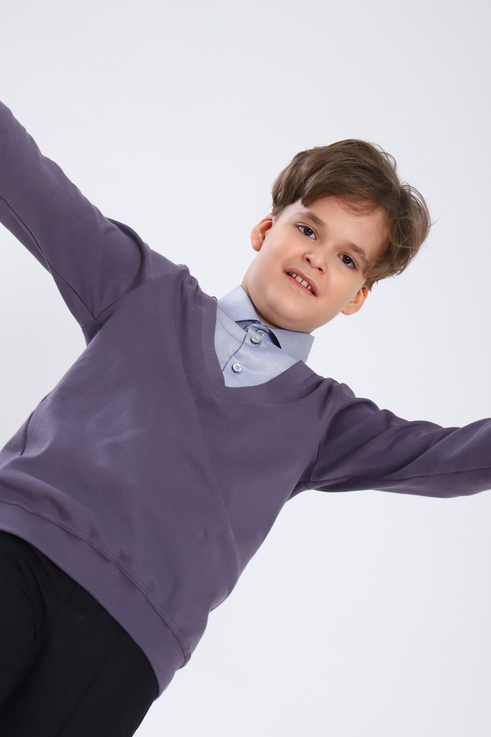Джемпер-обманка Jersey Lab с длинным рукавом одновременно сочетает в себе 2 предмета гардероба: джемпер в классическом стиле и имитацию рубашки, с застежкой на пуговицы. Рубашку-обманку не нужно заправлять в брюки и она не выбивается из под одежды, как рубашка в классическом варианте. Изделия отшиваются из кулирки высокого качества пенье, низ рукавов и джемпера на манжете. Джемпер-рубашка - это оптимальное решение для создания стильных образов в школу и праздничных мероприятий. Джемпер для мальчика изготовлен из плотного хлопкового полотна, а воротник из рубашечной ткани.