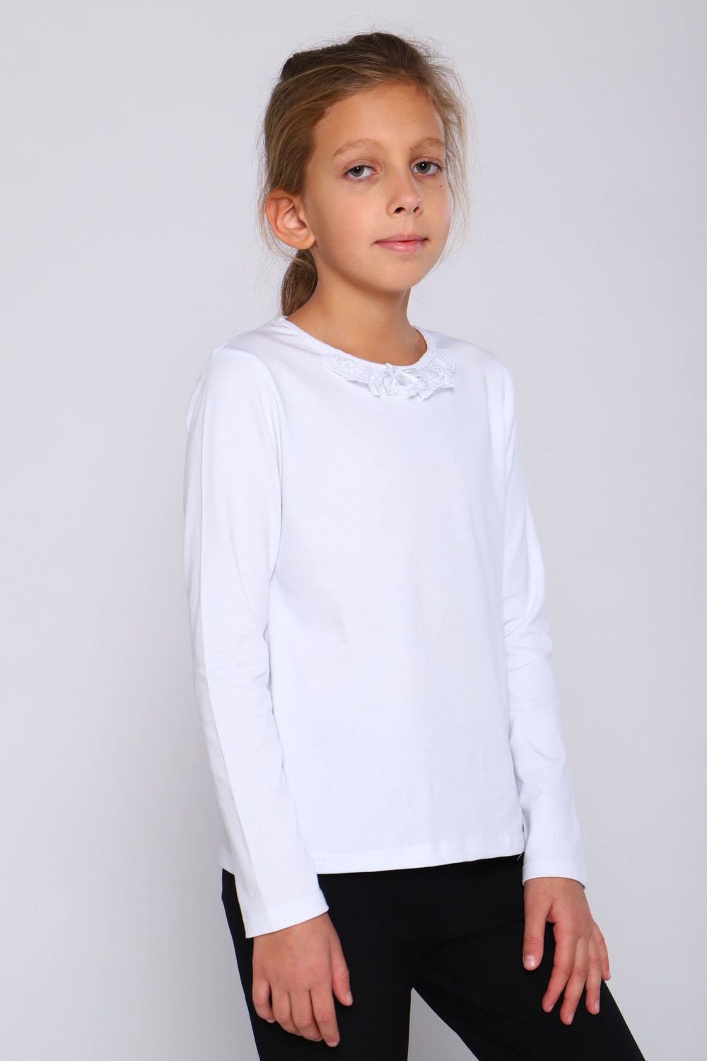 Базовая школьная блузка для девочек с длинным рукавом. Блузка прилегающего силуэта, с втачным рукавом. По центру переда настрочено жабо из кружева и прикреплен декоративный элемент. Нарядная блузка станет основой повседневного и праздничного образа. Модель составит одинаково удачный комплект и с юбкой, и с брюками. Блузка сшит из качественного трикотажа, используемый материал не теряет форму после многократных стирок, мягкий и приятный к телу, устойчив к износу. Для сохранения первоначальных свойств изделия, важно соблюдать рекомендации по уходу.
