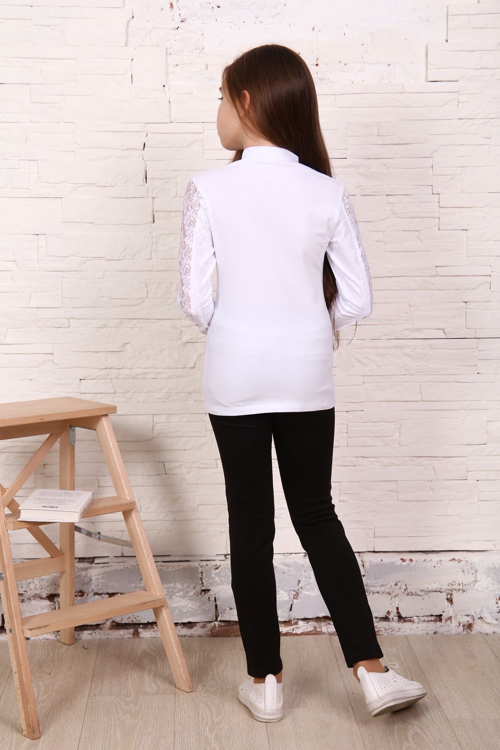 Блузка для девочек младшего и старшего школьного возраста, из однотонного трикотажного полотна кулирка с лайкрой. Блузка полуприлегающего силуэта, с втачным рукавом, без застежки, с воротником - стойкой. Спереди и на спинке отсутствуют линии членения. Рукав одношовный с кружевной вставкой, длинный. Низ рукава без манжеты, подогнут.