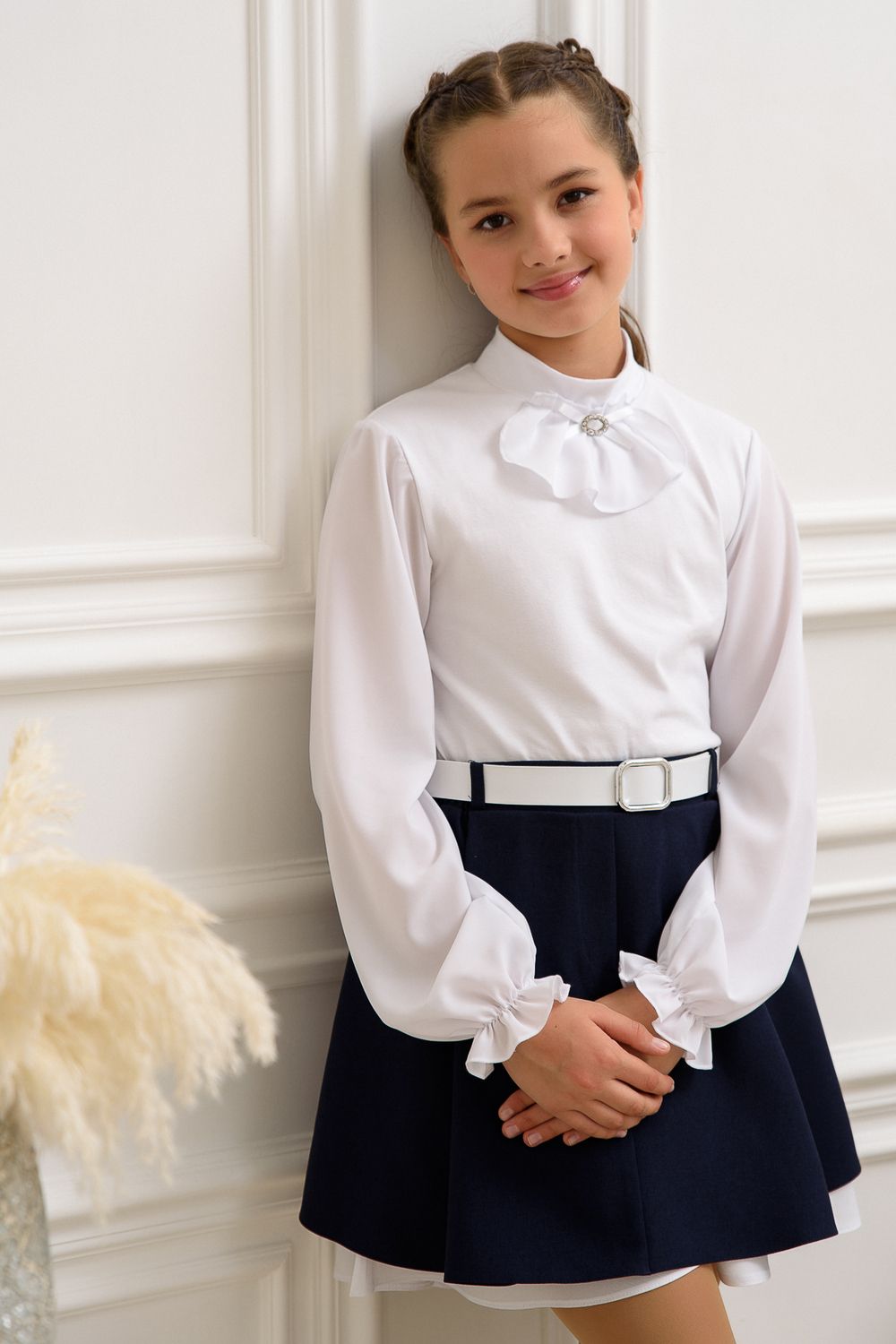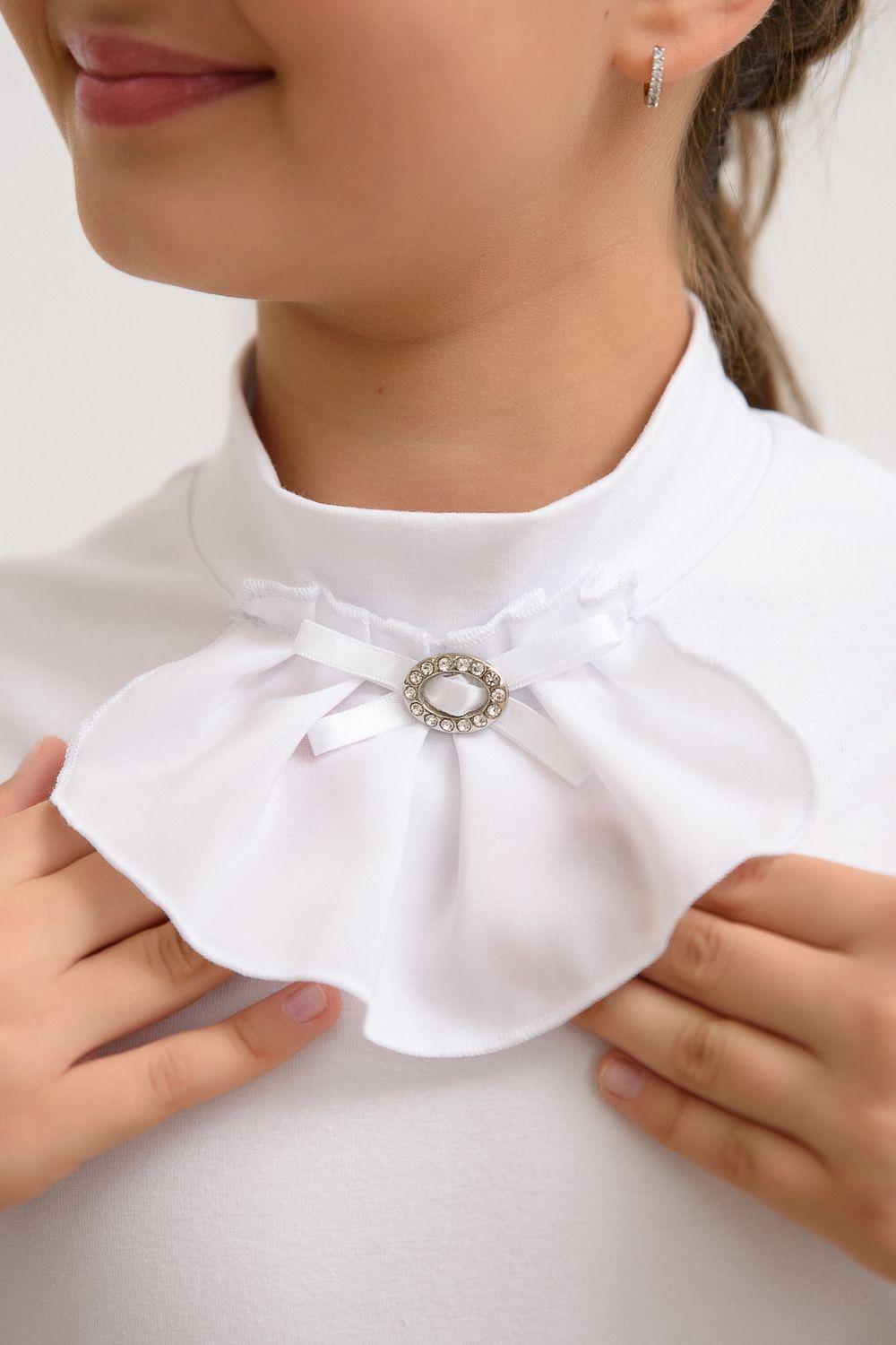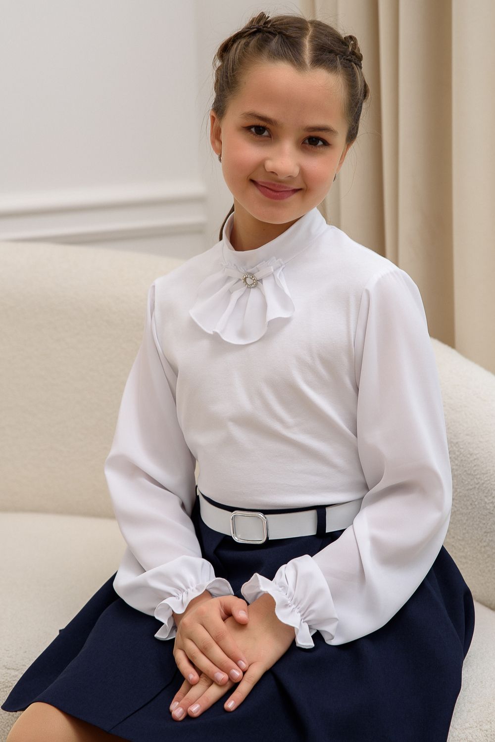 Блузка школьная для девочки с шифоновыми длинными рукавами, круглым вырезом горловины, без застёжки, сшита из однотонного полотна с добавлением в состав хлопка 92% и лайкры 8 %, и шифона, воротник - стойка, с жабо (пришито!) и брошкой, низ рукава собран на резинку, жабо со складками и декоративным элементом. Школьная форма украсит и дополнит любой образ не только в школу, но и для повседневной носки, на день рождения, фотосессию и для особых случаев. Блузка для девочки школьная отлично сидит по фигуре, движения в ней комфортные, позволяет выглядеть ребенку изящно. Хорошо смотрятся в сочетании с юбками, сарафанами, брюками, со школьным костюмом, отлично сохраняют цвет и форму при активной носке и после многократных стирок. Используемый материал блузки мягкий и приятный телу, устойчив к износу, не садится, не образует катышек на поверхности, имеет эффектный внешний вид.