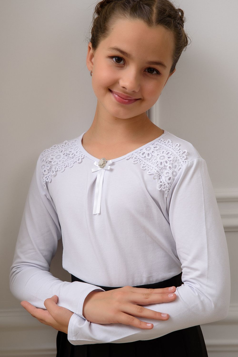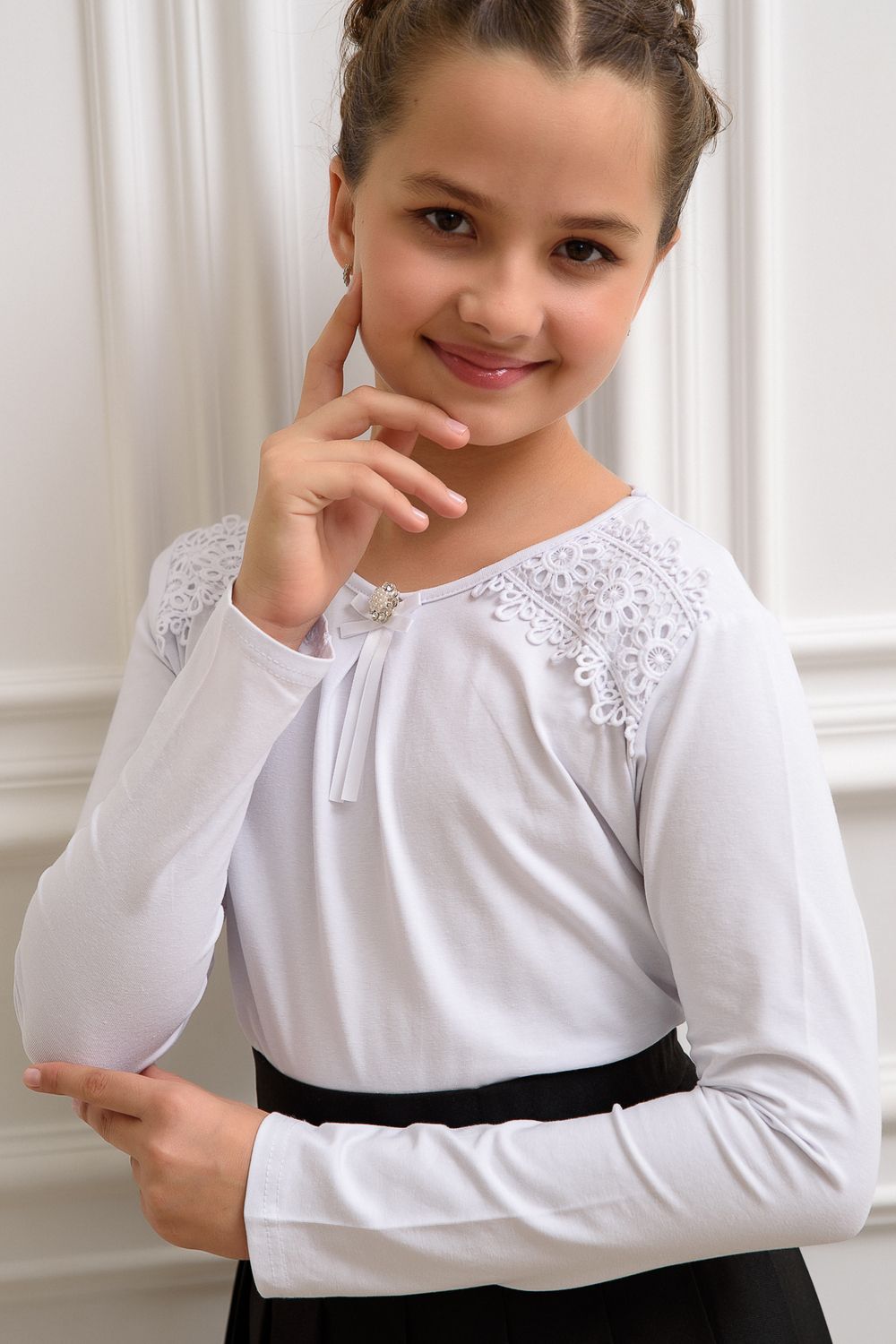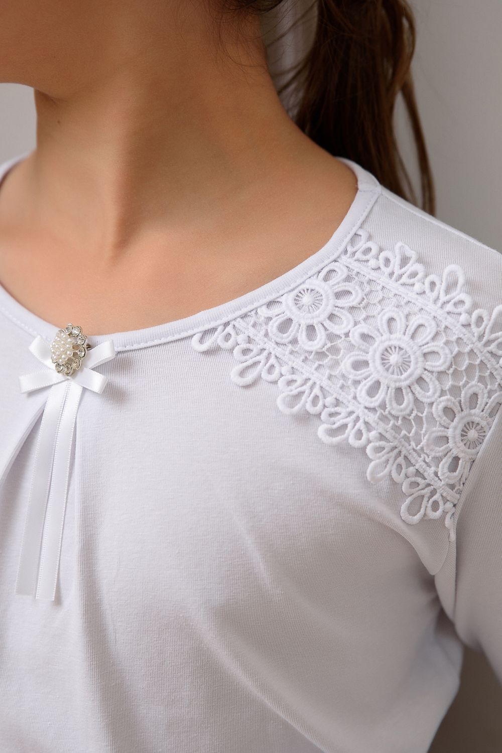 Блузка школьная для девочки с трикотажными длинными рукавами, круглым вырезом горловины, по центру горловины прикреплена брошь, без застёжки. На передней части блузки настрочено кружево. Сшита из мягкого хлопкового трикотажного материала с добавлением в состав хлопка 92% и лайкры 8 %. Школьная форма украсит и дополнит любой образ не только в школу, но и для повседневной носки, на день рождения, фотосессию и для особых случаев. Блузка отлично сидит по фигуре, движения в нем комфортные, позволяет выглядеть ребенку изящно. Хорошо смотрится в сочетании с юбками, сарафанами, брюками, со школьным костюмом, отлично сохраняют цвет и форму при активной носке и после многократных стирок. Используемый материал блузки мягкий и приятный телу, устойчив к износу, не садится, не образует катышек на поверхности, имеет эффектный внешний вид.