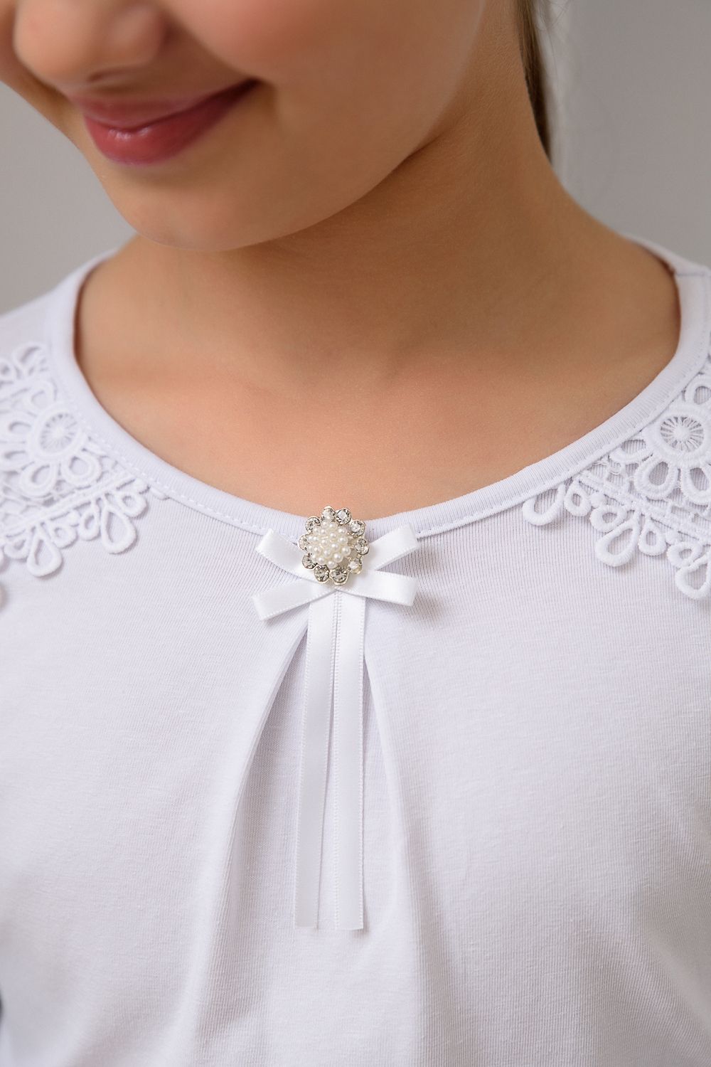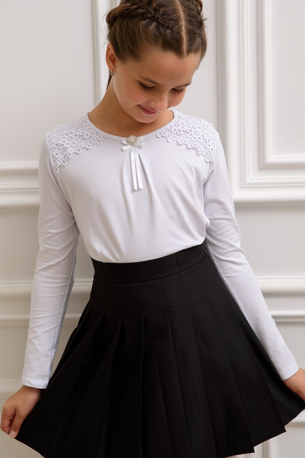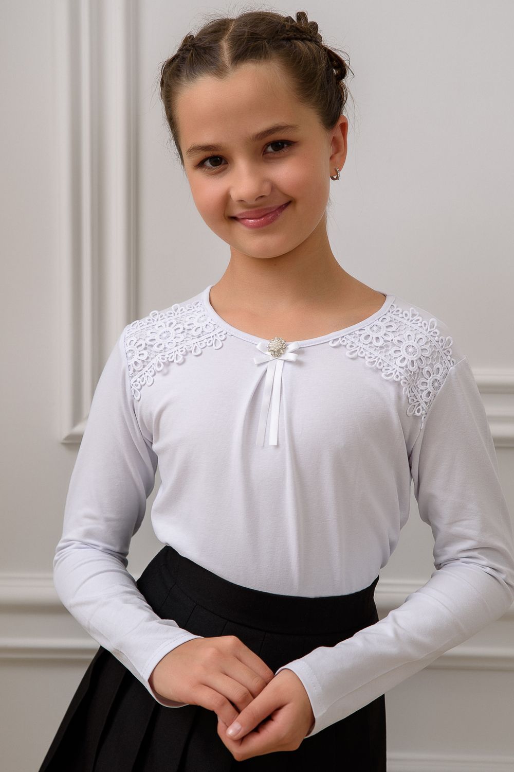 Блузка школьная для девочки с трикотажными длинными рукавами, круглым вырезом горловины, по центру горловины прикреплена брошь, без застёжки. На передней части блузки настрочено кружево. Сшита из мягкого хлопкового трикотажного материала с добавлением в состав хлопка 92% и лайкры 8 %. Школьная форма украсит и дополнит любой образ не только в школу, но и для повседневной носки, на день рождения, фотосессию и для особых случаев. Блузка отлично сидит по фигуре, движения в нем комфортные, позволяет выглядеть ребенку изящно. Хорошо смотрится в сочетании с юбками, сарафанами, брюками, со школьным костюмом, отлично сохраняют цвет и форму при активной носке и после многократных стирок. Используемый материал блузки мягкий и приятный телу, устойчив к износу, не садится, не образует катышек на поверхности, имеет эффектный внешний вид.