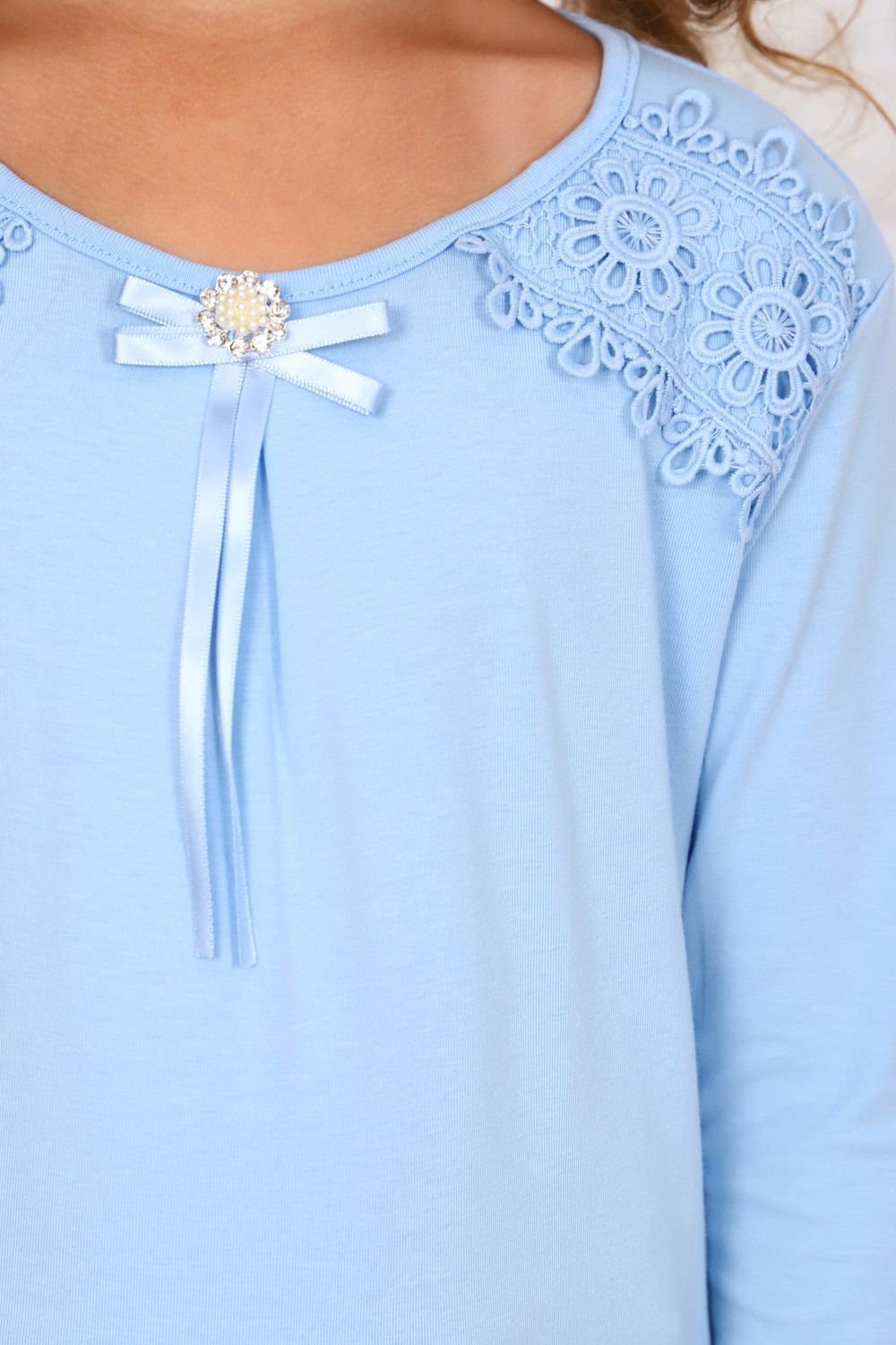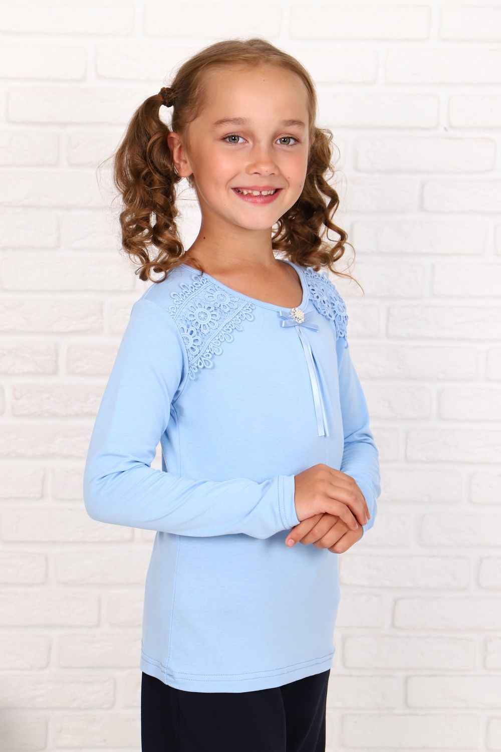 Блузка школьная для девочки с трикотажными длинными рукавами, круглым вырезом горловины, по центру горловины прикреплена брошь, без застёжки. На передней части блузки настрочено кружево. Сшита из мягкого хлопкового трикотажного материала с добавлением в состав хлопка 92% и лайкры 8 %. Школьная форма украсит и дополнит любой образ не только в школу, но и для повседневной носки, на день рождения, фотосессию и для особых случаев. Блузка отлично сидит по фигуре, движения в нем комфортные, позволяет выглядеть ребенку изящно. Хорошо смотрится в сочетании с юбками, сарафанами, брюками, со школьным костюмом, отлично сохраняют цвет и форму при активной носке и после многократных стирок. Используемый материал блузки мягкий и приятный телу, устойчив к износу, не садится, не образует катышек на поверхности, имеет эффектный внешний вид.