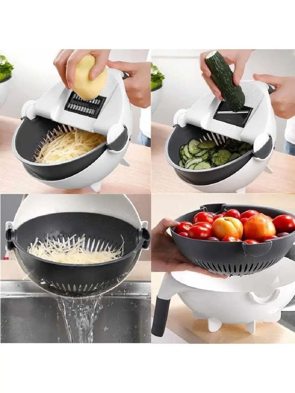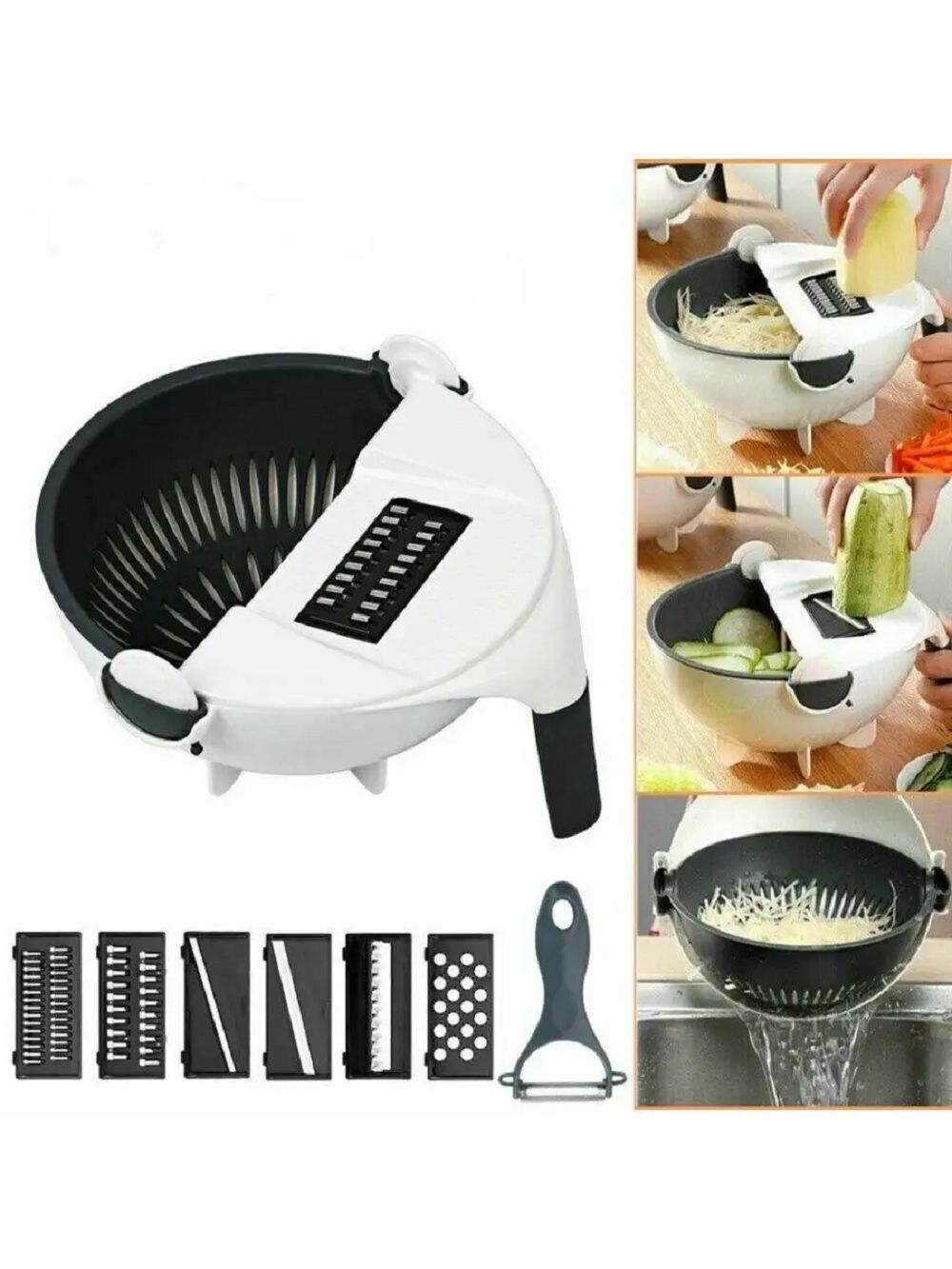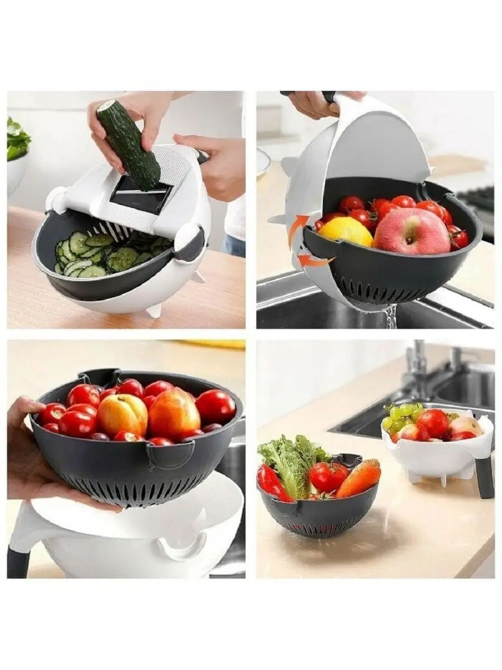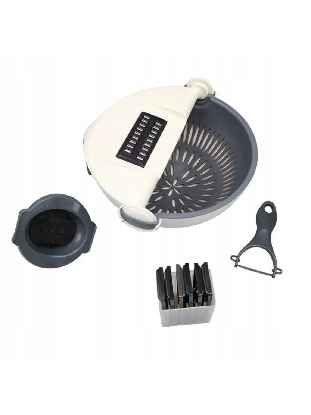 Поможет быстро нарезать и нашинковать продукты! Многофункциональная вращающаяся овощерезка с дуршлагом. Устройство состоит из большой чаши и накладной терки со сменными насадками. Вы можете сложить продукты в чашу и вымыть их, поскольку она имеет встроенный дуршлаг для стекания воды. В комплекте вы найдете 5 насадок, которые подойдут для выполнения разных задач на кухне. Все режущие элементы сделаны из заточенной нержавеющей стали, потому овощерезка прослужит вам много лет! Технические характеристики: Материал: АБС пластик, заточенная нержавеющая сталь; Количество насадок: 5шт. 7 предметов.