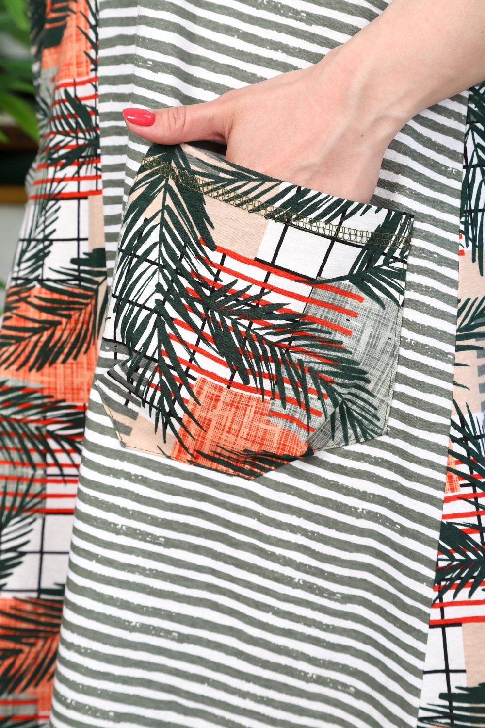 Платье женское, расширенное к низу. Полочка и спинка состоит из двух симметричных частей из тканей компаньонов: полоса и пальмы. На полочках накладные карманы. Рукав втачной, укороченный. На плече рюши, имитирующие бретель. Низ платья с углами, длина по спинке замерена от плечевой точки до верхнего угла низа.