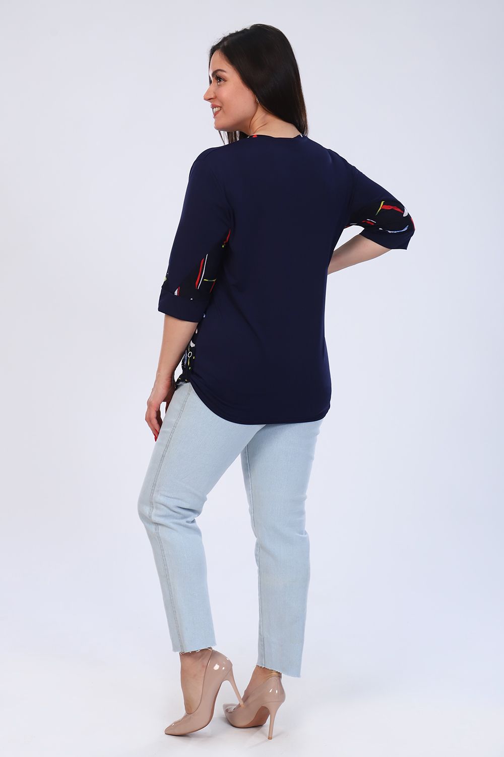 Туника прямого кроя, рукав 3/4 на манжете, вырез округлый отделан кантом. Передняя полочка на кокетке, низ изделия подобран на паты.