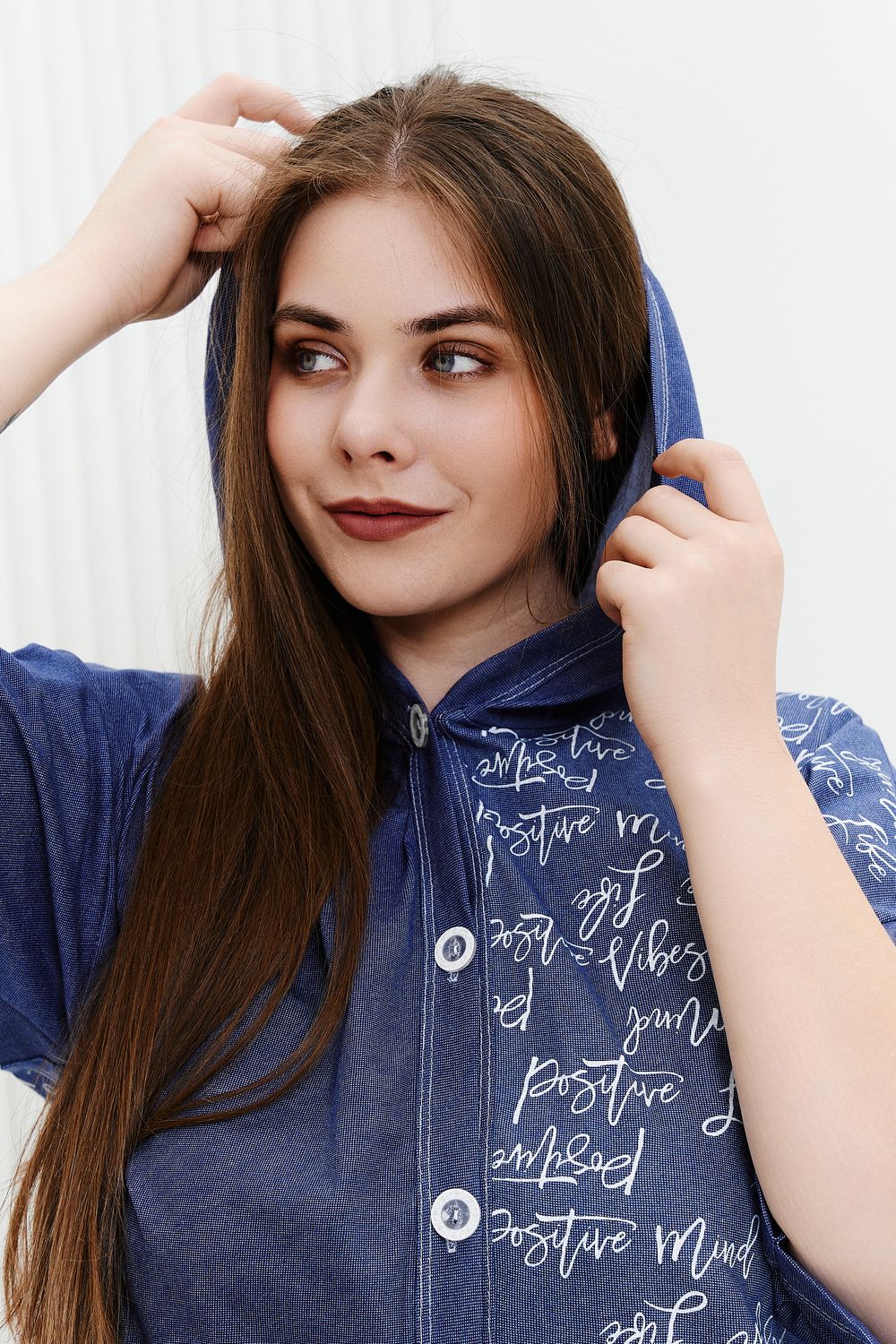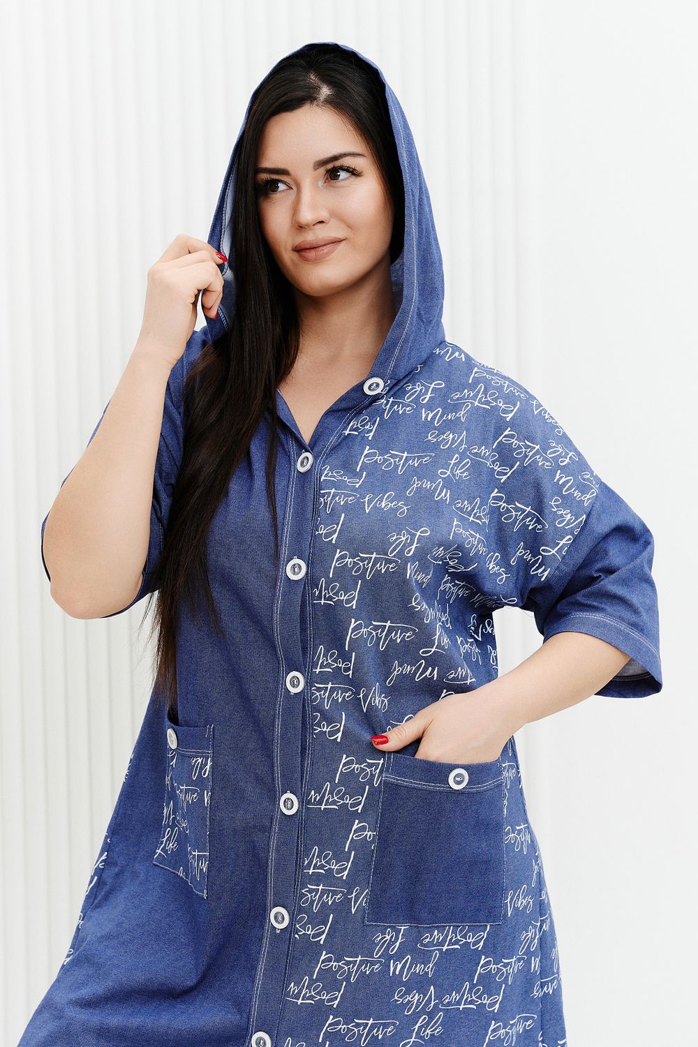 Халат женский, полуприлегающий, слегка расширенный к низу, с капюшоном. Застежка на петли-пуговицы. На полочке два накладных кармана. На спинке кокетка, и складка, которая придает изделию дополнительную свободу движения. Использование двух тканей-компаньонов придает изделию особую актуальность.