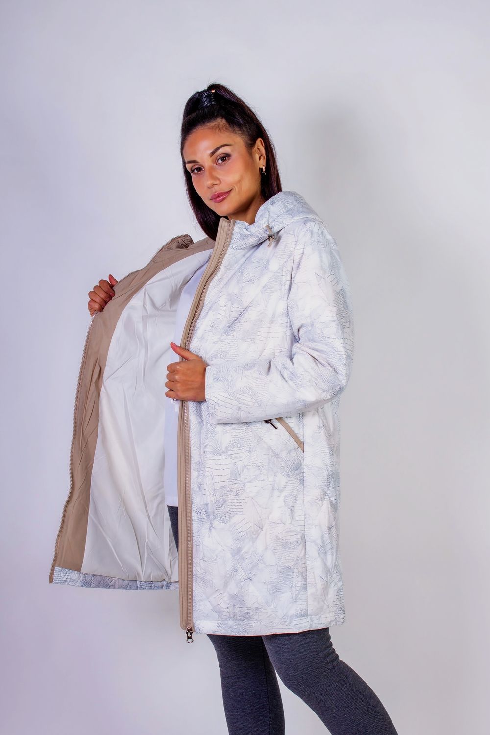 Элегантная демисезонная куртка с капюшоном Листья арт.338 - бежевый