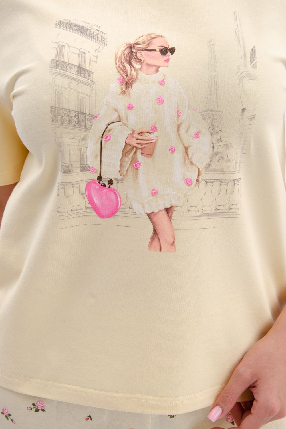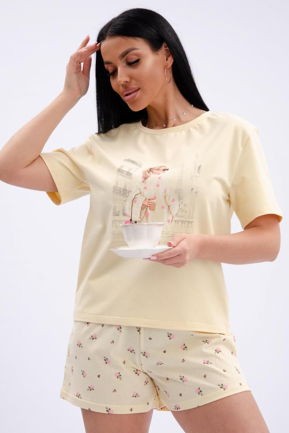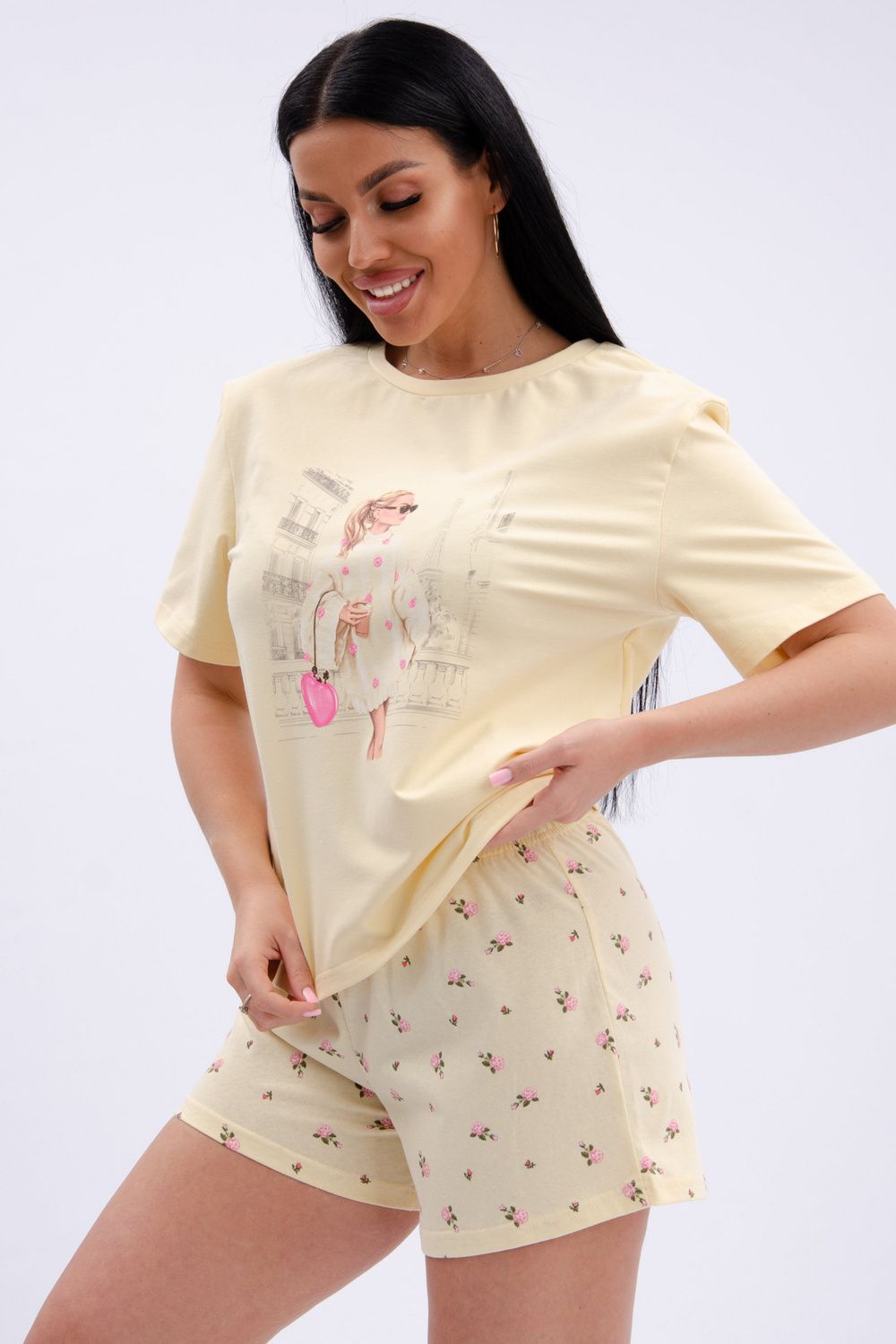 Пижама женская состоит из футболки с коротким рукавом и шортов. Футболка из однотонной кулирки с красивым принтом.