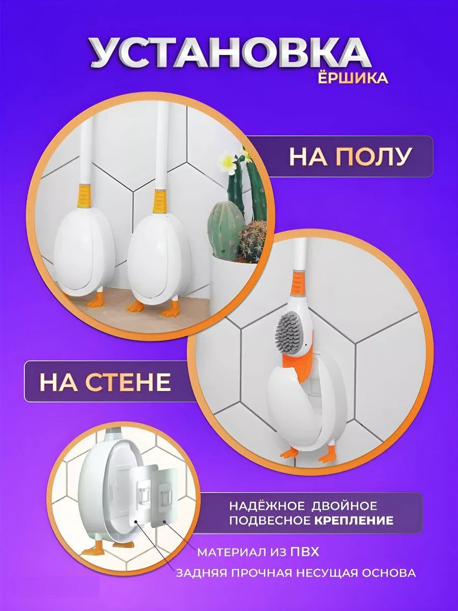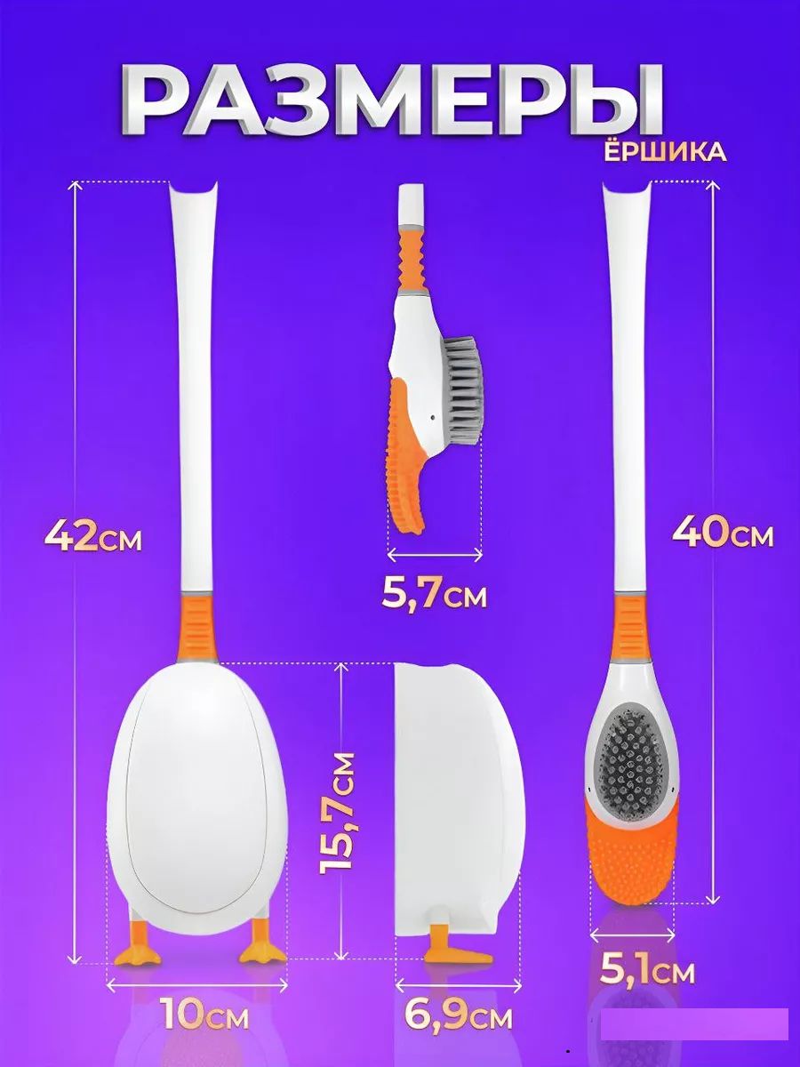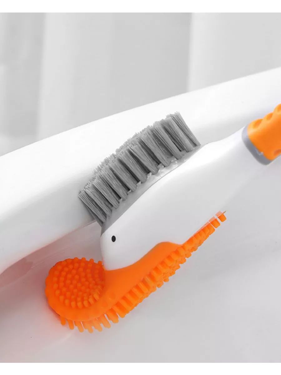 Двухсторонний ершик для унитаза "Уточка" представляет собой удобное и эффективное решение для поддержания стерильной чистоты в ванной комнате и туалете. Этот ершик с подставкой на ножках выполнен в уникальном дизайне милой уточки, есть 2 разные щетки, одна из силиконовых щетинок и вторая из жестких щетинок обеспечивают легкость использования, тщательность уборки и удобство хранения. Изготовленный из высококачественного пластика и силиконового материала, он не только гибкий, но и долговечный, способен выдерживать разные химикаты, чистящие средства для уборки унитаза и ванной комнаты и не подвержен царапинам.