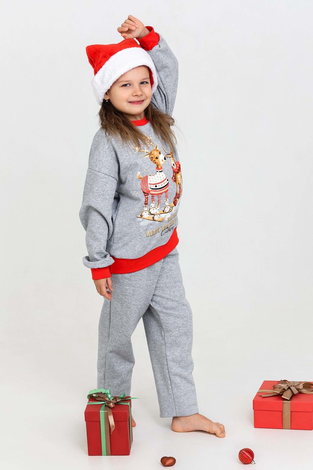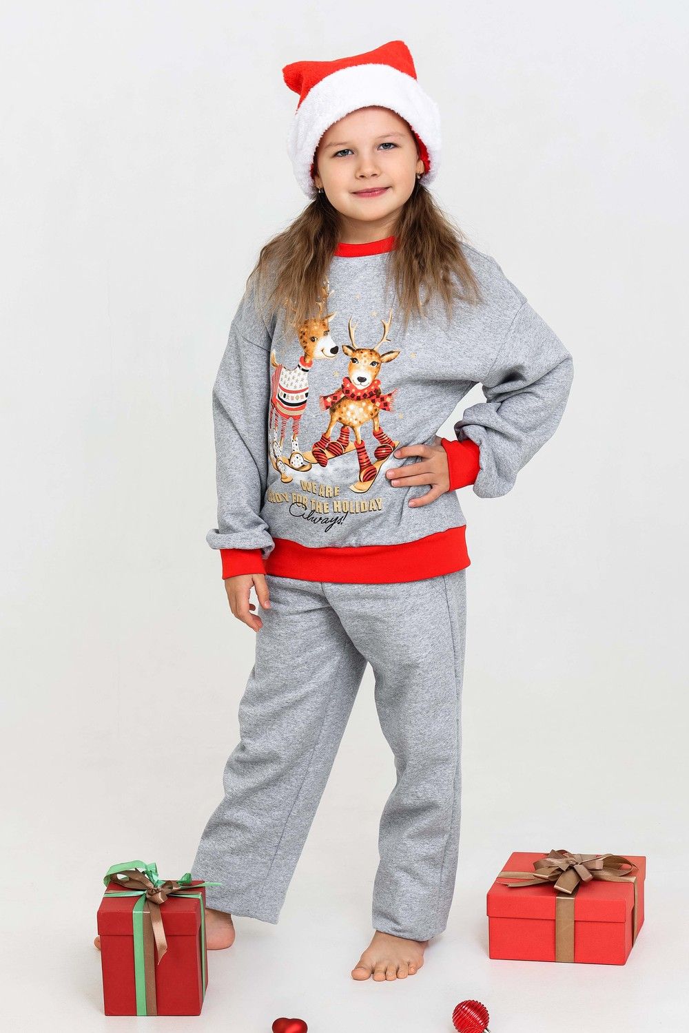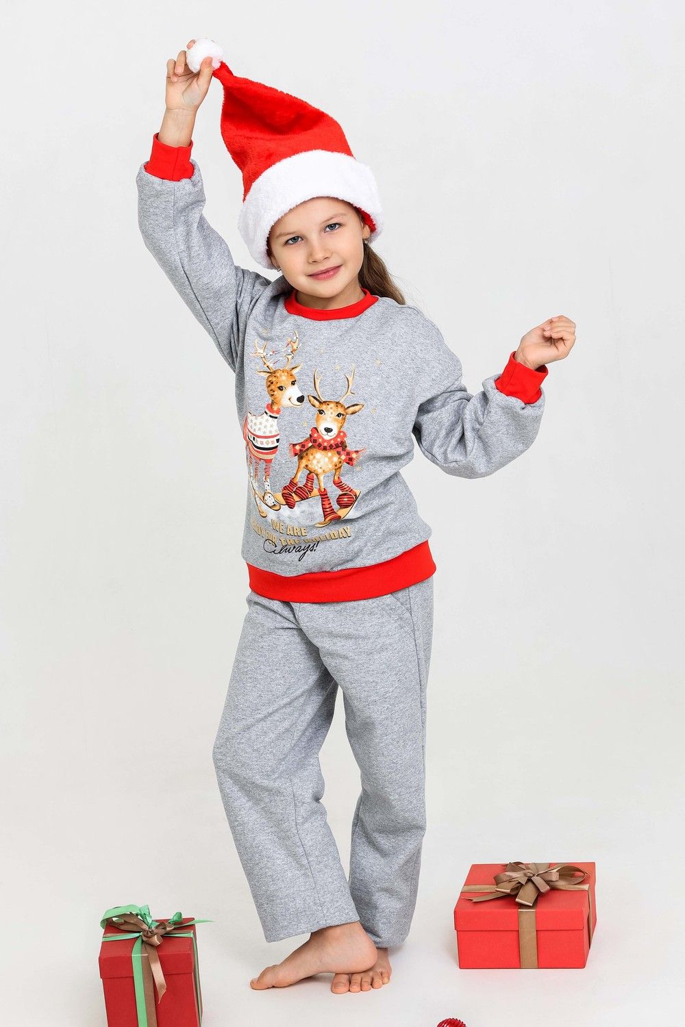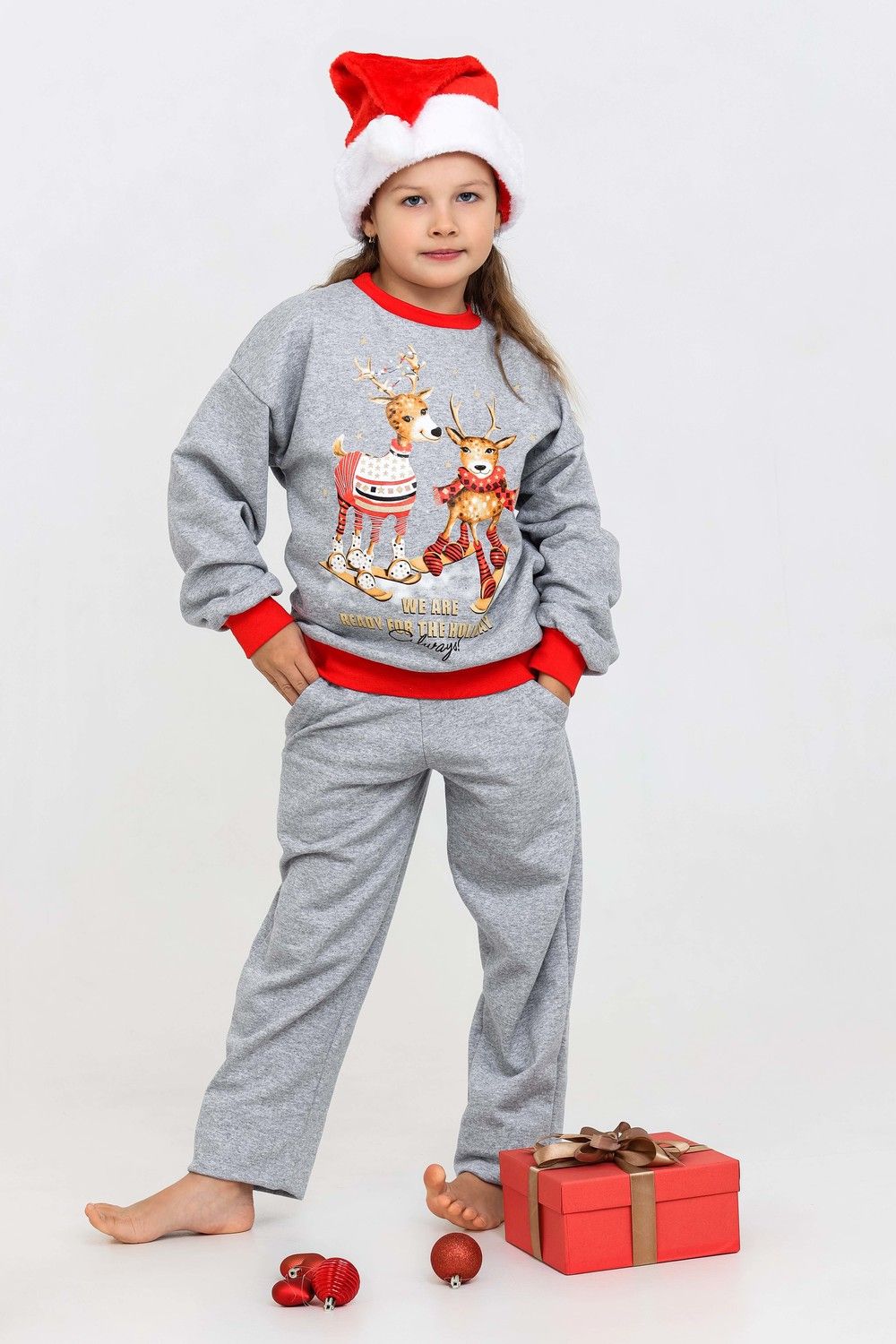 Костюм домашний для детей, подходит как для девочек, так и для мальчиков. На свободном свитшоте изображены весёлые олени, что создаёт атмосферу праздника. Брюки прямые, с боковыми карманами. Манжеты выполнены из плотной резинки - рибаны с лайкрой. Пояс на широкой резинке. Материал приятный к телу. В таком костюме можно встретить праздник, использовать в качестве подарка на Новый год или Рождество. А также в нём можно находиться в домашней обстановке для создания хорошего настроения.