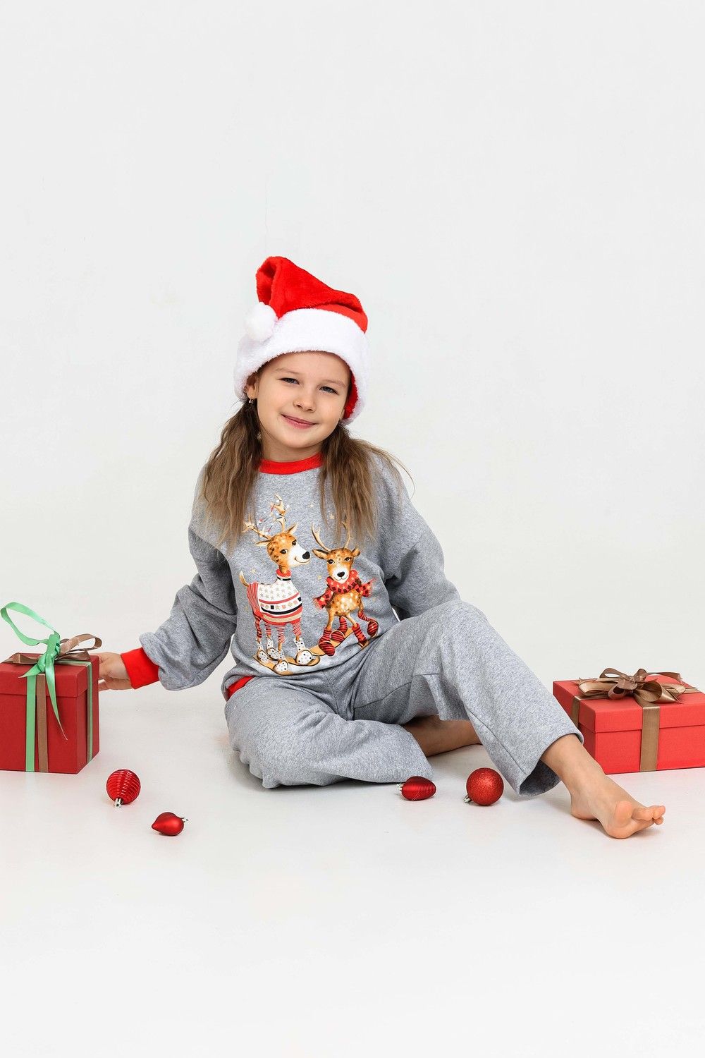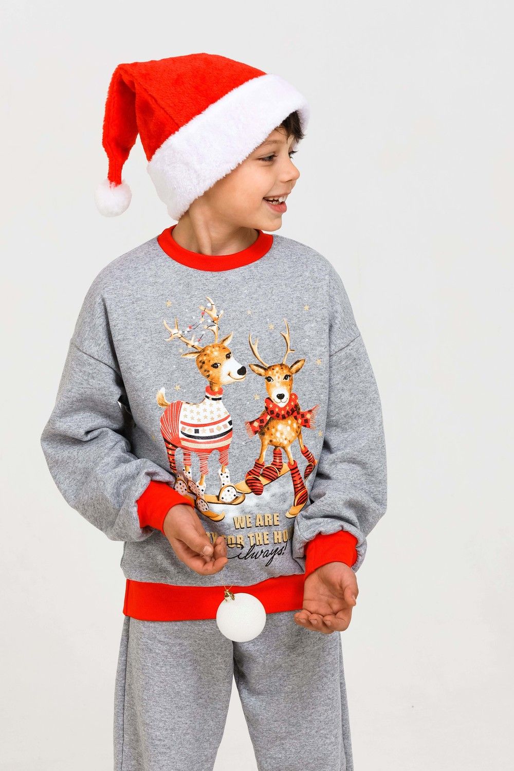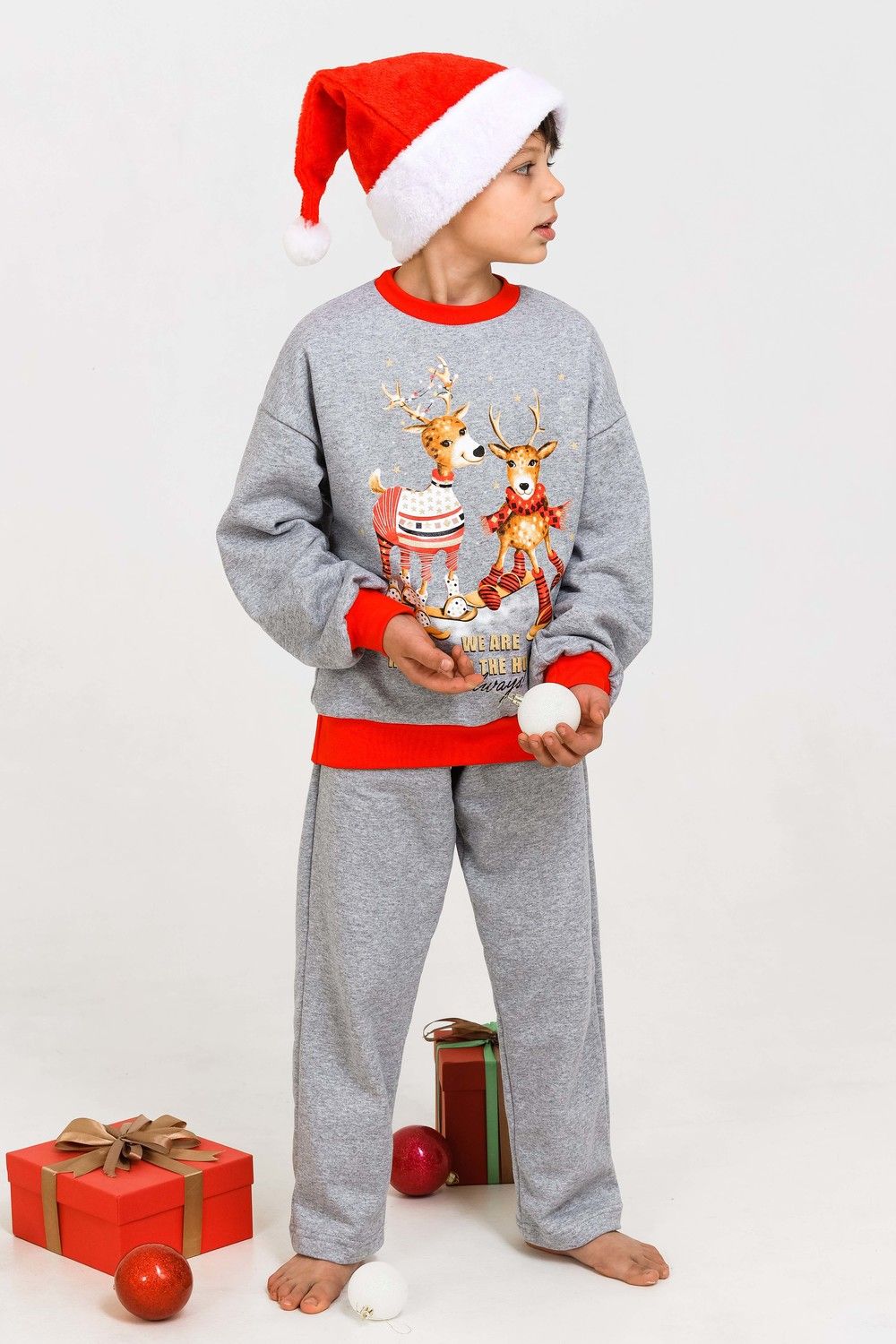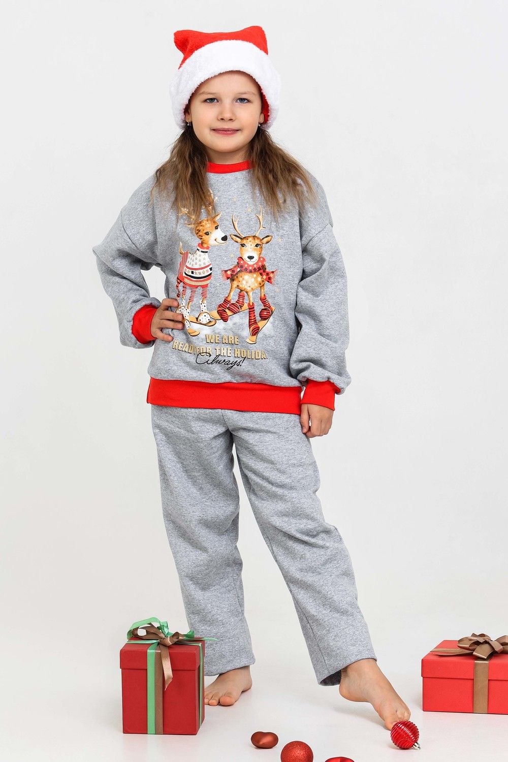 Костюм домашний для детей, подходит как для девочек, так и для мальчиков. На свободном свитшоте изображены весёлые олени, что создаёт атмосферу праздника. Брюки прямые, с боковыми карманами. Манжеты выполнены из плотной резинки - рибаны с лайкрой. Пояс на широкой резинке. Материал приятный к телу. В таком костюме можно встретить праздник, использовать в качестве подарка на Новый год или Рождество. А также в нём можно находиться в домашней обстановке для создания хорошего настроения.