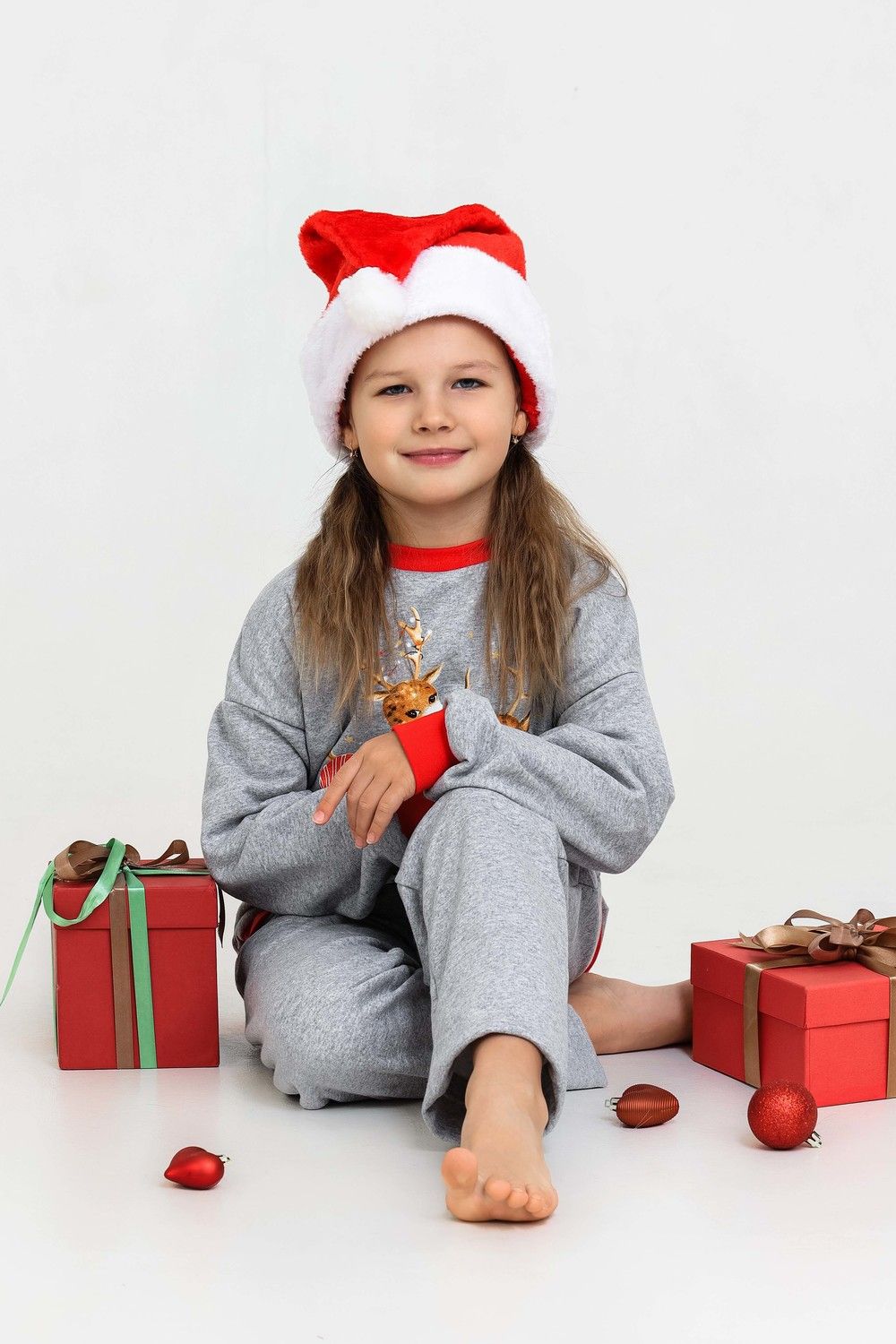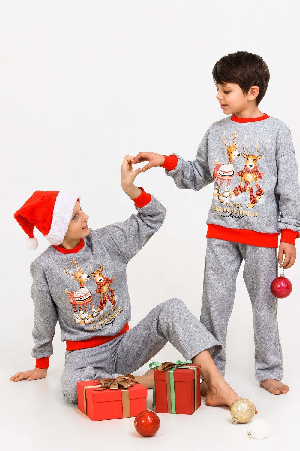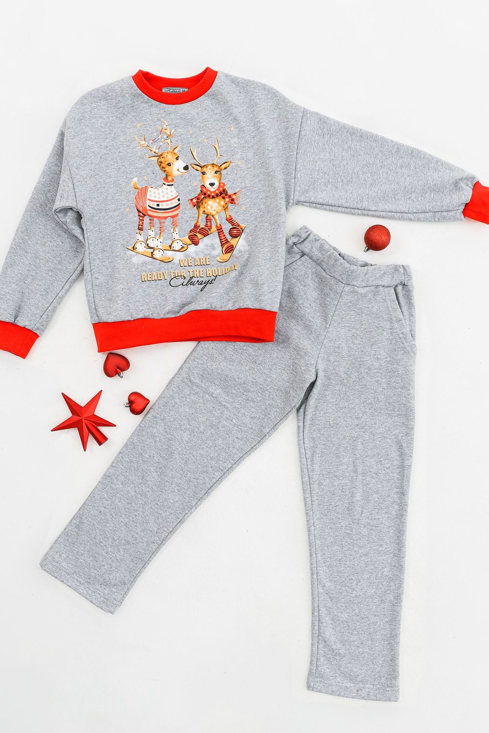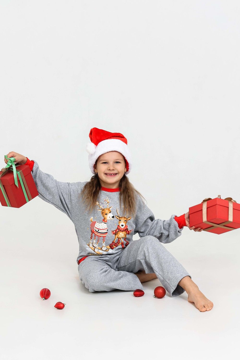 Костюм домашний для детей, подходит как для девочек, так и для мальчиков. На свободном свитшоте изображены весёлые олени, что создаёт атмосферу праздника. Брюки прямые, с боковыми карманами. Манжеты выполнены из плотной резинки - рибаны с лайкрой. Пояс на широкой резинке. Материал приятный к телу. В таком костюме можно встретить праздник, использовать в качестве подарка на Новый год или Рождество. А также в нём можно находиться в домашней обстановке для создания хорошего настроения.