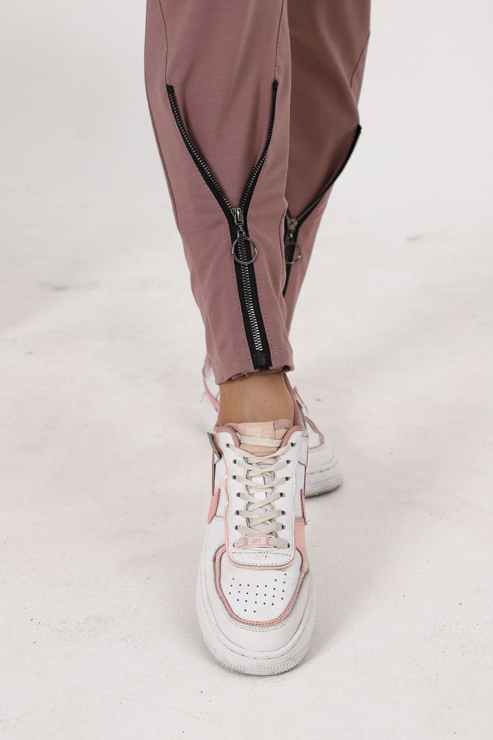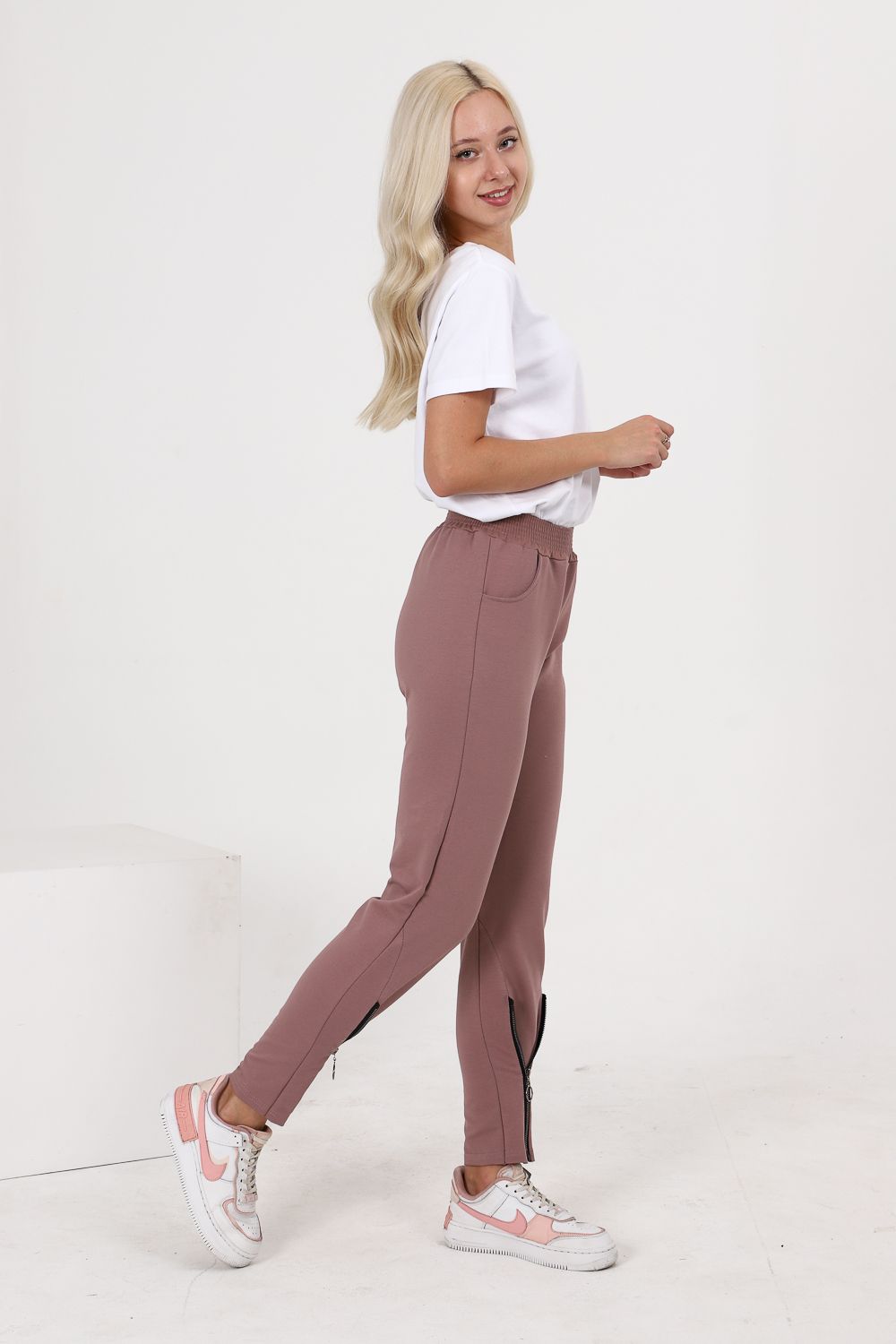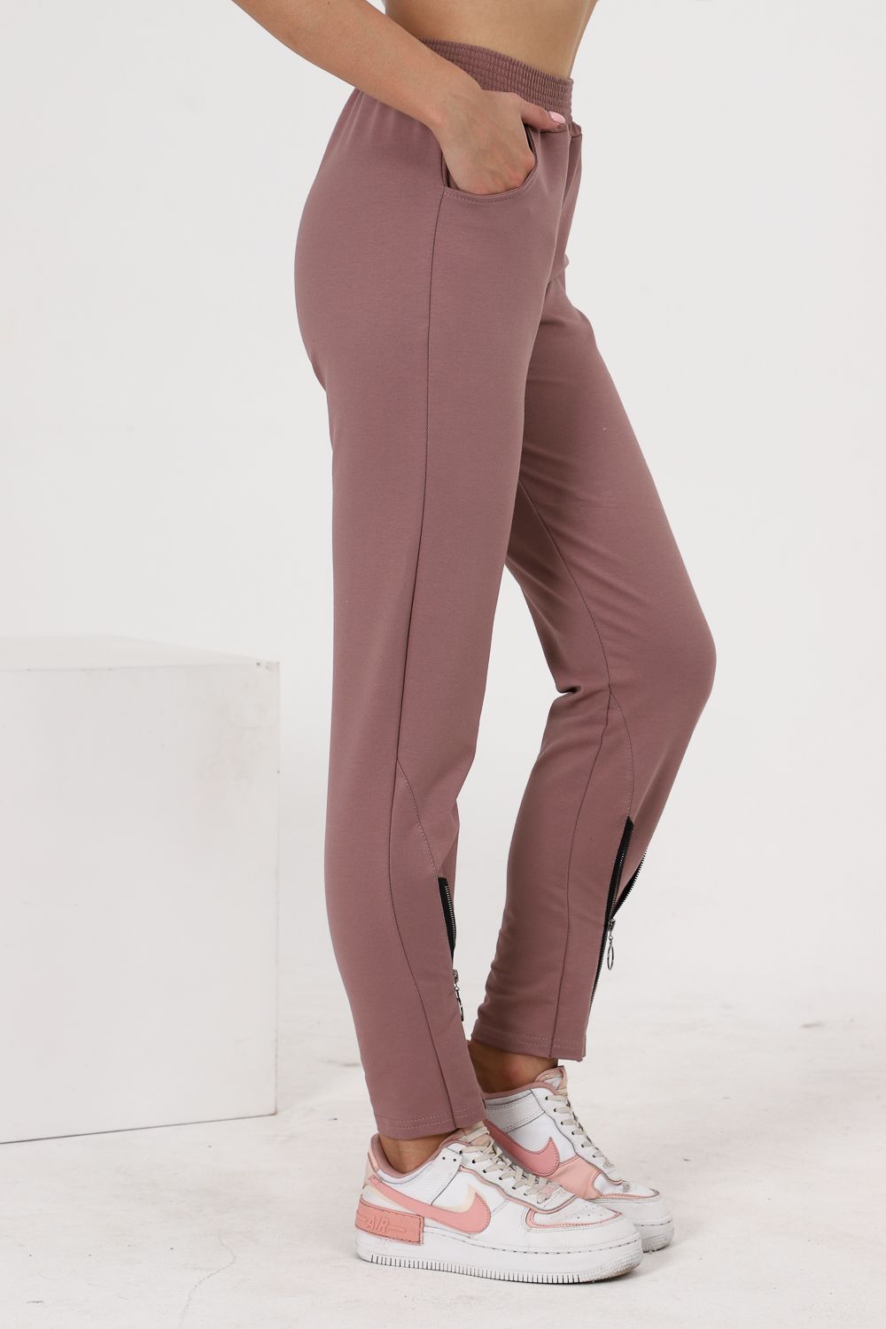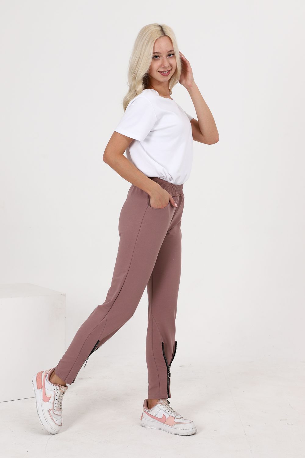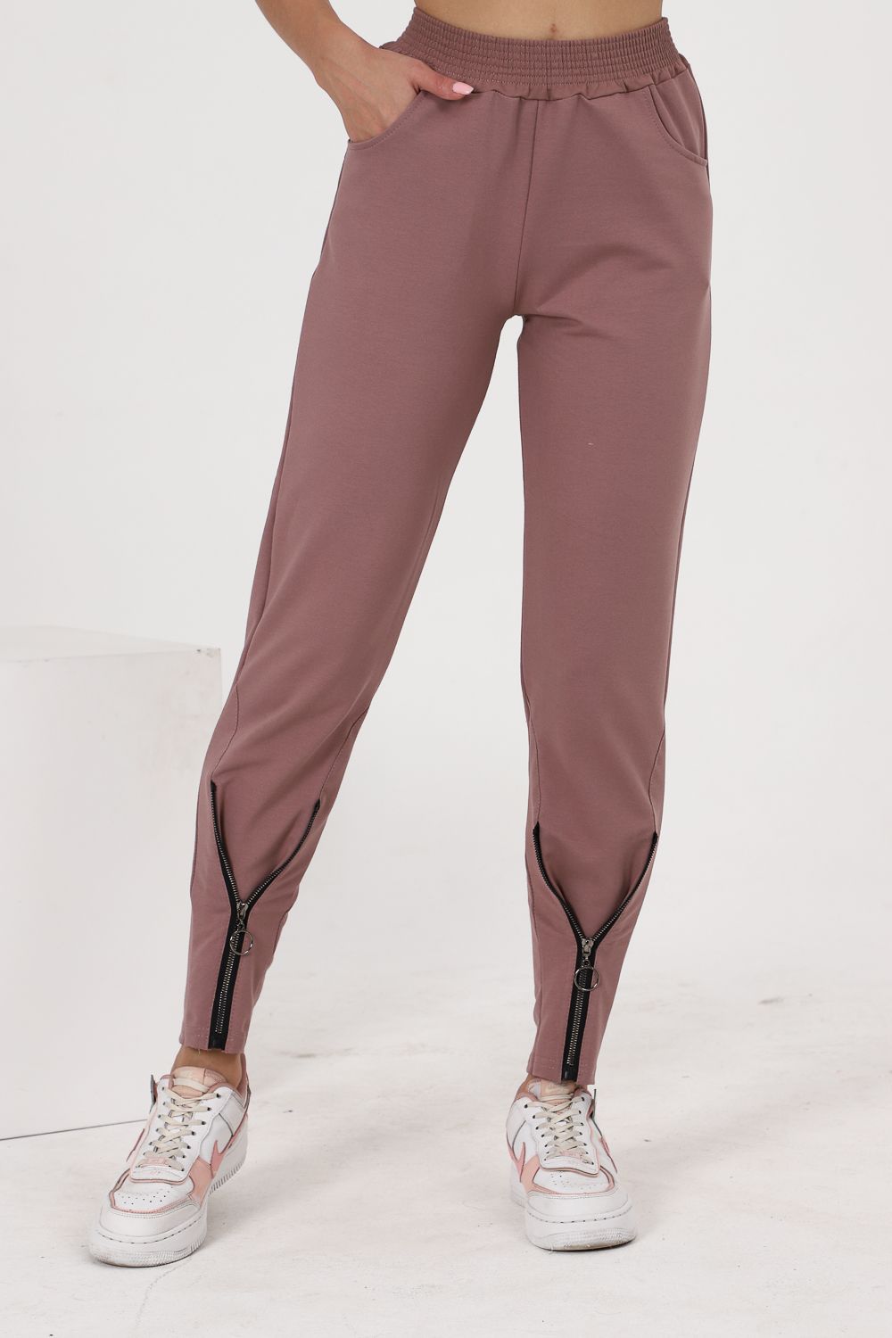 Брюки полуприлегающего силуэта, с боковыми карманами, на эластичном поясе. В нижней части передних половинок обработаны декоративные элементы с молниями.