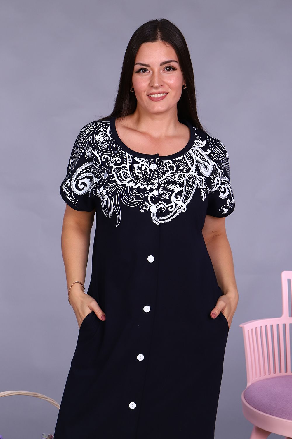 Халат женский из кулирного полотна, прямой силуэт, спущенное плечо, в боковых швах внутренние карманы, застежка на петли-пуговицы, низ изделия обработан на плоскошовной машине, на полочке принт. Благодаря натуральному составу вам будет комфортно и уютно. Халат выполнен по эксклюзивному лекалу. Это модель прекрасно подходит для дома, дачи, отдыха. Оригинальный принт выглядит модно и современно.
