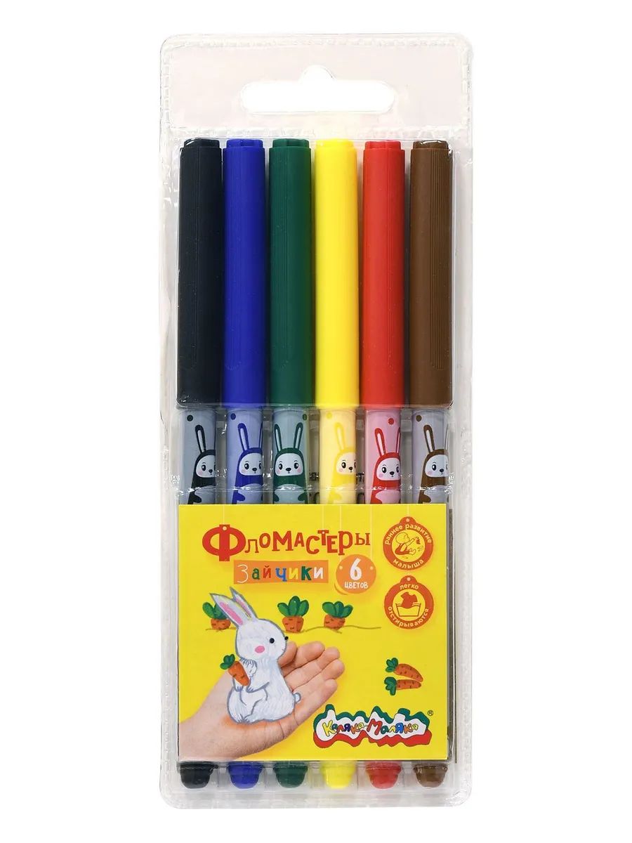 Фломастеры детские набор 6 цветов с милыми зайчиками Каляка-Маляка одни из самых ярких, долговечных и безопасных фломастеров на рынке. Разработаны для детей в возрасте от 3 лет. Весёлые зайчики на корпусе привлекут внимание ребенка и несомненно помогут увлечь его в мир творчества! С ними можно устраивать сюжетные игры. Фломастеры для малышей яркие Каляка-Маляка соответствуют самым высоким мировым стандартам качества и безопасности! Полипропиленовый корпус обладает повышенной устойчивостью к излому, не образует острых краев при повреждении. Безопасный вентилируемый колпачок обеспечит свободное прохождение воздуха при случайном попадании в дыхательные пути. Прочный пишущий узел не деформируется и не продавливается. Чернила на водной основе. Свежие следы фломастеров легко отстирываются с большинства тканей и смываются с кожи ребёнка!