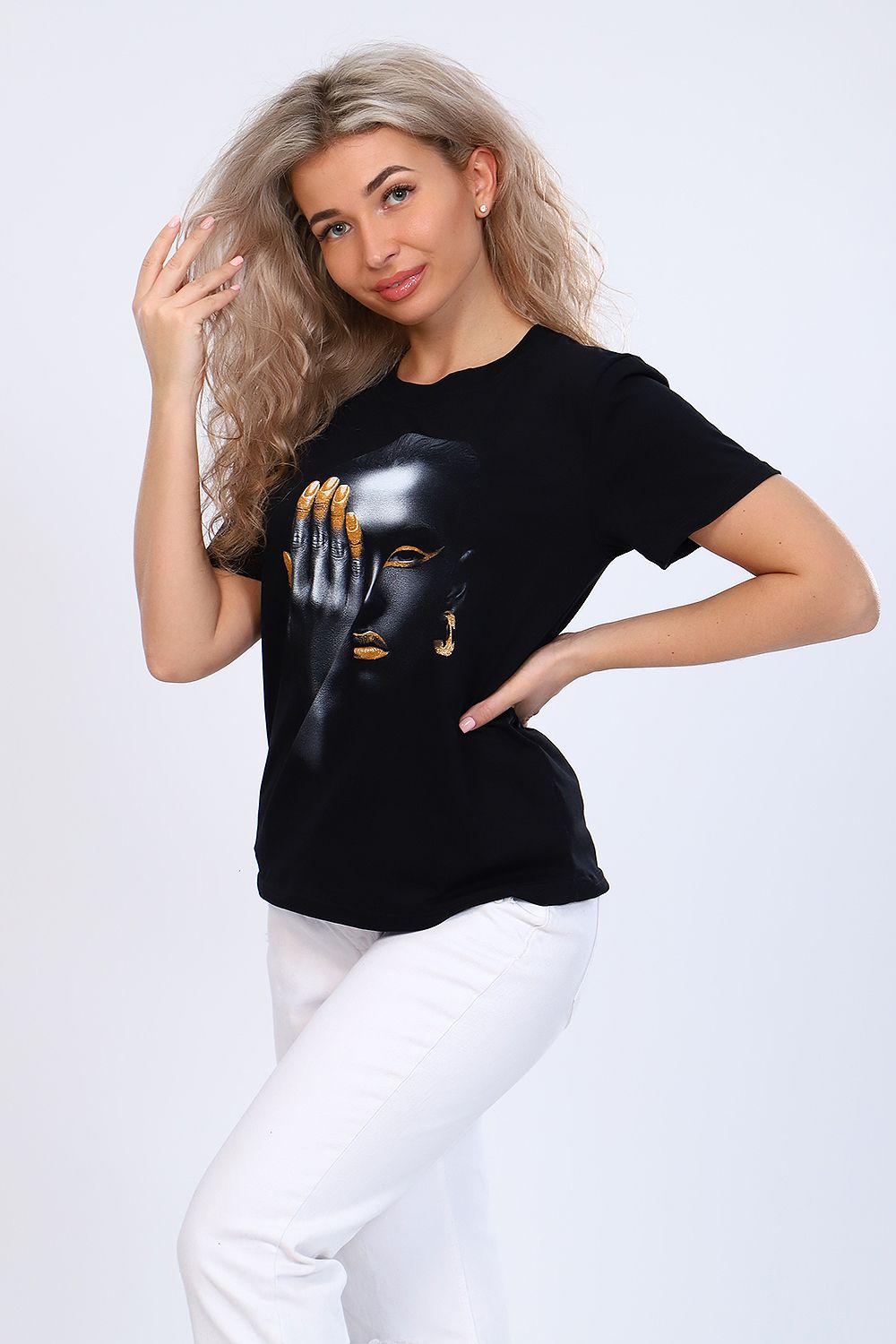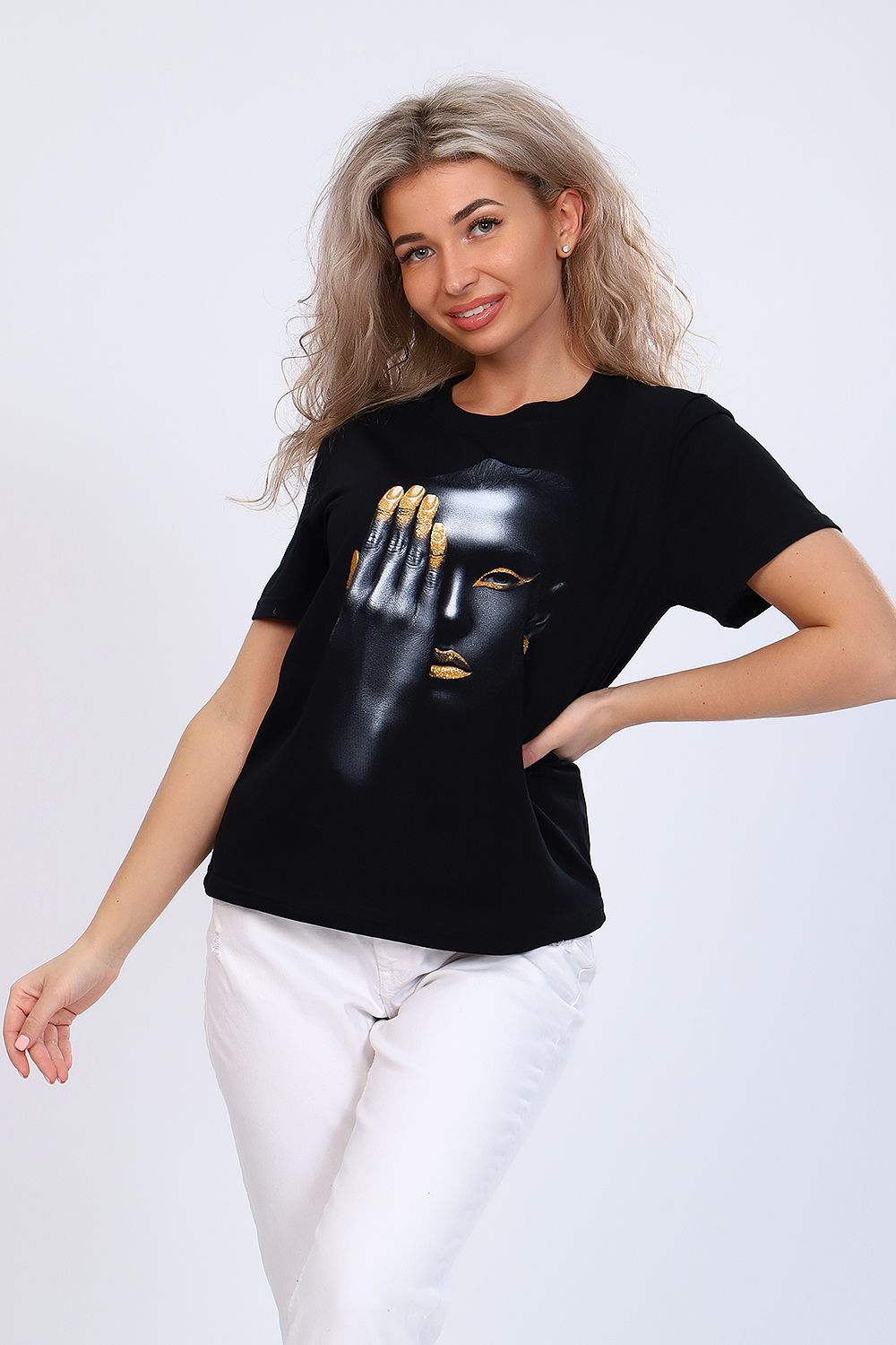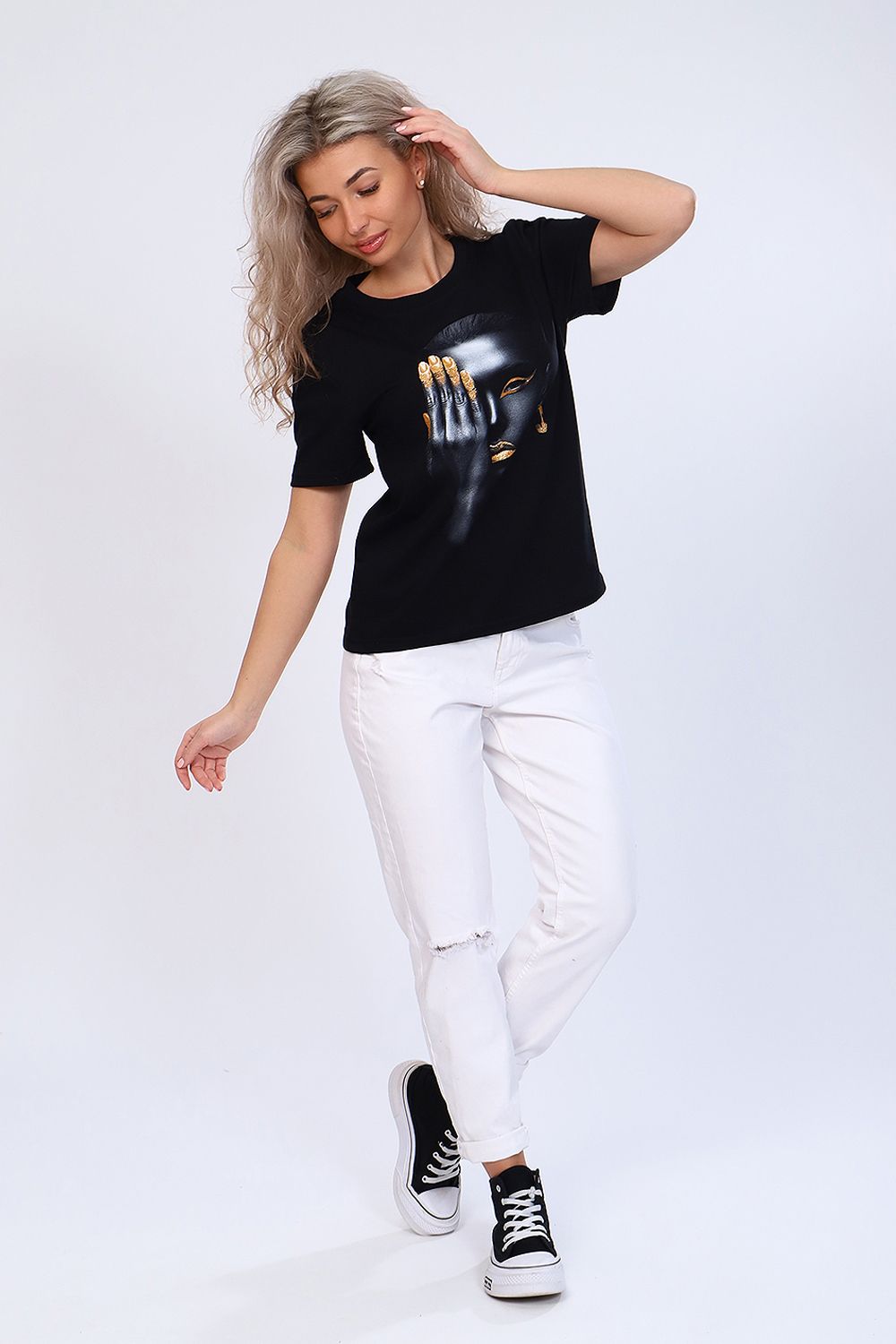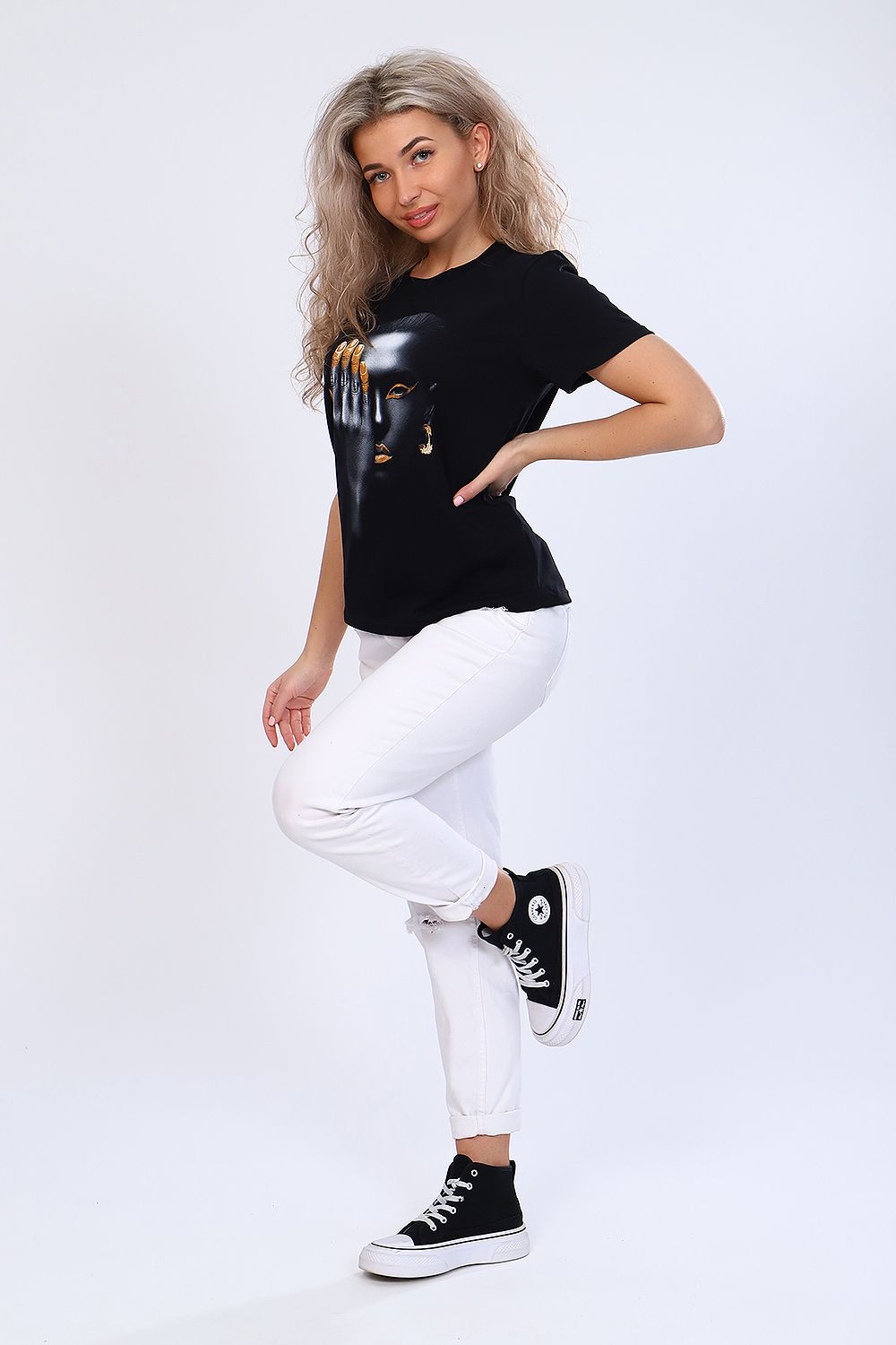 Футболка классического фасона, прямого кроя, с коротким рукавом и округлым вырезом. Декорирована принтом. Универсальная модель футболки отлично подойдет для любого образа и станет необходимой вещью в вашем гардеробе. Ткань кулирка пенье, плотность 160 г.