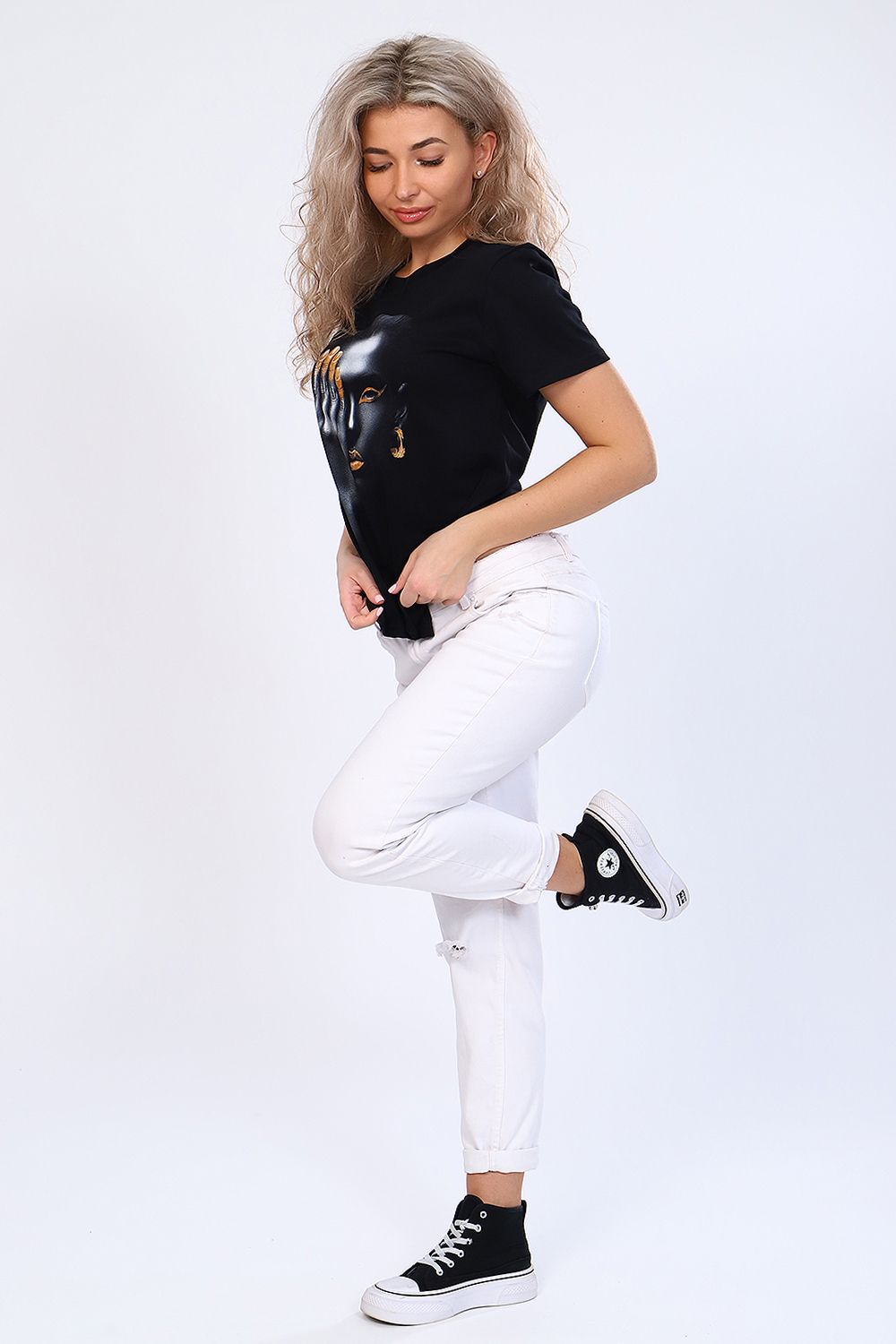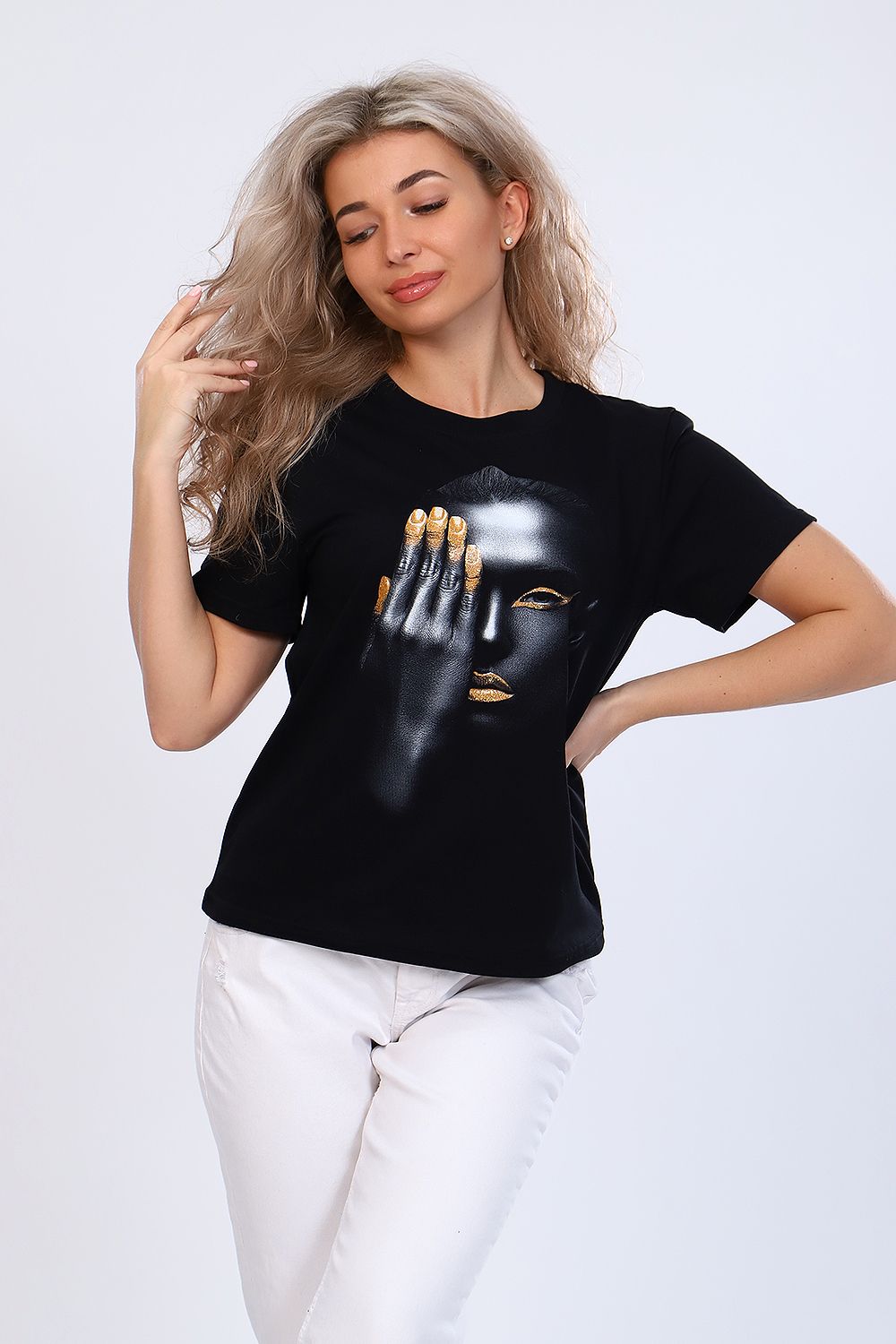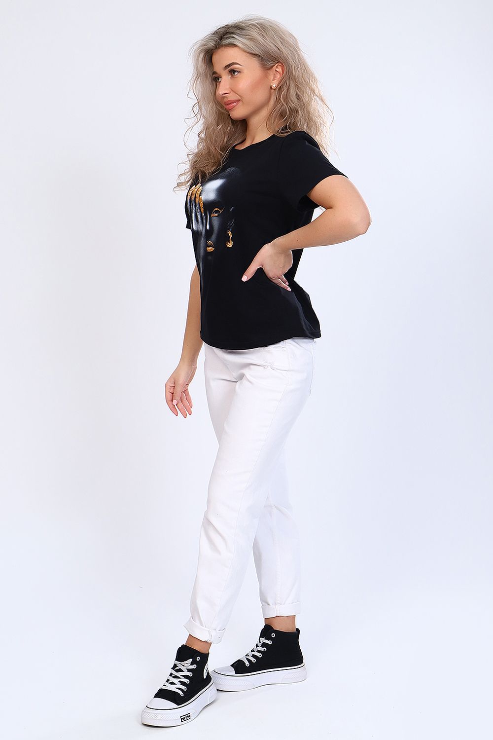 Футболка классического фасона, прямого кроя, с коротким рукавом и округлым вырезом. Декорирована принтом. Универсальная модель футболки отлично подойдет для любого образа и станет необходимой вещью в вашем гардеробе. Ткань кулирка пенье, плотность 160 г.