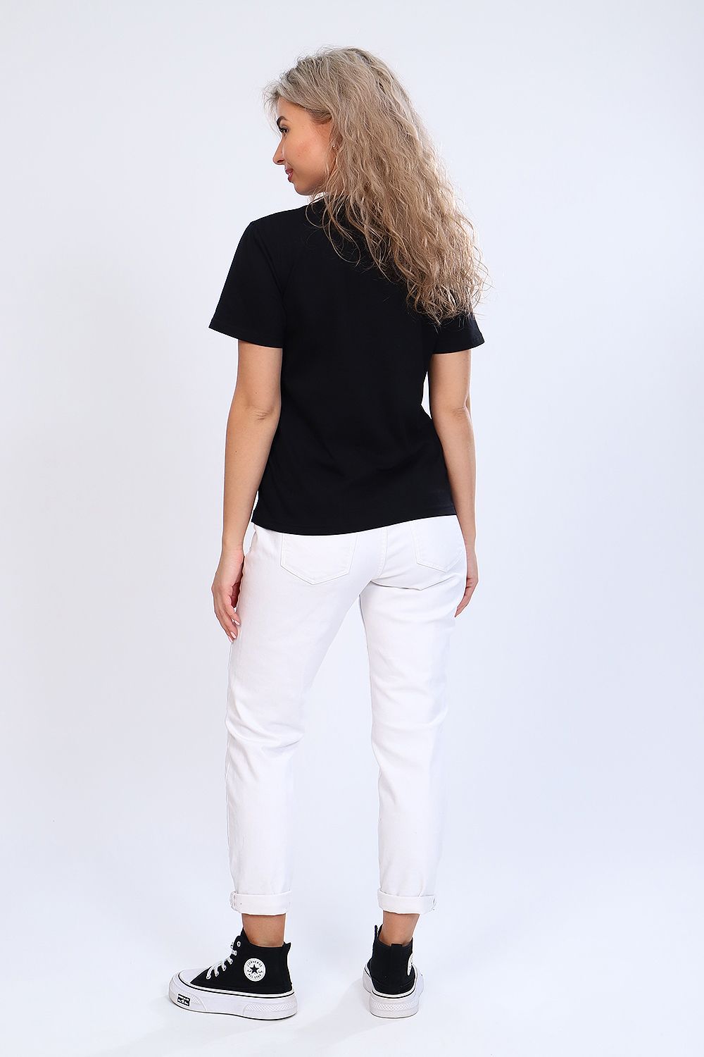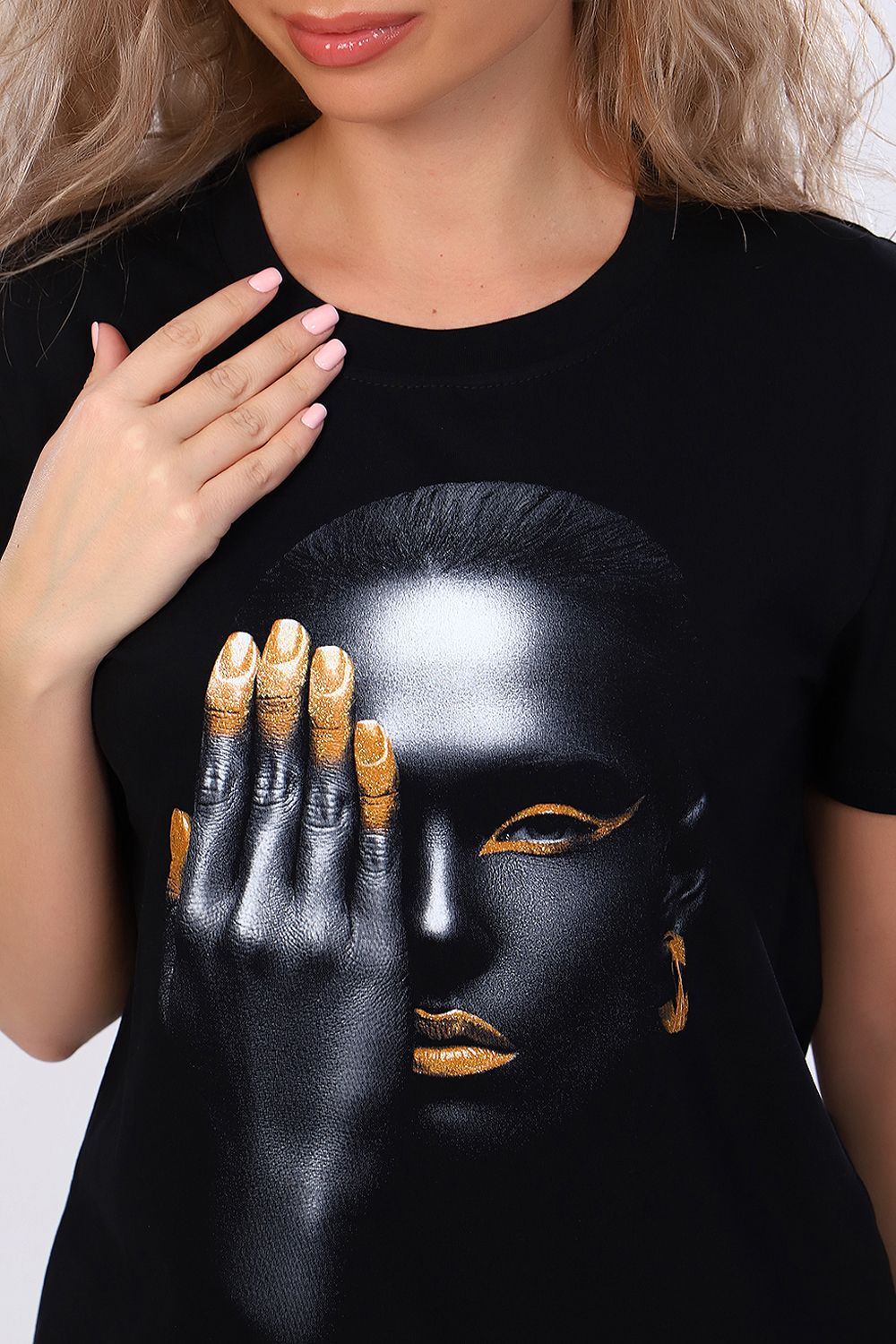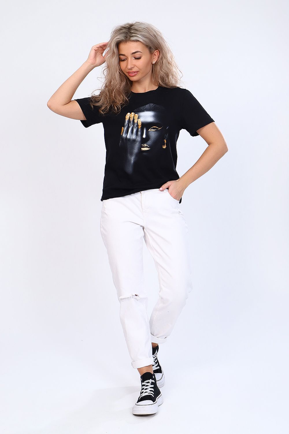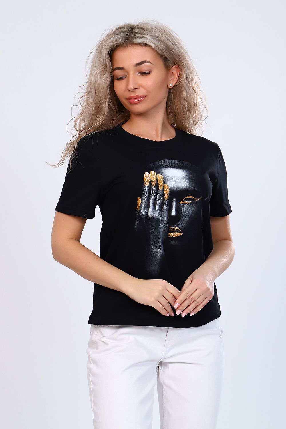 Футболка классического фасона, прямого кроя, с коротким рукавом и округлым вырезом. Декорирована принтом. Универсальная модель футболки отлично подойдет для любого образа и станет необходимой вещью в вашем гардеробе. Ткань кулирка пенье, плотность 160 г.
