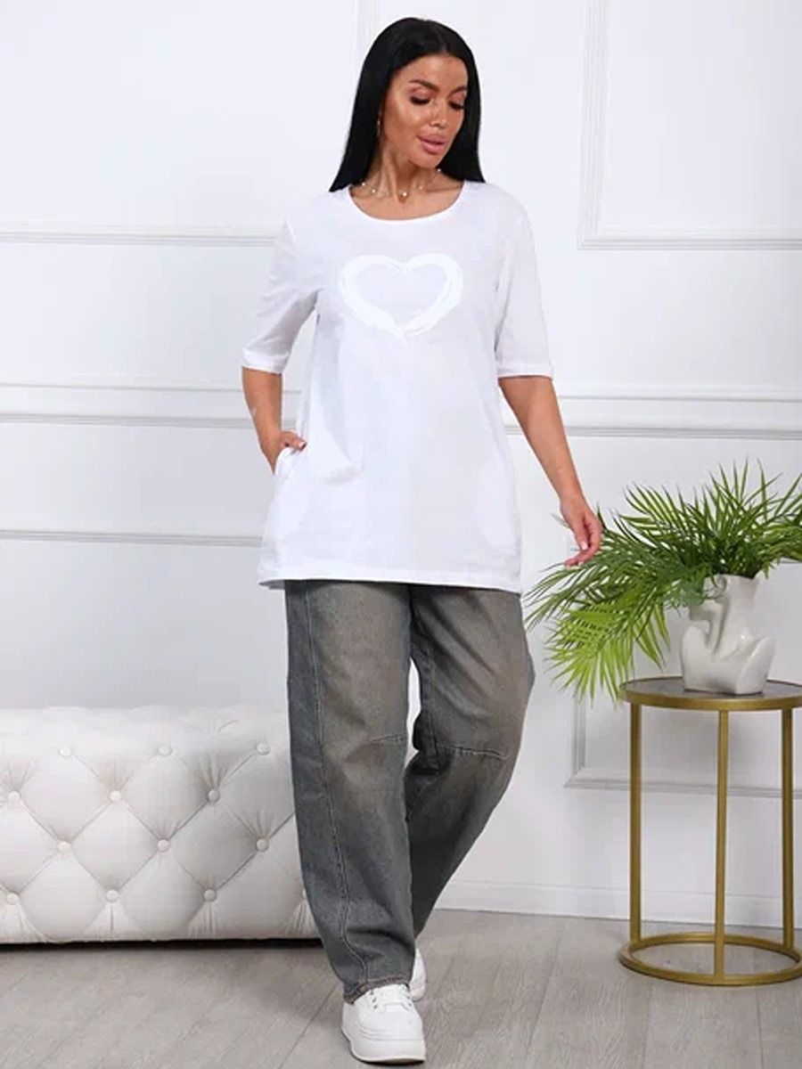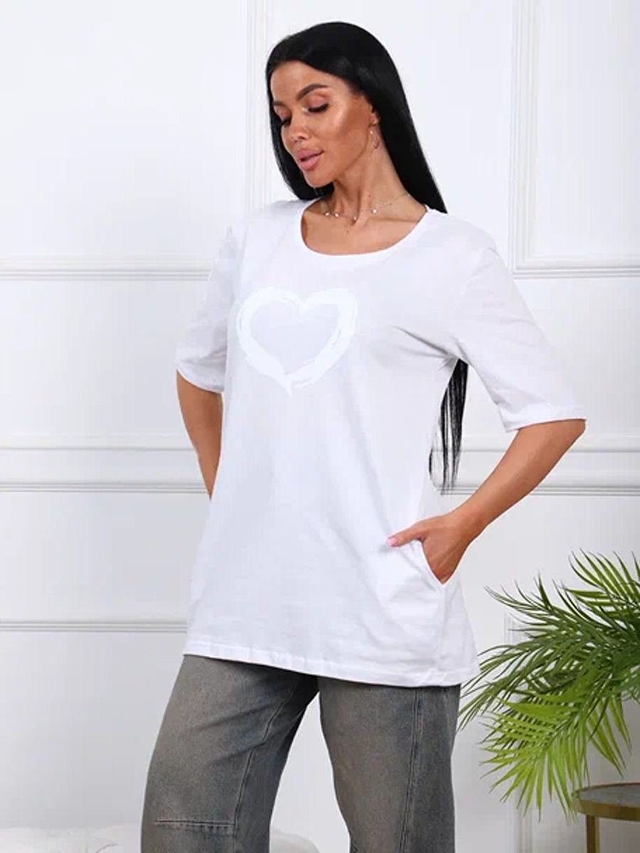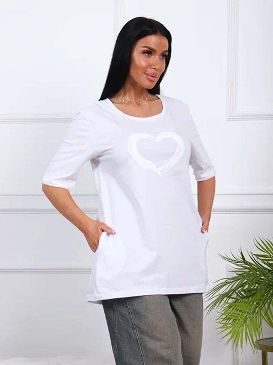 Футболка женская удлиненная с карманами и рисунком в виде сердца. Футболка с широким втачным рукавом, что делает его свободным и футболка не сковывает движений. Карманы на футболке очень практично и удобно, особенно, если носить ее с бриджима, леггинсами и велосипедками. Футболка свободного кроя из натурального дышащего хлопка - прекрасный базовый вариант одежды на любой сезон. Подходит в качестве домашней одежды, одежды на работу и для прогулок.