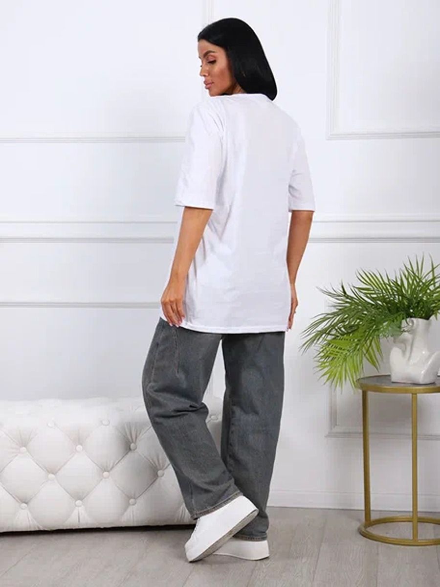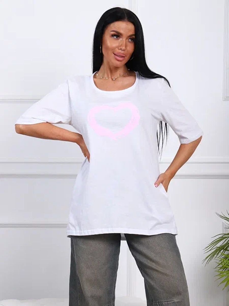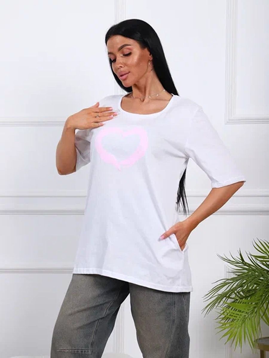 Футболка женская удлиненная с карманами и рисунком в виде сердца. Футболка с широким втачным рукавом, что делает его свободным и футболка не сковывает движений. Карманы на футболке очень практично и удобно, особенно, если носить ее с бриджима, леггинсами и велосипедками. Футболка свободного кроя из натурального дышащего хлопка - прекрасный базовый вариант одежды на любой сезон. Подходит в качестве домашней одежды, одежды на работу и для прогулок.
