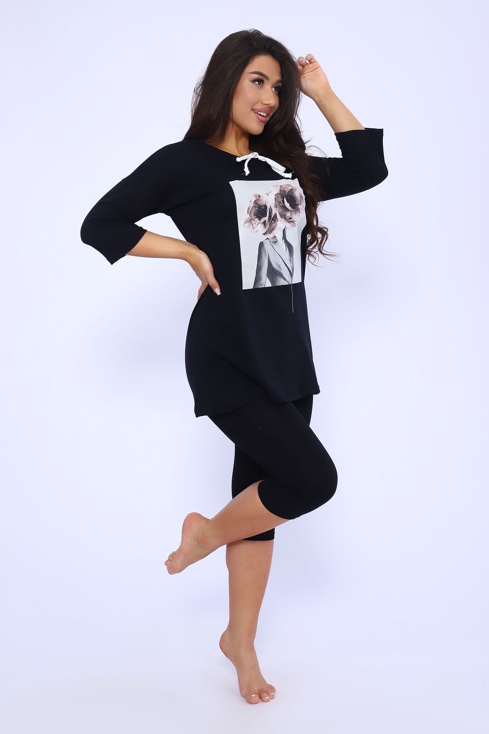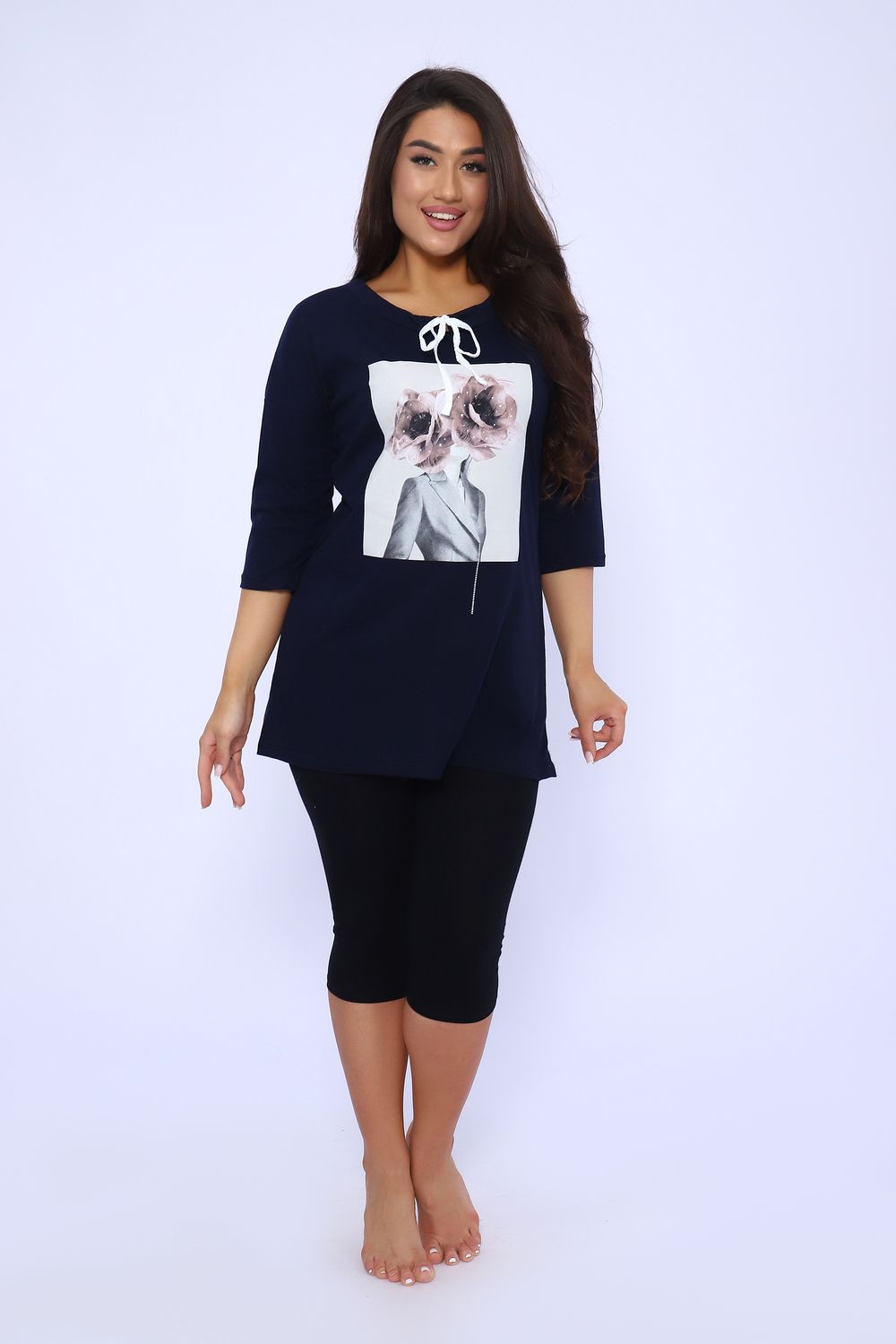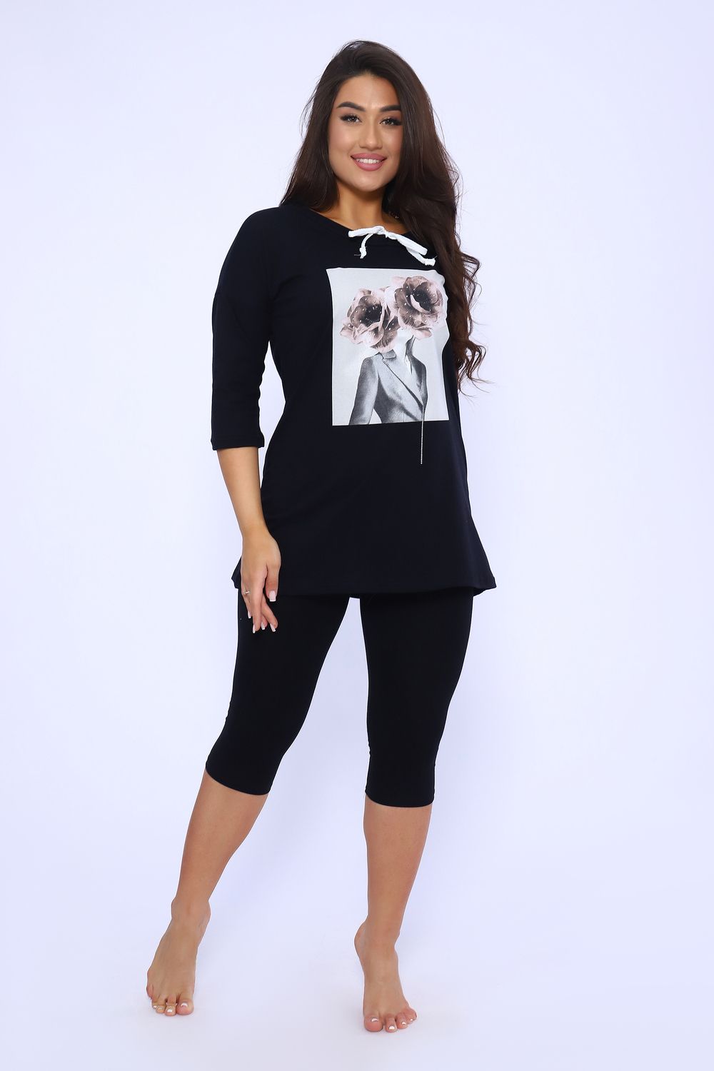 Футболка женская удлиненная прямого силуэта из кулирки 100% хлопок качества пенье. Спереди оригинальный принт, рукав спущенный 3/4, горловина обработана обтачкой, затягивается шнурком. Футболка идеально подойдет как для дома, так и для прогулок и отдыха.