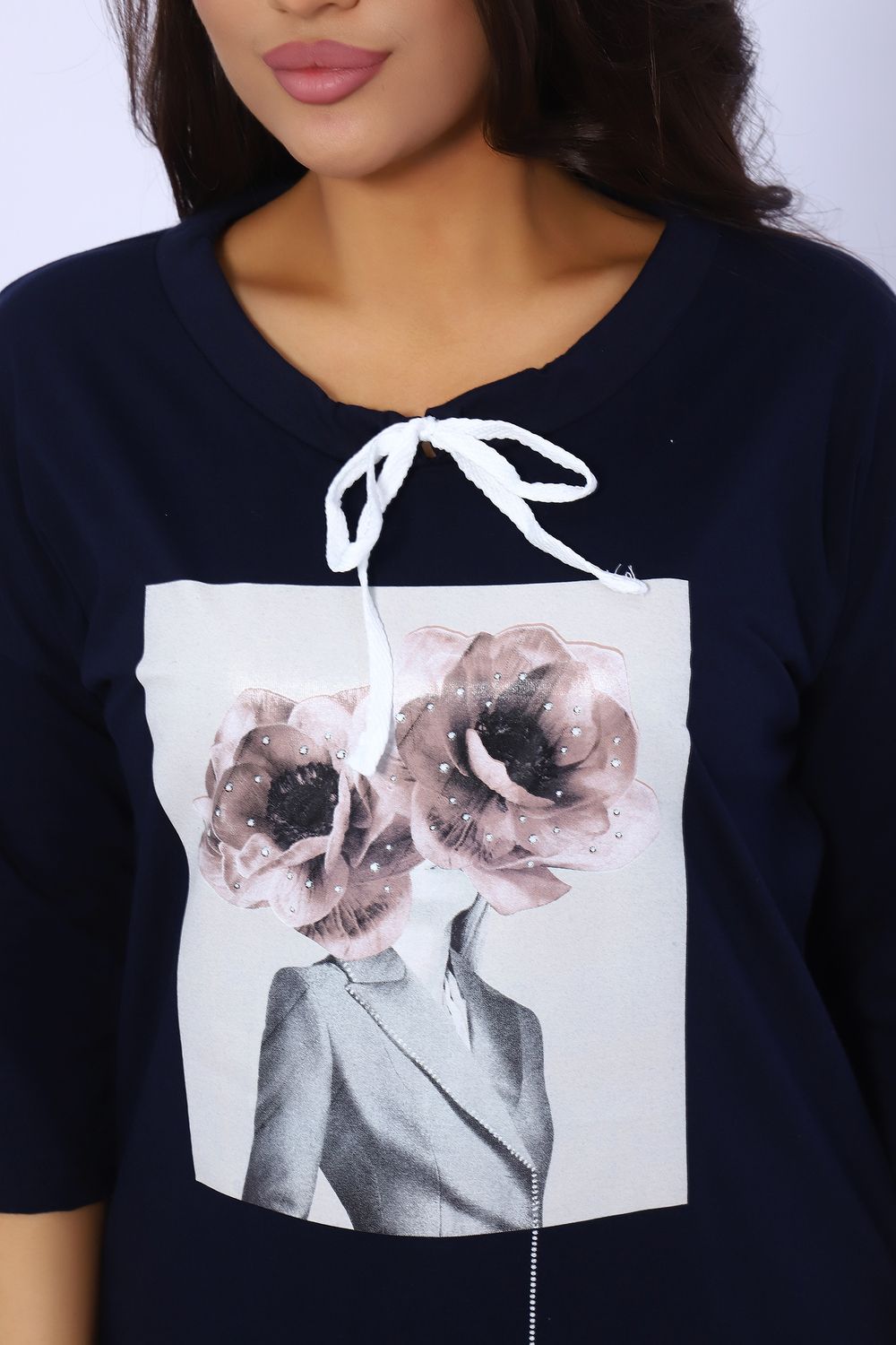 Футболка женская удлиненная прямого силуэта из кулирки 100% хлопок качества пенье. Спереди оригинальный принт, рукав спущенный 3/4, горловина обработана обтачкой, затягивается шнурком. Футболка идеально подойдет как для дома, так и для прогулок и отдыха.