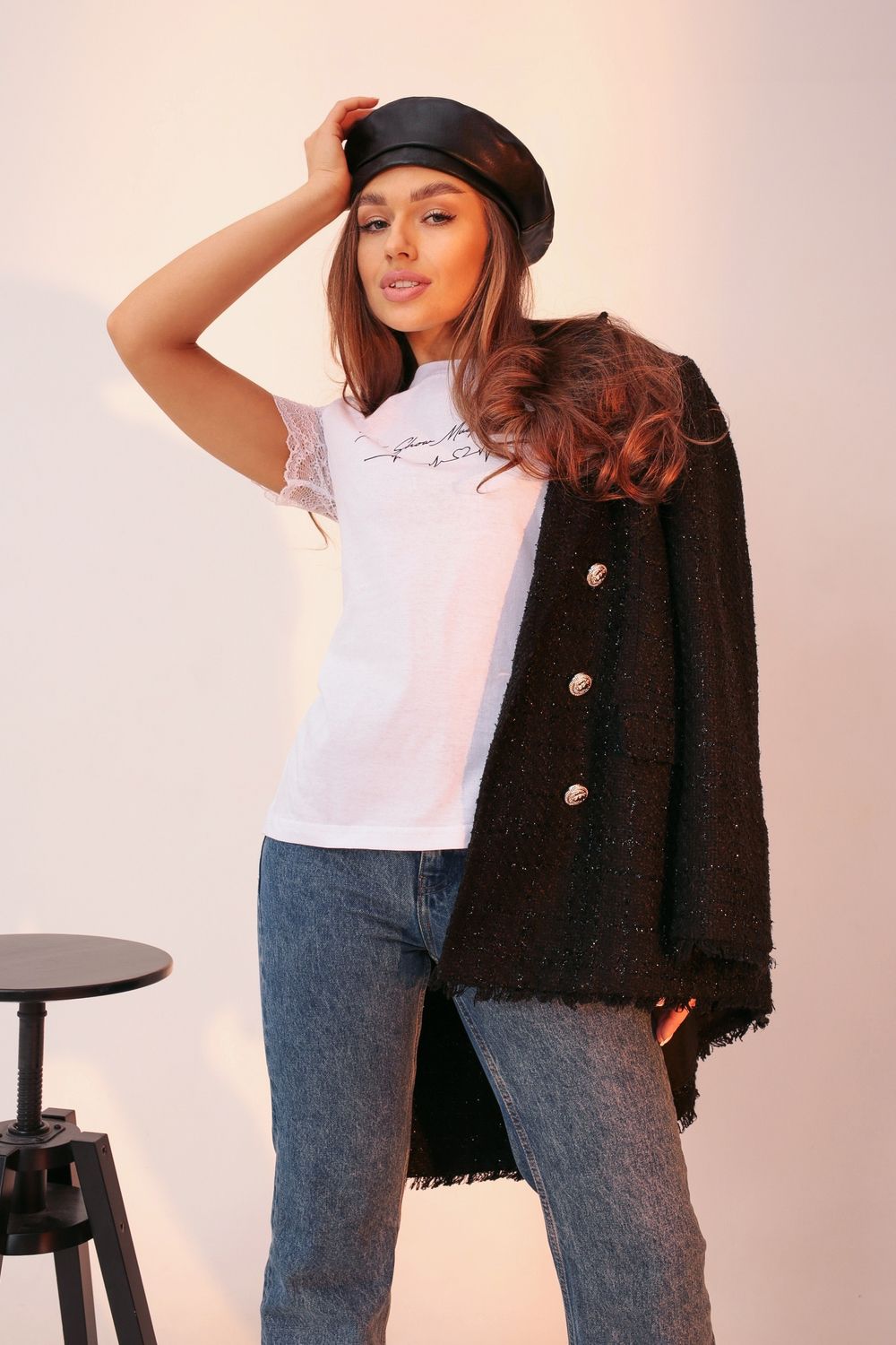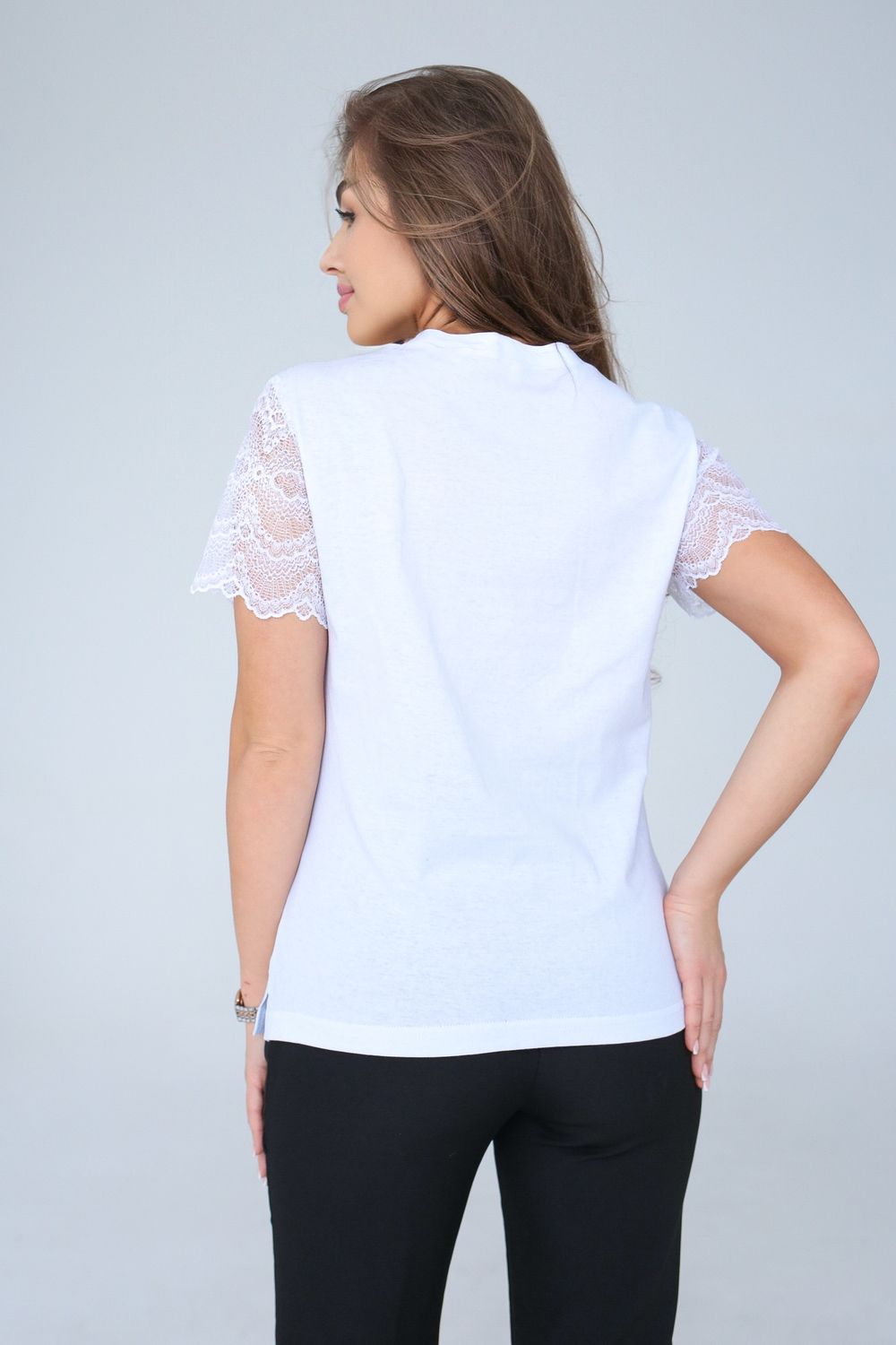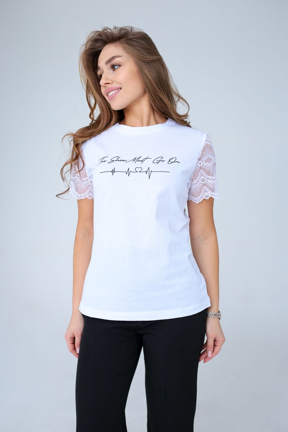 Просторная женская футболка из хлопка для тех, кто любит ощущать свободу во всём. Заботливо сшитая их нежнейшего эластичного трикотажа с кружевными рукавами, она не стесняет движений, тем самым добавляя нотку расслабленного шика. Лаконичный дизайн футболки с кружевом, подойдет для повседневной носки в качестве одежды для дома, сна, отдыха и на прогулку.