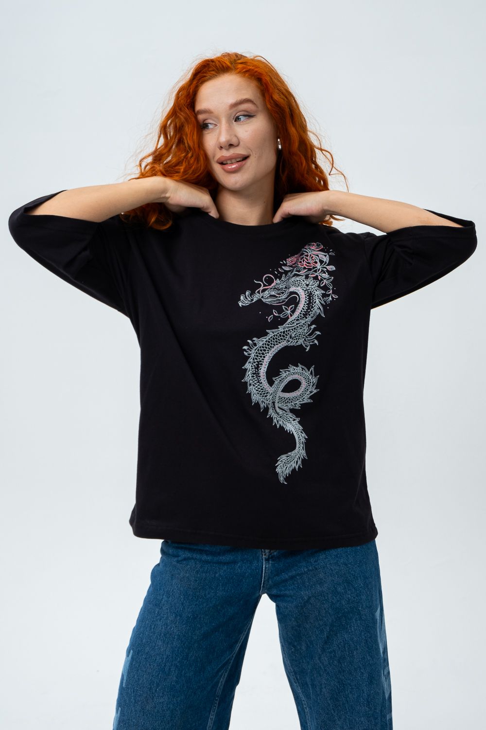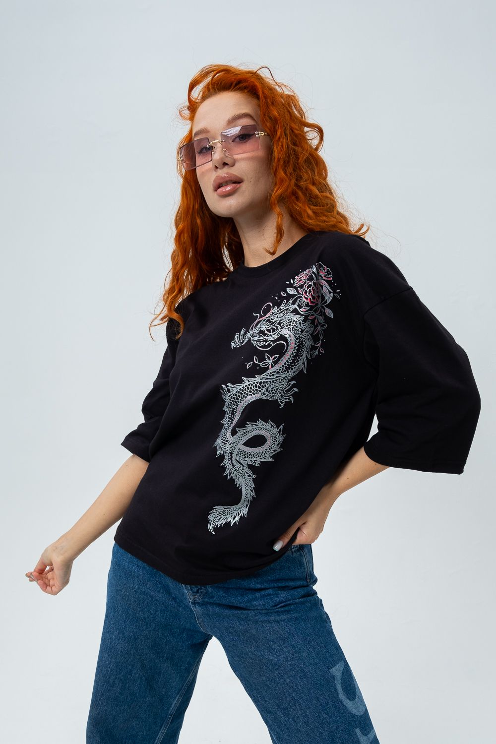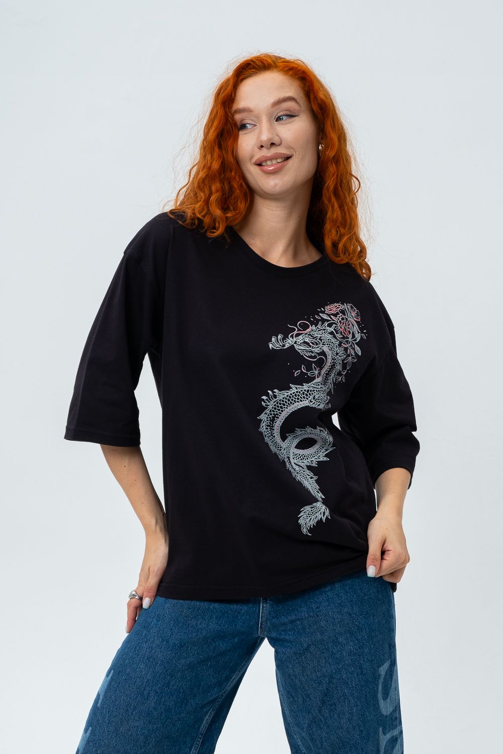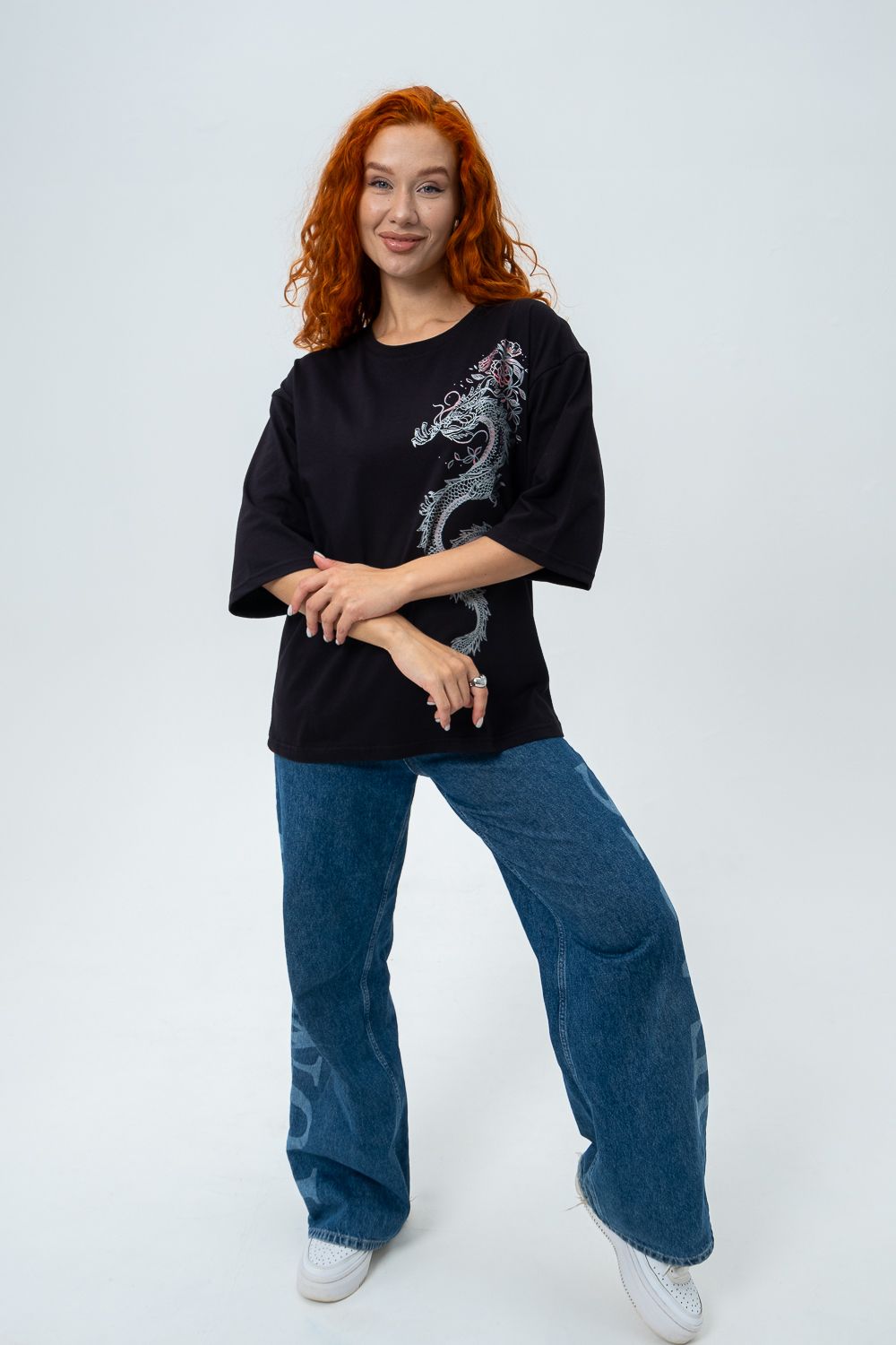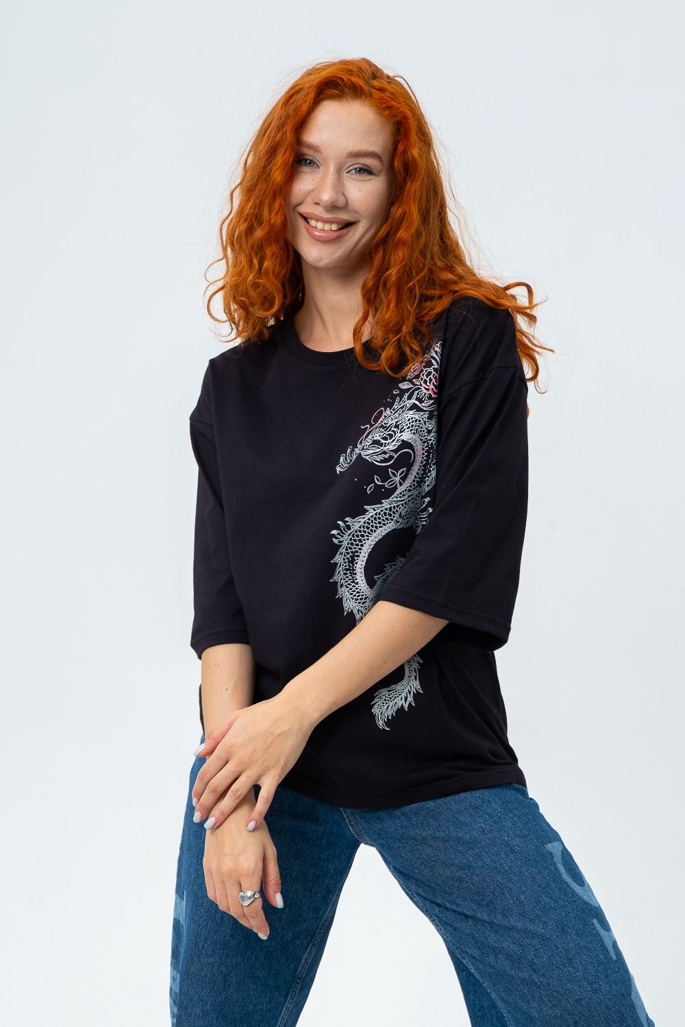Женская футболка прямого свободного кроя, очень удобная, лёгкая и стильная. Длина рукава немного ниже локтя. Эффектно смотрится и подходит на каждый день. Изделие изготовлено из высококачественного хлопка пенье. Длина рукава указана в измерениях от точки основания шеи.