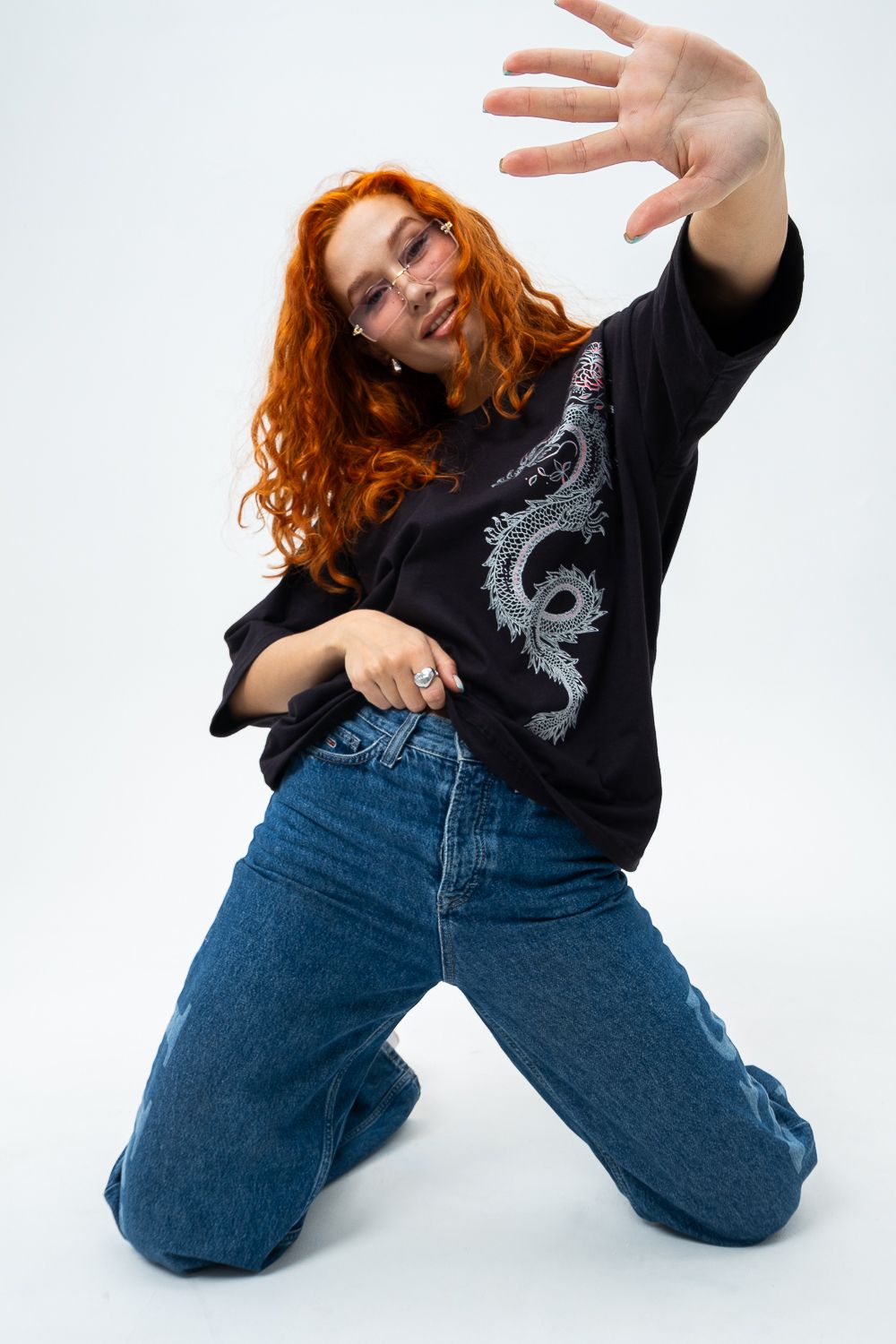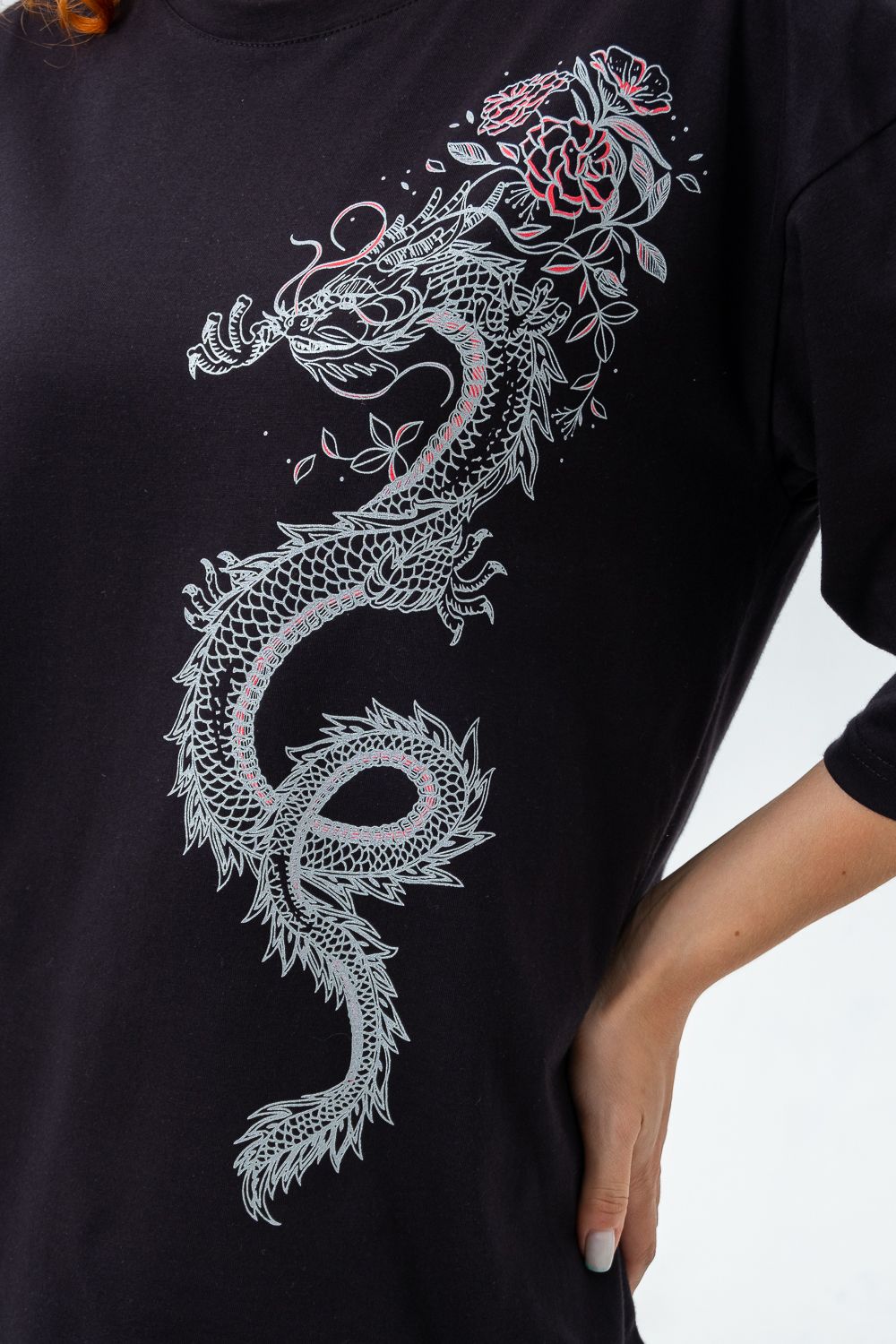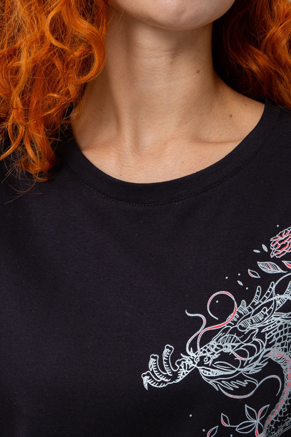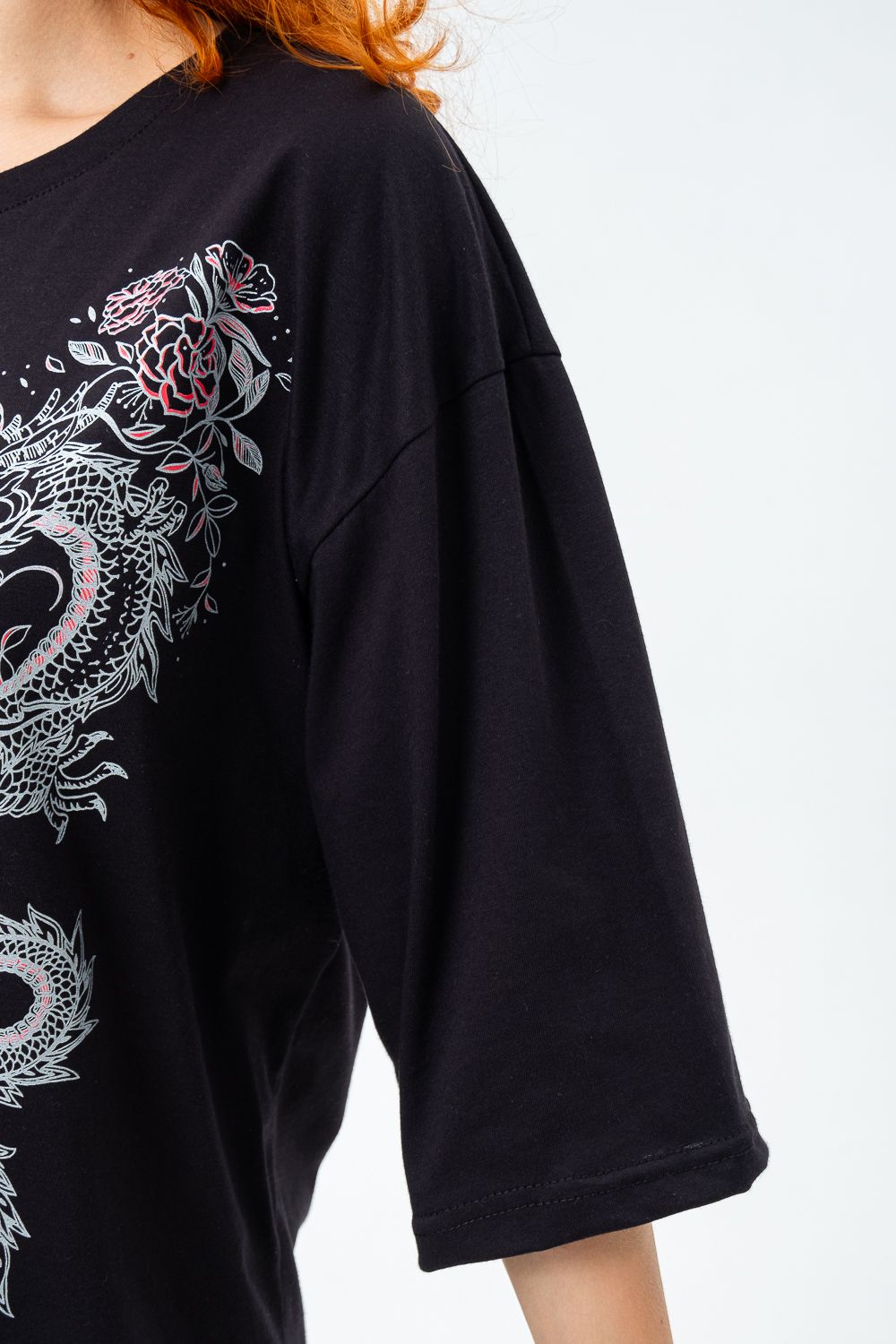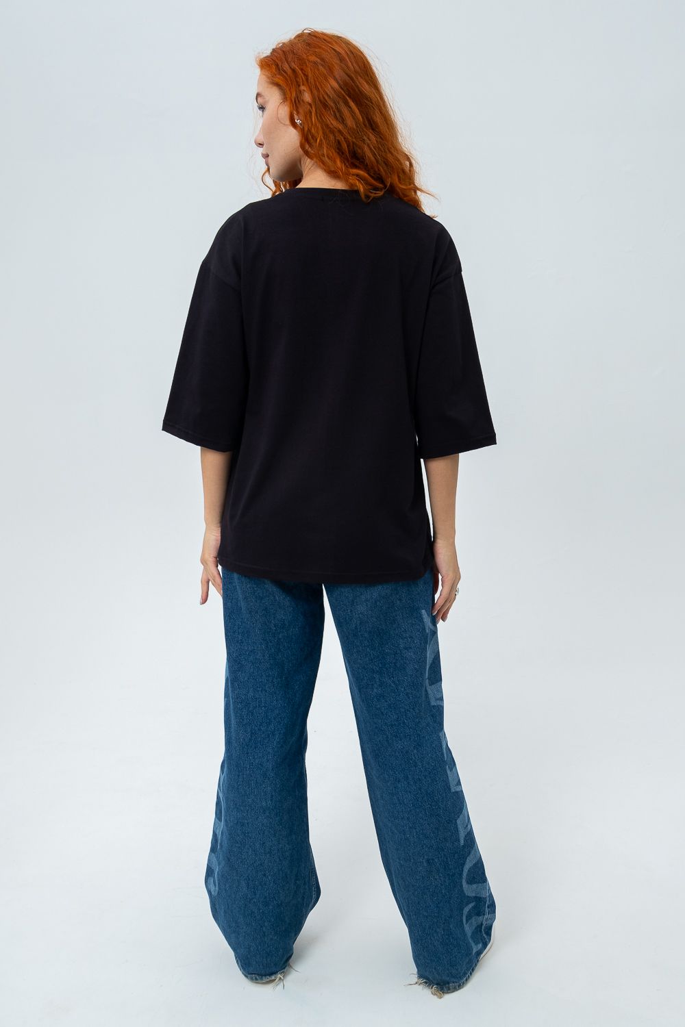 Женская футболка прямого свободного кроя, очень удобная, лёгкая и стильная. Длина рукава немного ниже локтя. Эффектно смотрится и подходит на каждый день. Изделие изготовлено из высококачественного хлопка пенье. Длина рукава указана в измерениях от точки основания шеи.