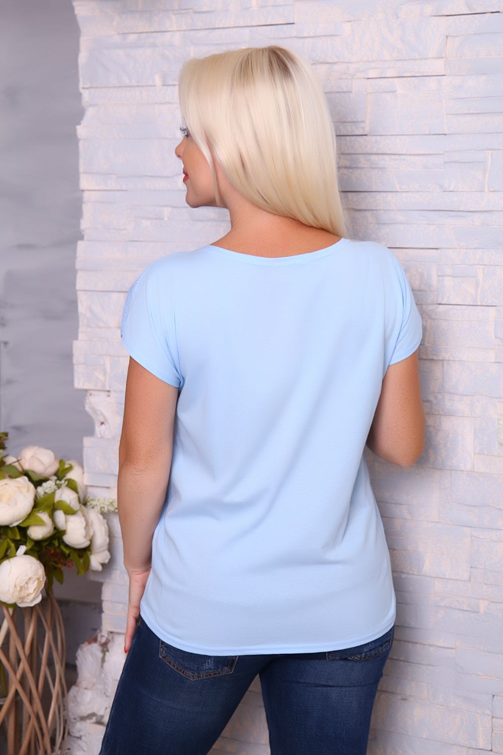 Футболка женская с принтом, комбинированная из кулирки и ажурного трикотажа. Модель прямого покроя, спущенная пройма, округлая горловина, ажурная кокетка на груди придаёт футболке некую изюминку. Низ спинки слегка удлинён и закруглён. Футболка лёгкая, комфортная, приятная к телу.