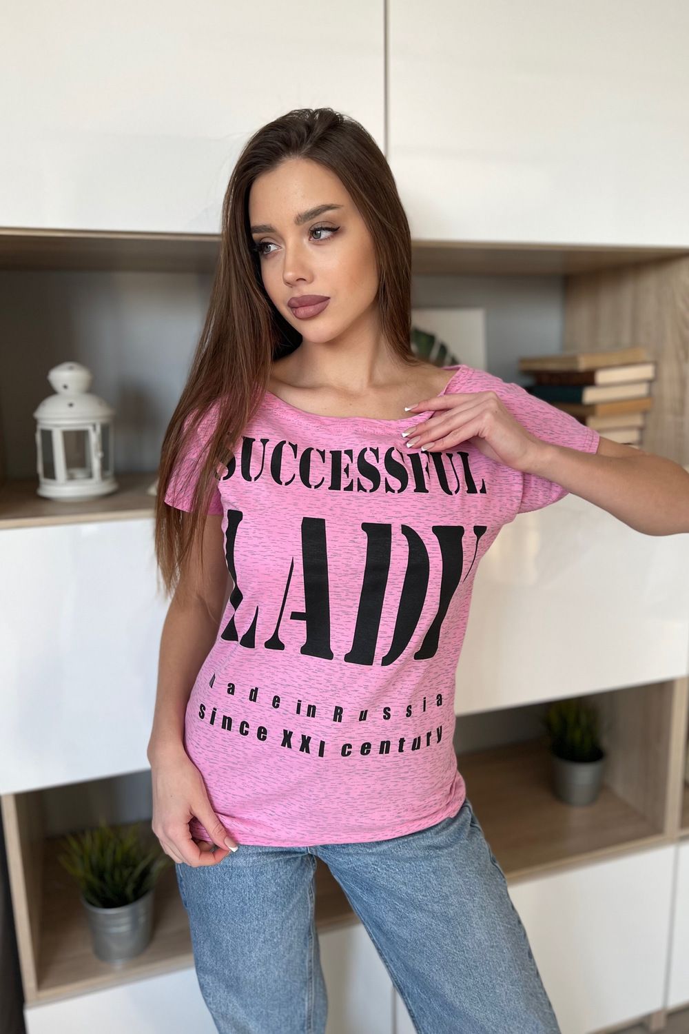 Стильная футболка из кулирки с широкой горловиной. Принт в виде надписей, несколько вариантов расцветки, окантовка в тон.