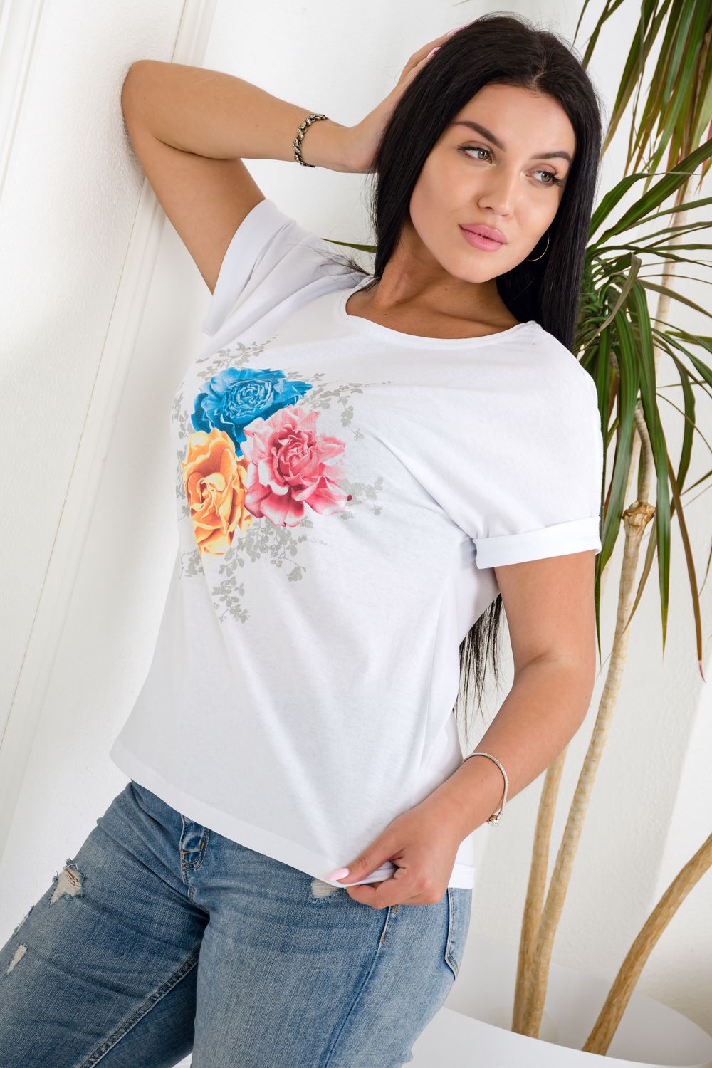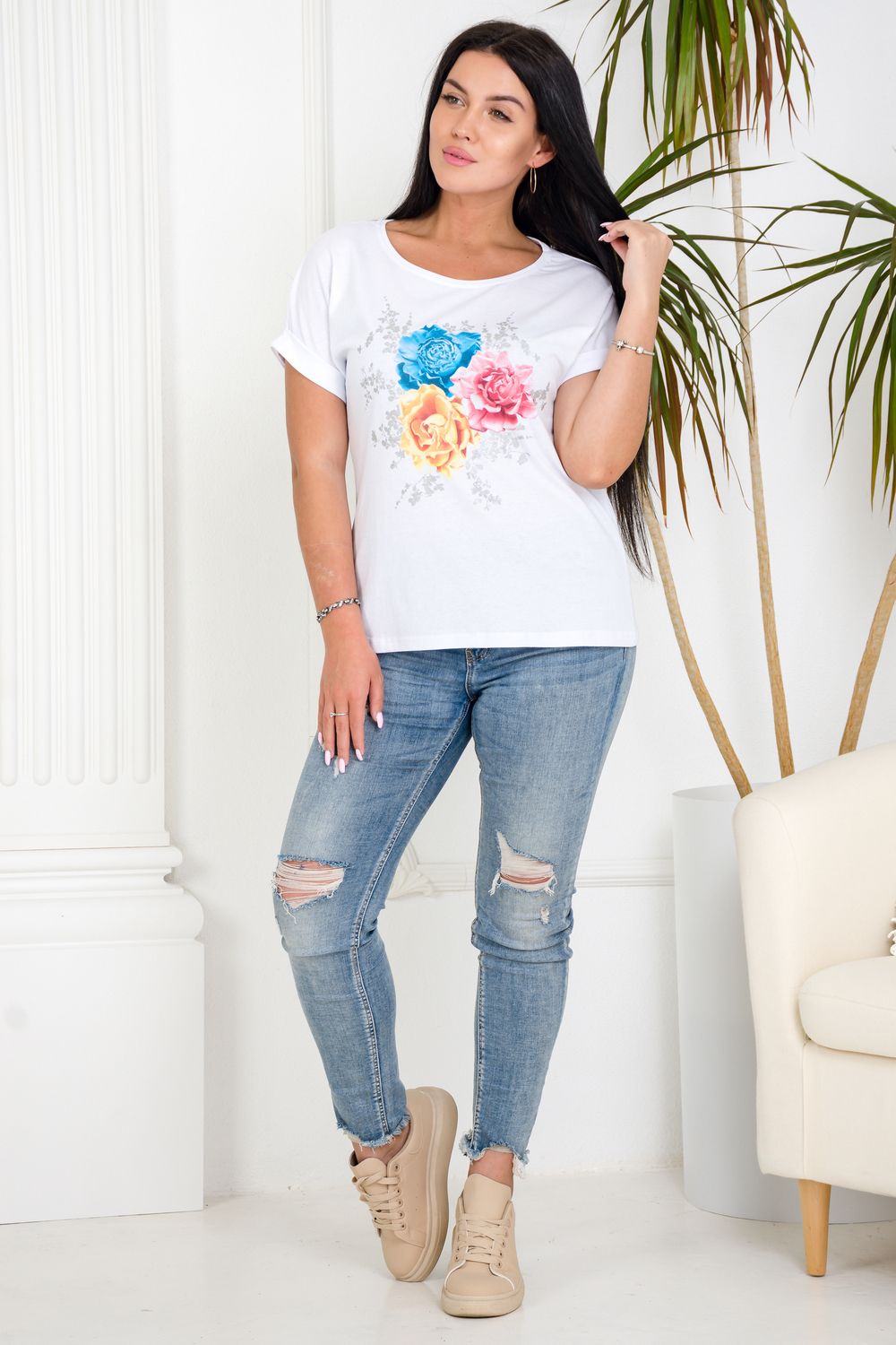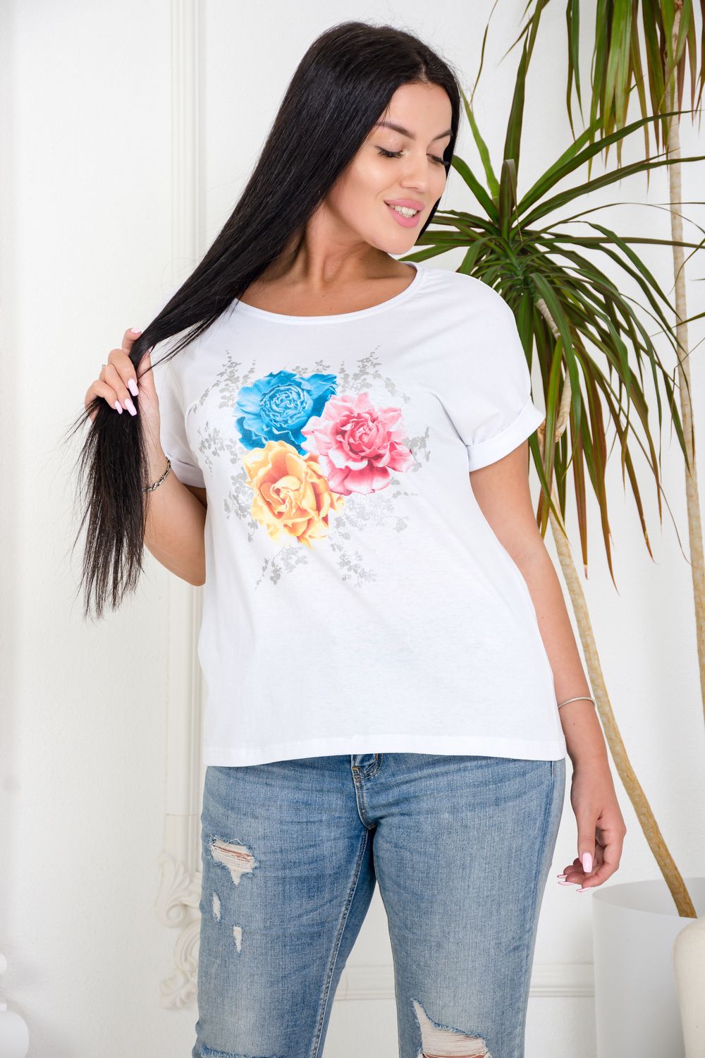 Футболка - незаменимый спутник женщин в летнее время. Состав - 100% хлопок. Свободный силуэт. Цельнокроенный рукав с манжетой. Принт в нежных тонах с листочками из искрящегося глиттера серебром. Прекрасно сочетается с джинсами и шортами, юбками и комбинезонами.