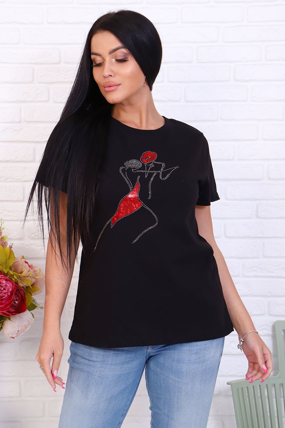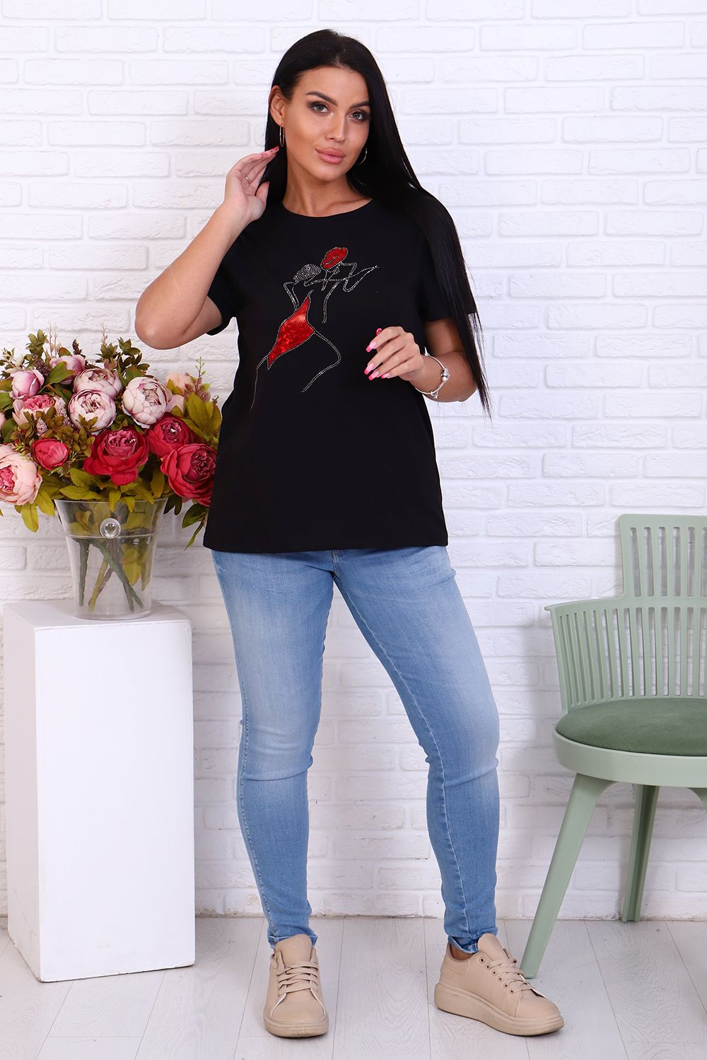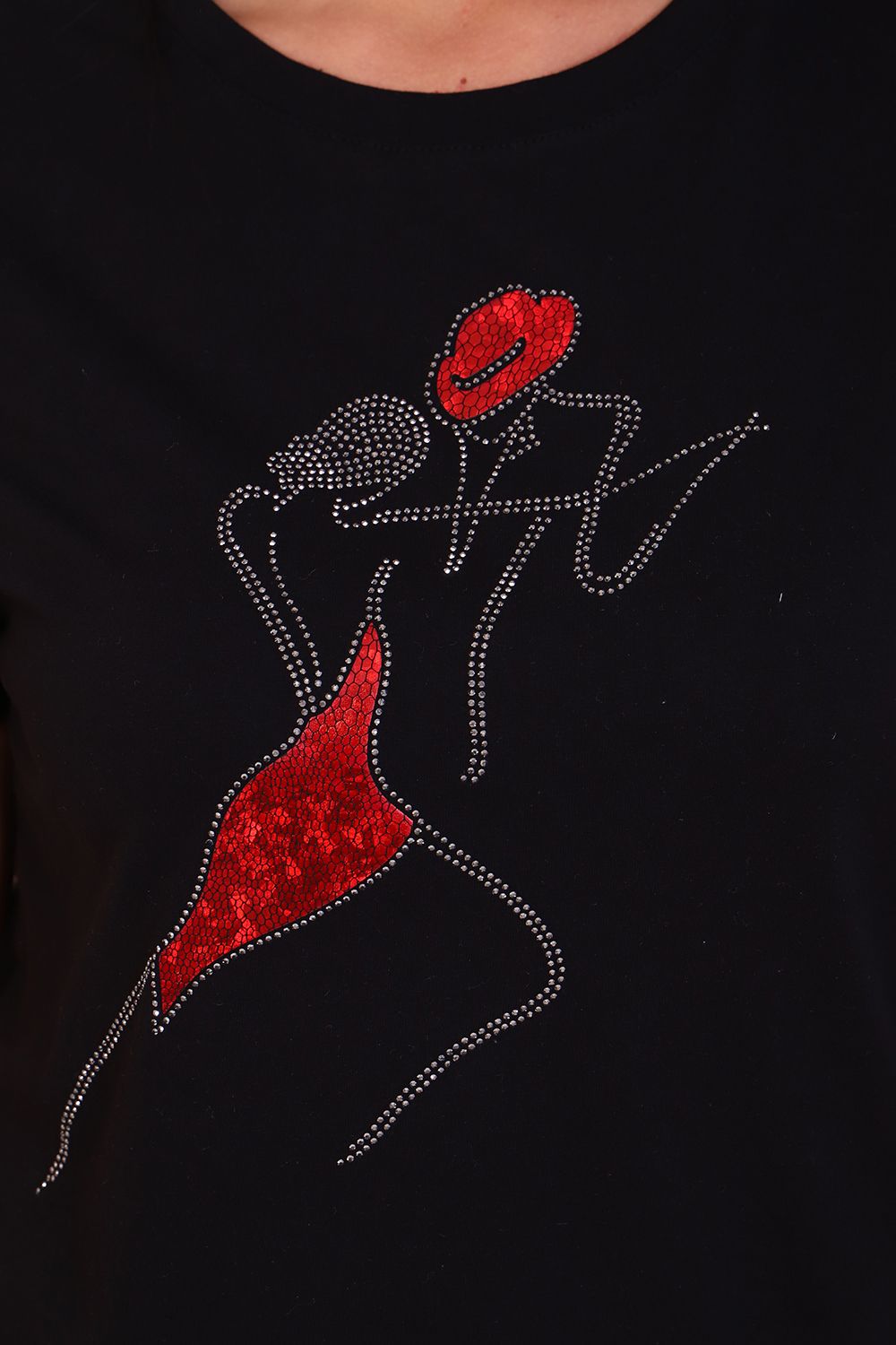 Футболка обычного кроя. Короткий рукав. Имеется декоративный элемент в виде страз: мужчина с женщиной танцуют танго. Выполнена футболка из кулирки: 100% хлопок, плотностью 140 гр