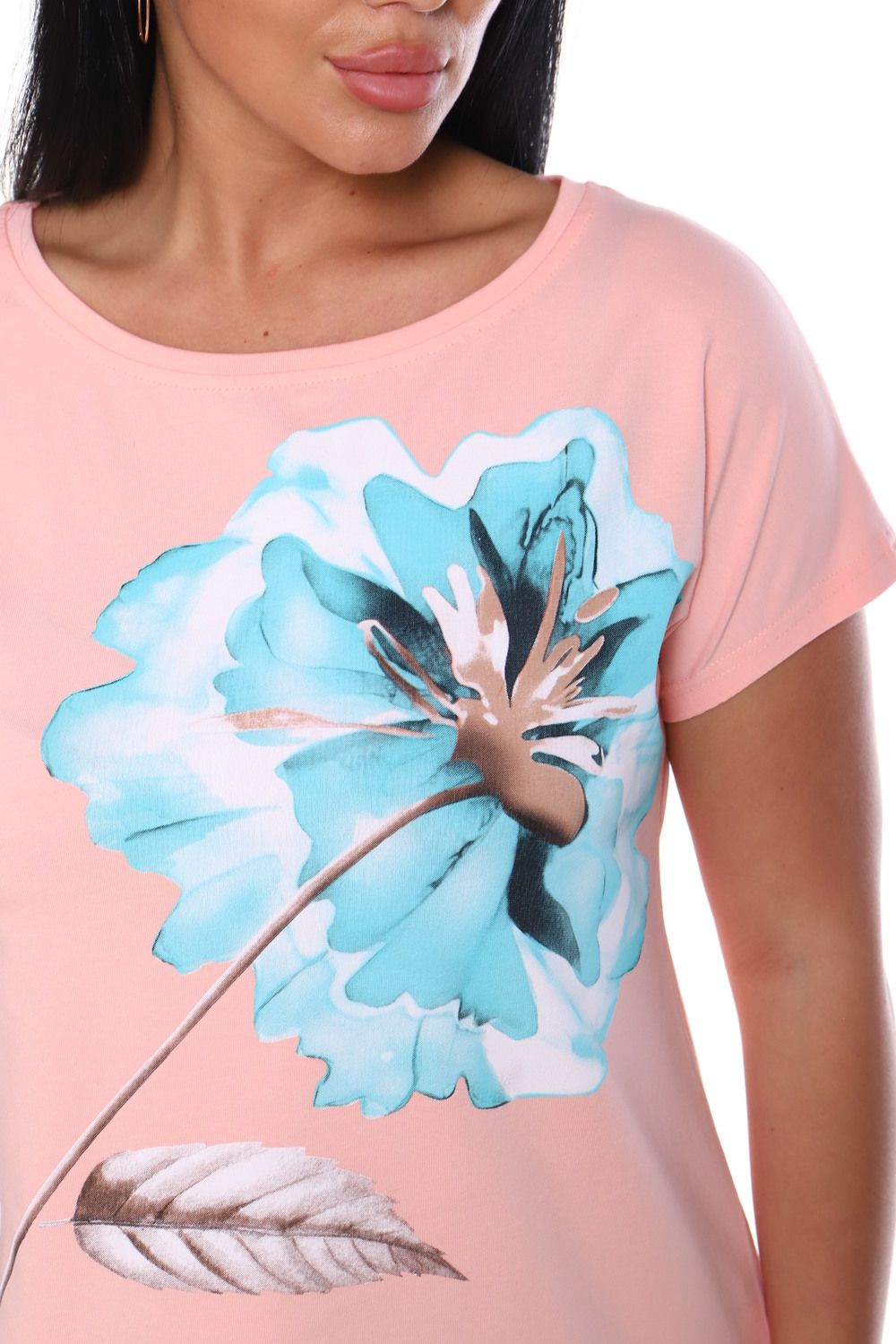 Футболка женская свободного силуэта, с цельнокроеным спущенным рукавом. Спинка оформлена рельефами. Длина изделия до середины бедра. Полочка декорирована принтом в виде цветка. Идеально подходит к брюкам или юбке