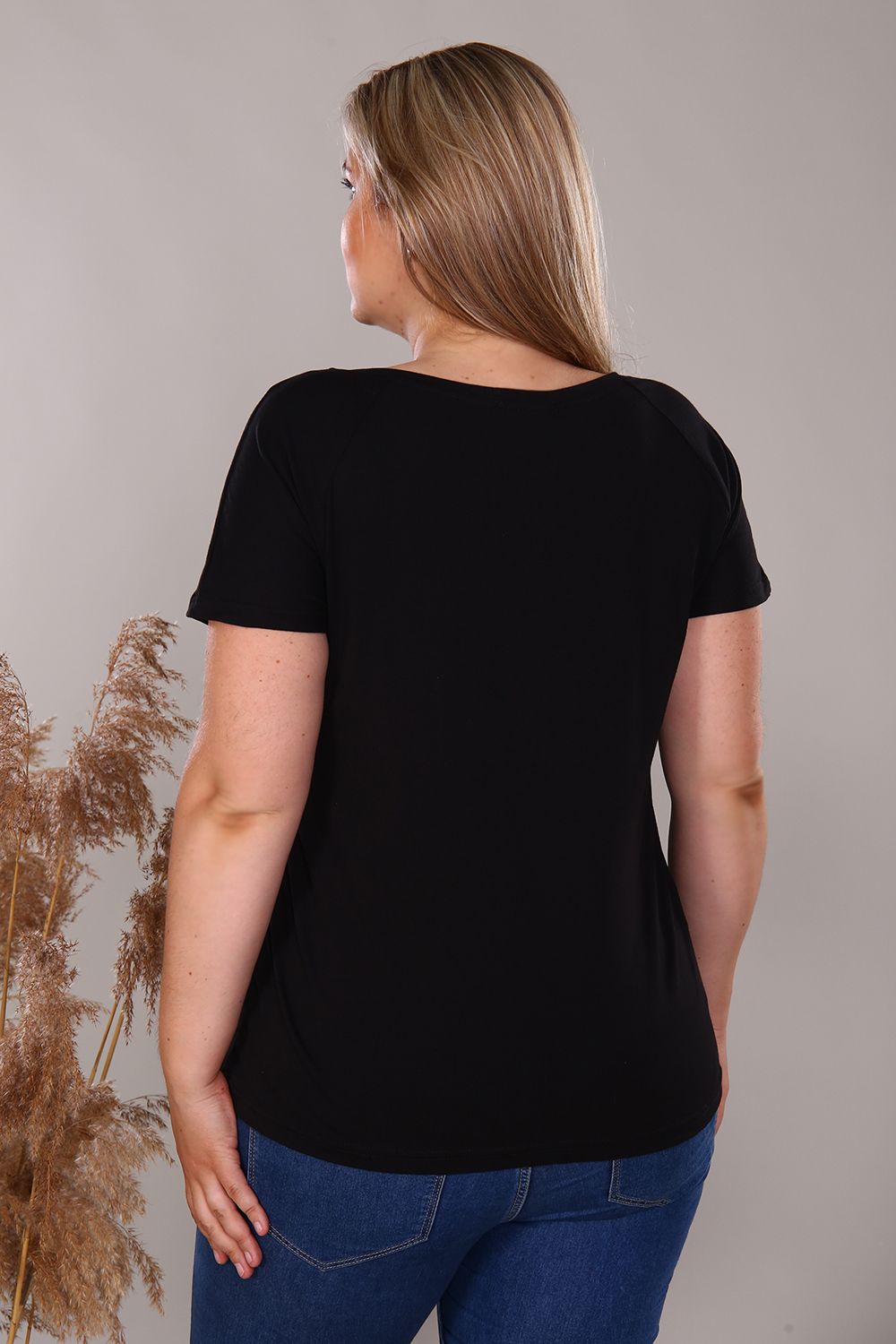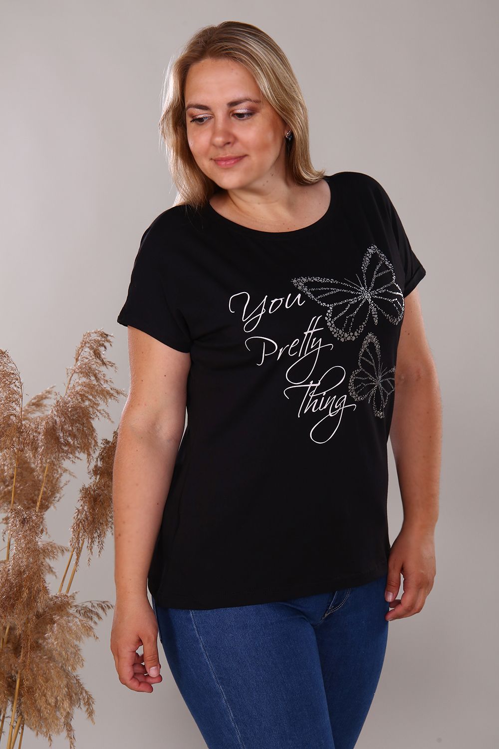 Футболка женская 48-60 свободного силуэта, с цельнокроенным спущенным рукавом. Спинка оформлена рельефами. Длина изделия до середины бедра. Полочка декорирована принтом в виде бабочки. Идеально подходит для гардероба с юбкой, так же с брюками.