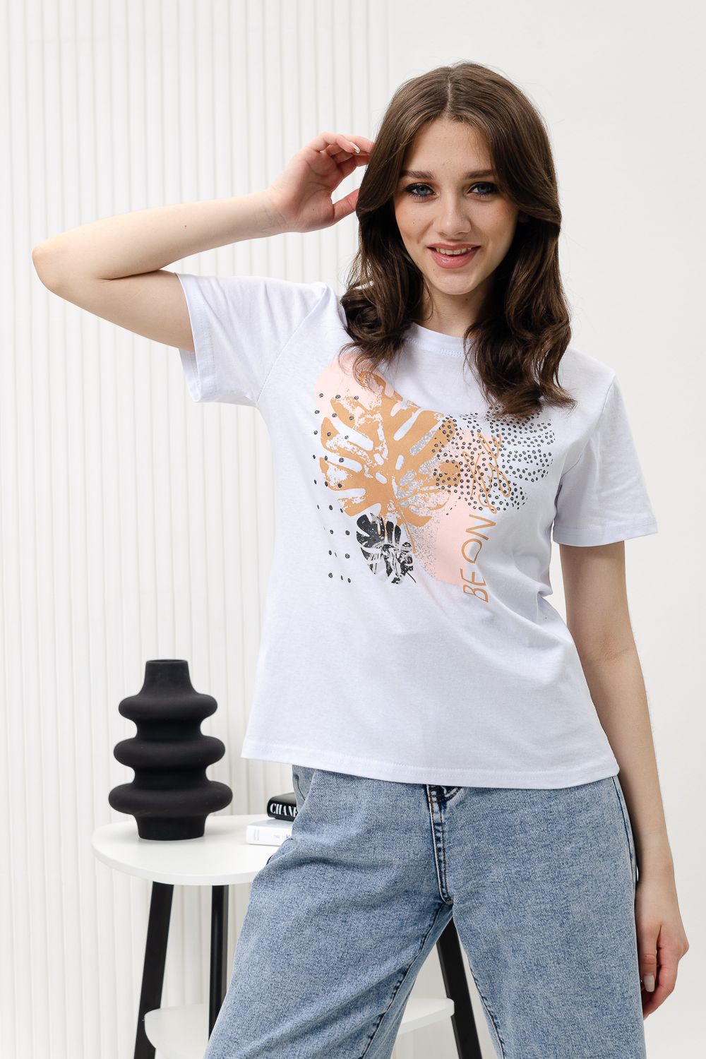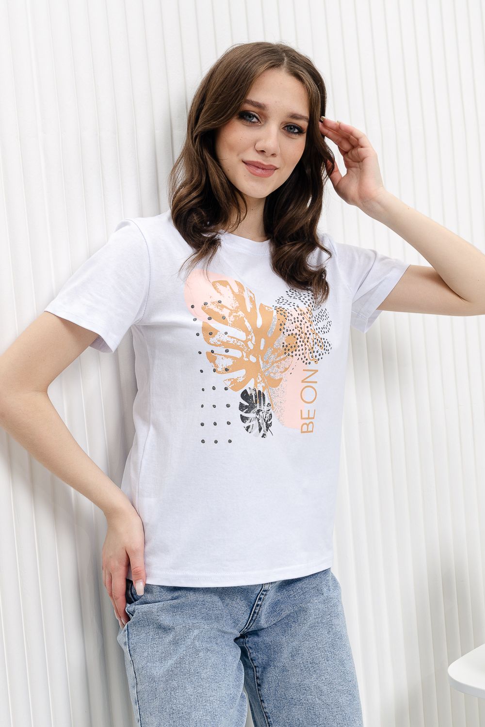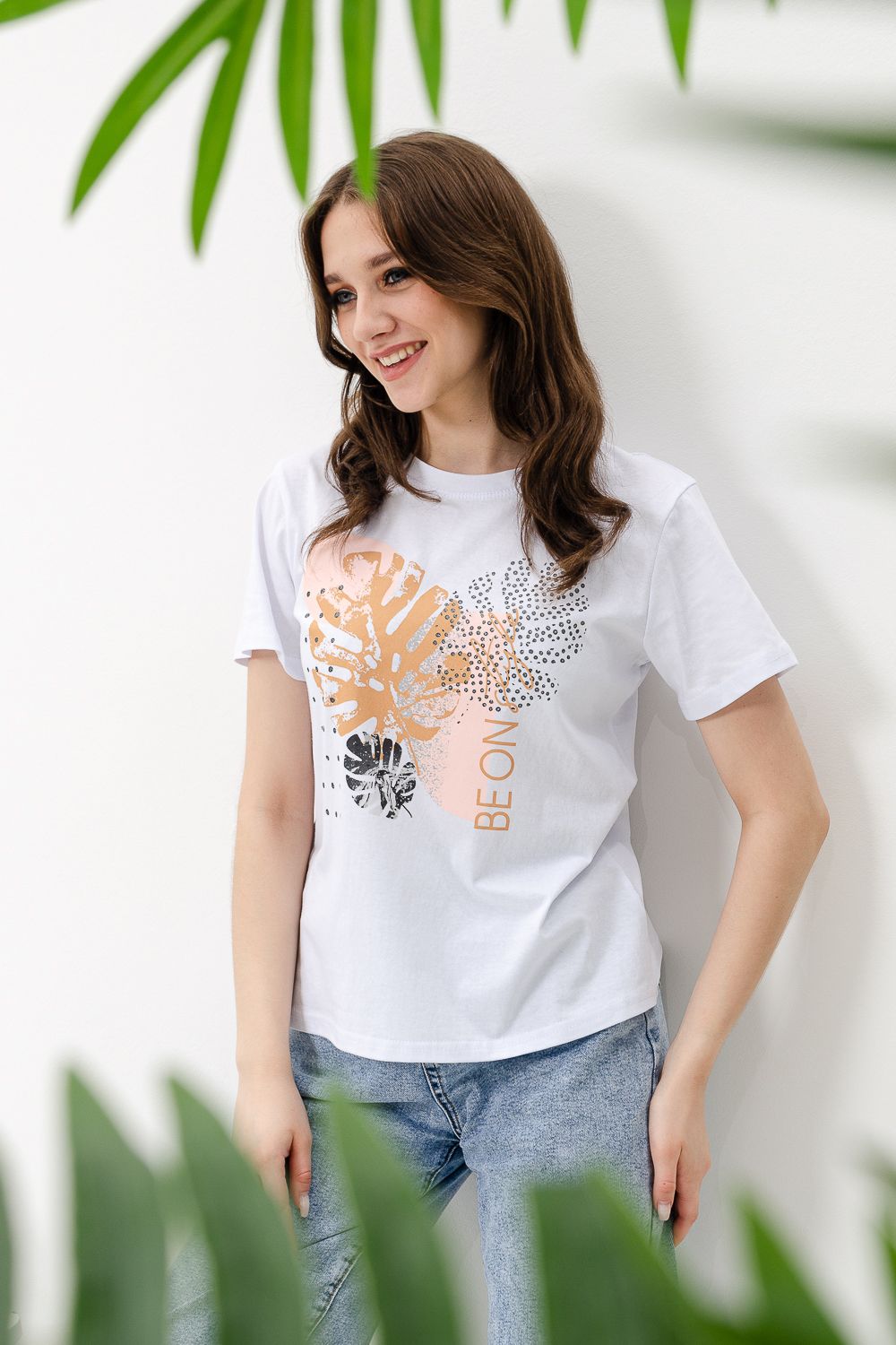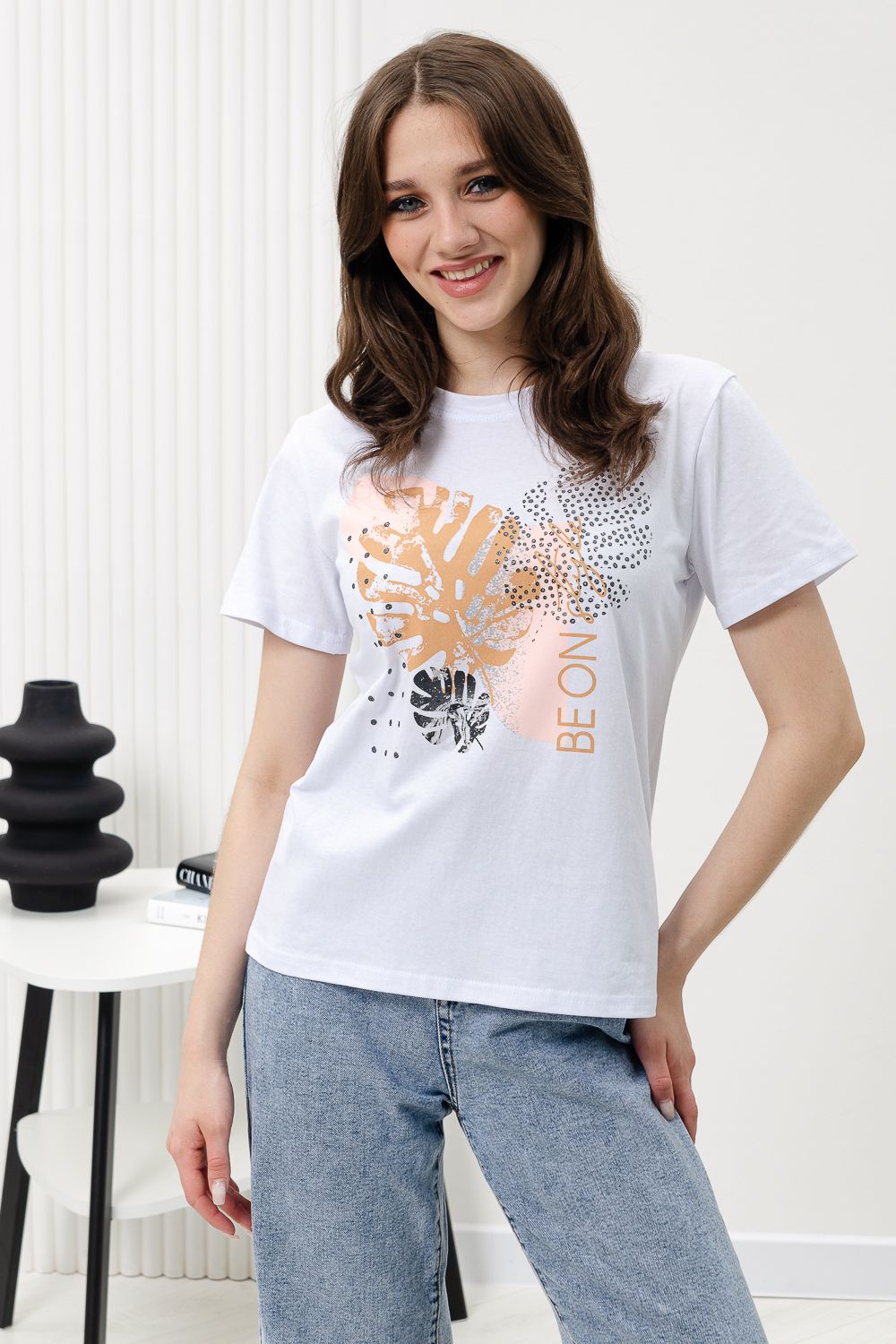 Футболка женская - это классика женского гардероба любой девушки. Это базовая модель с ярким принтом отлично смотрится с джинсами, юбками, брюками. Прямой силуэт, втачной рукав, горловина округлой формы обработана обтачкой из основного полотна.