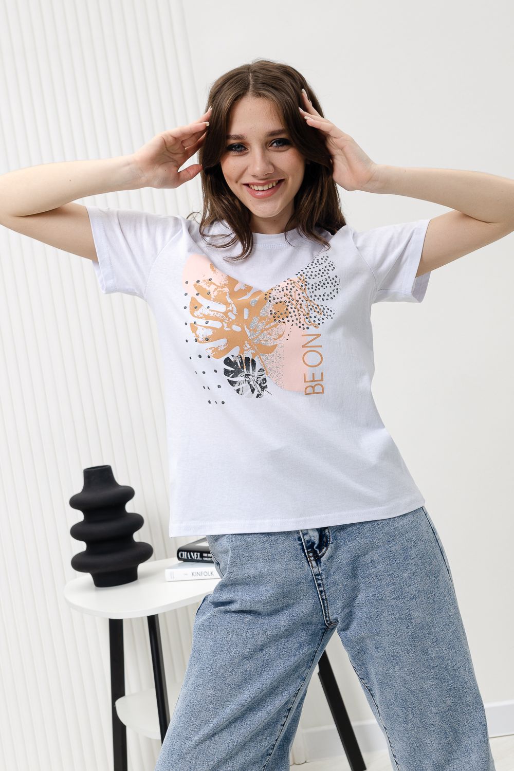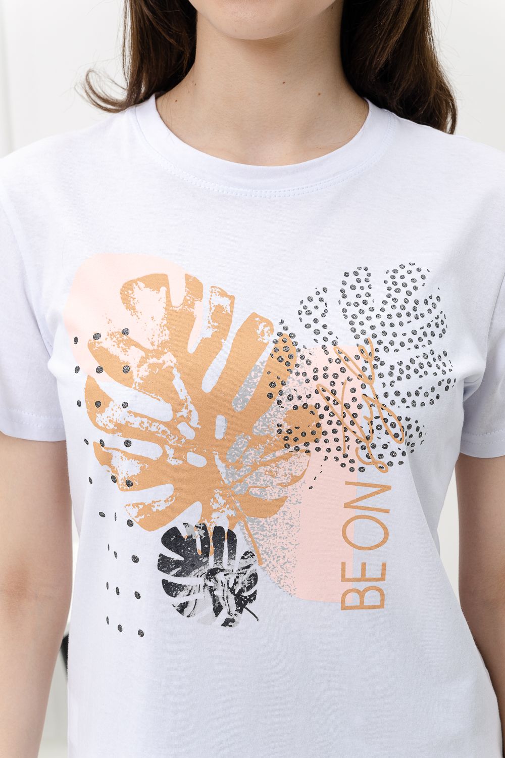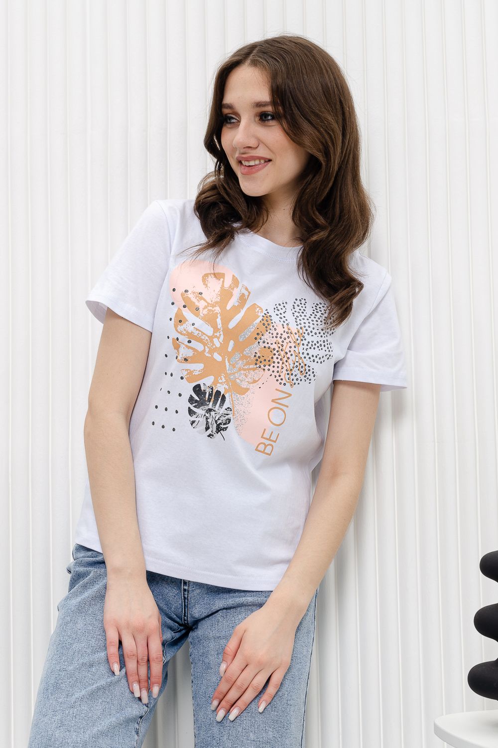 Футболка женская - это классика женского гардероба любой девушки. Это базовая модель с ярким принтом отлично смотрится с джинсами, юбками, брюками. Прямой силуэт, втачной рукав, горловина округлой формы обработана обтачкой из основного полотна.