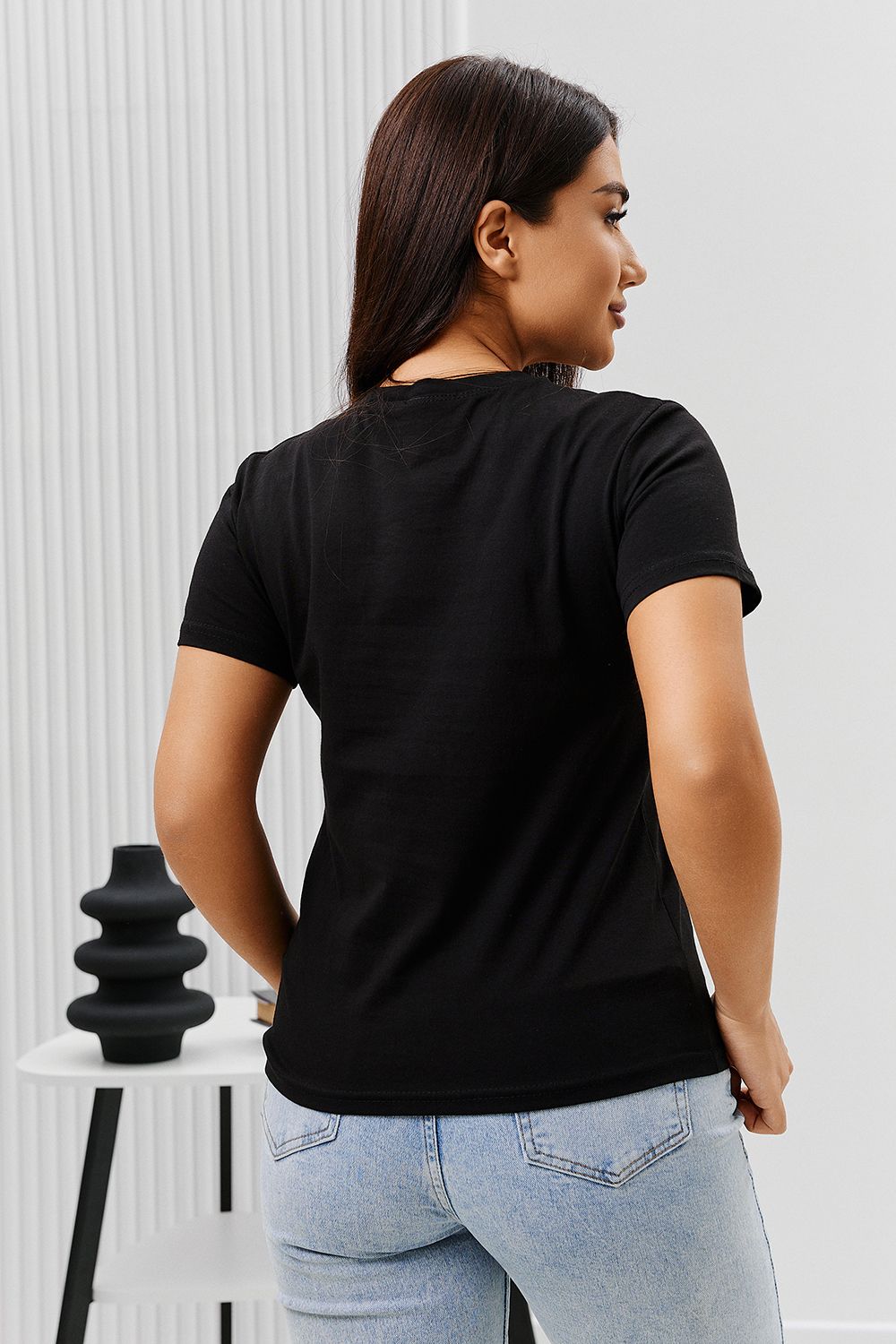 Футболка женская - это классика женского гардероба любой девушки. Это базовая модель с ярким принтом отлично смотрится с джинсами, юбками, брюками. Прямой силуэт, втачной рукав, горловина округлой формы обработана обтачкой из основного полотна.