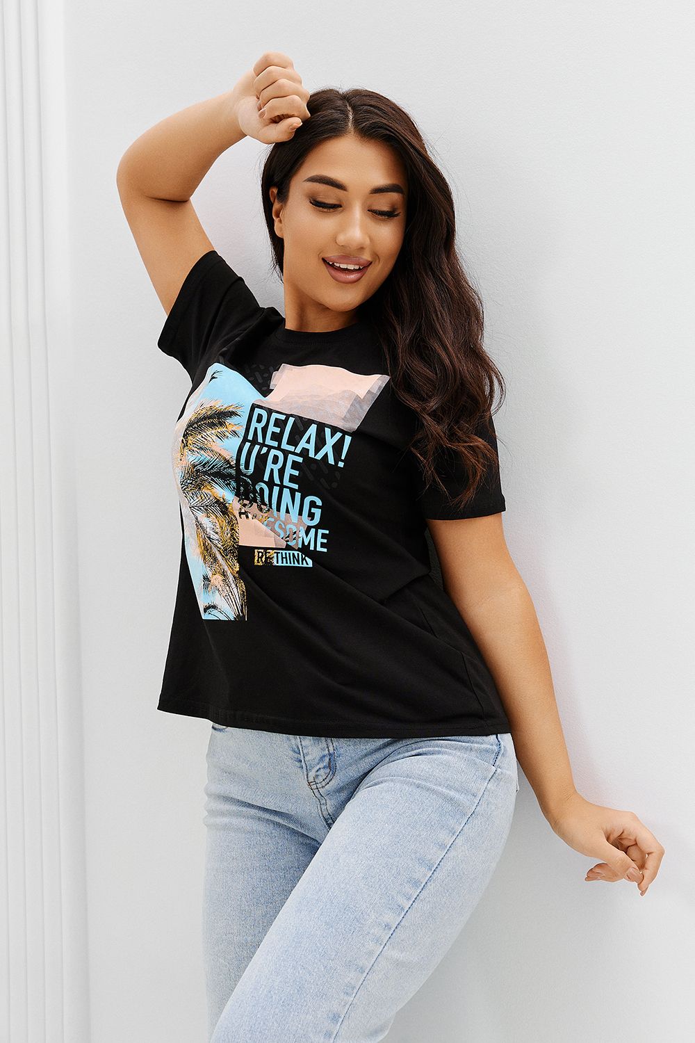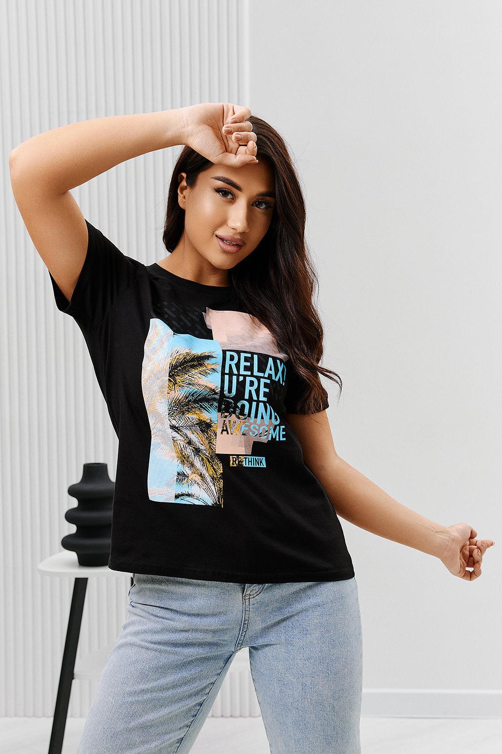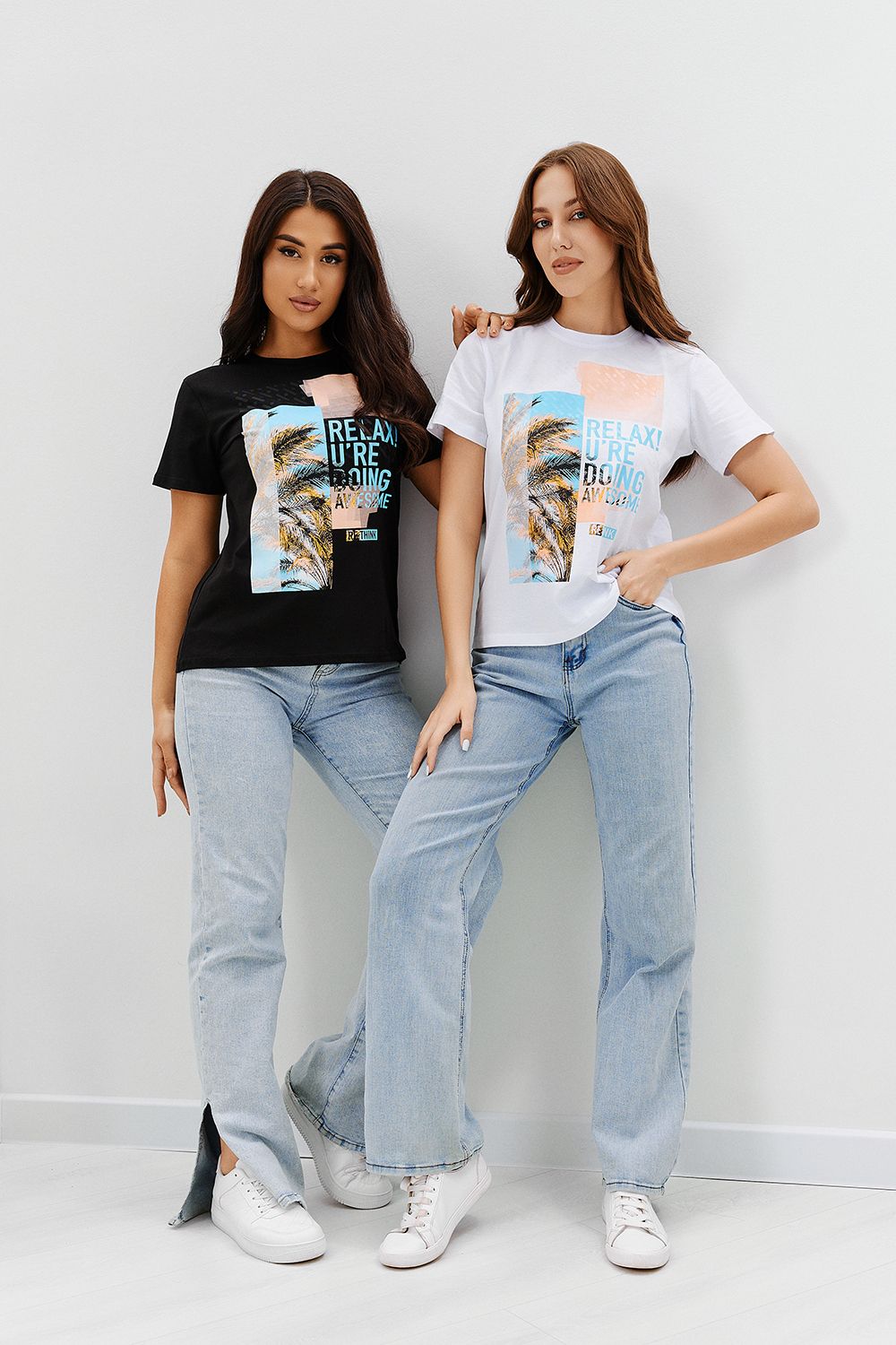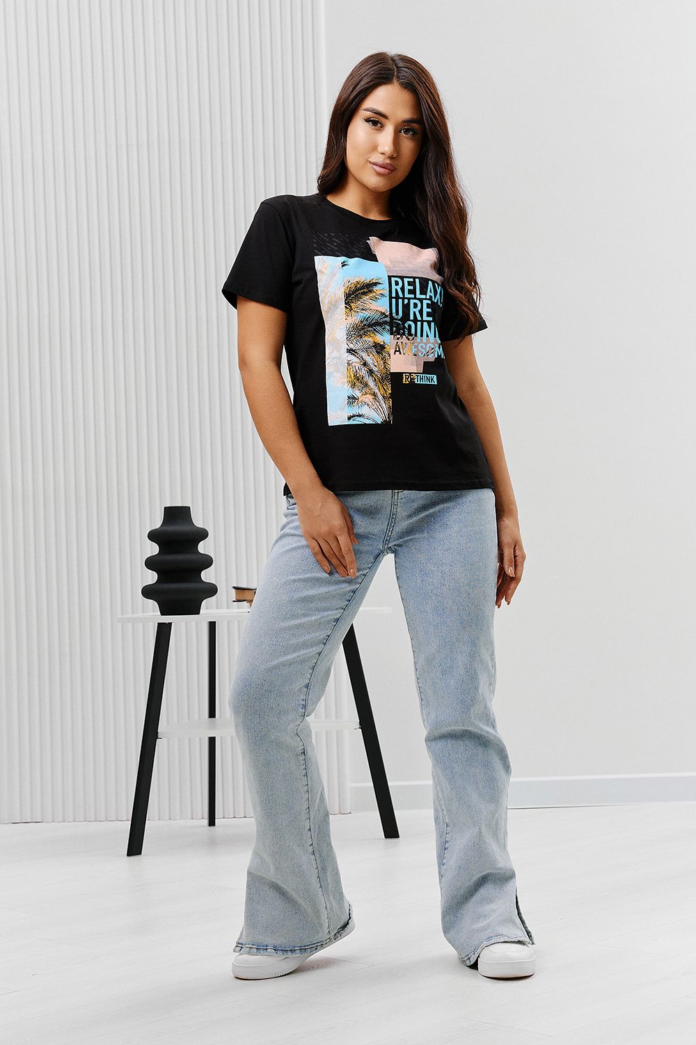 Футболка женская - это классика женского гардероба любой девушки. Это базовая модель с ярким принтом отлично смотрится с джинсами, юбками, брюками. Прямой силуэт, втачной рукав, горловина округлой формы обработана обтачкой из основного полотна.