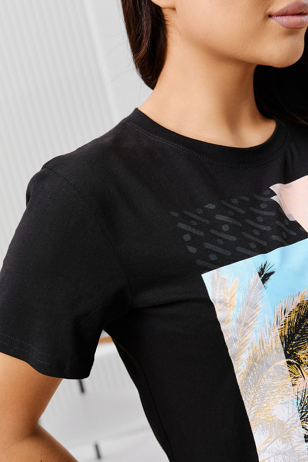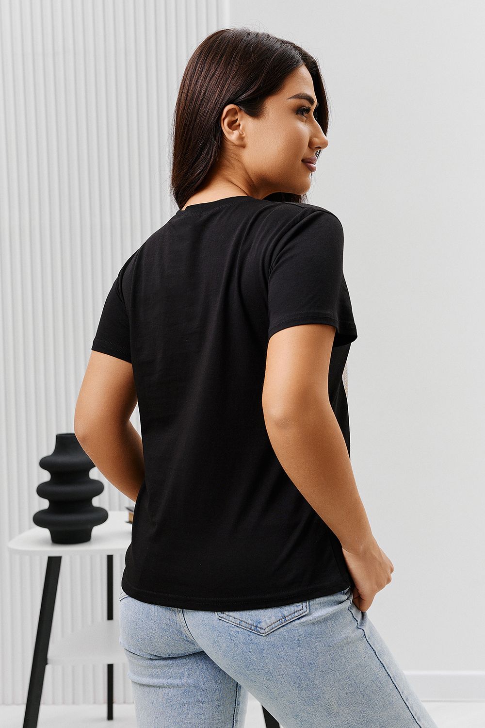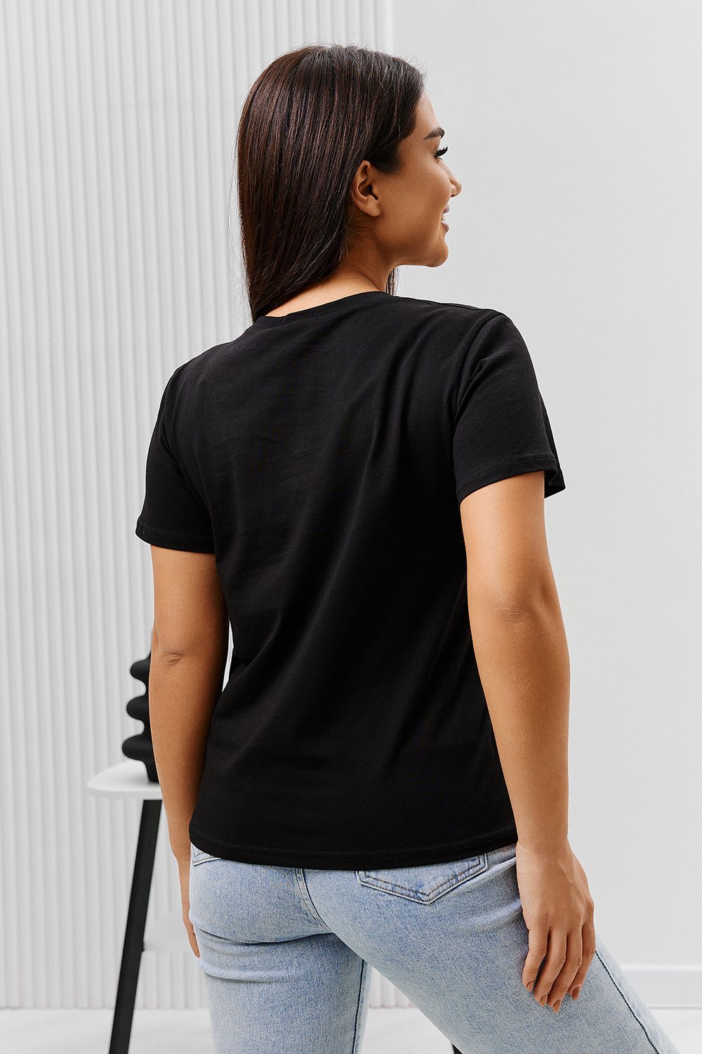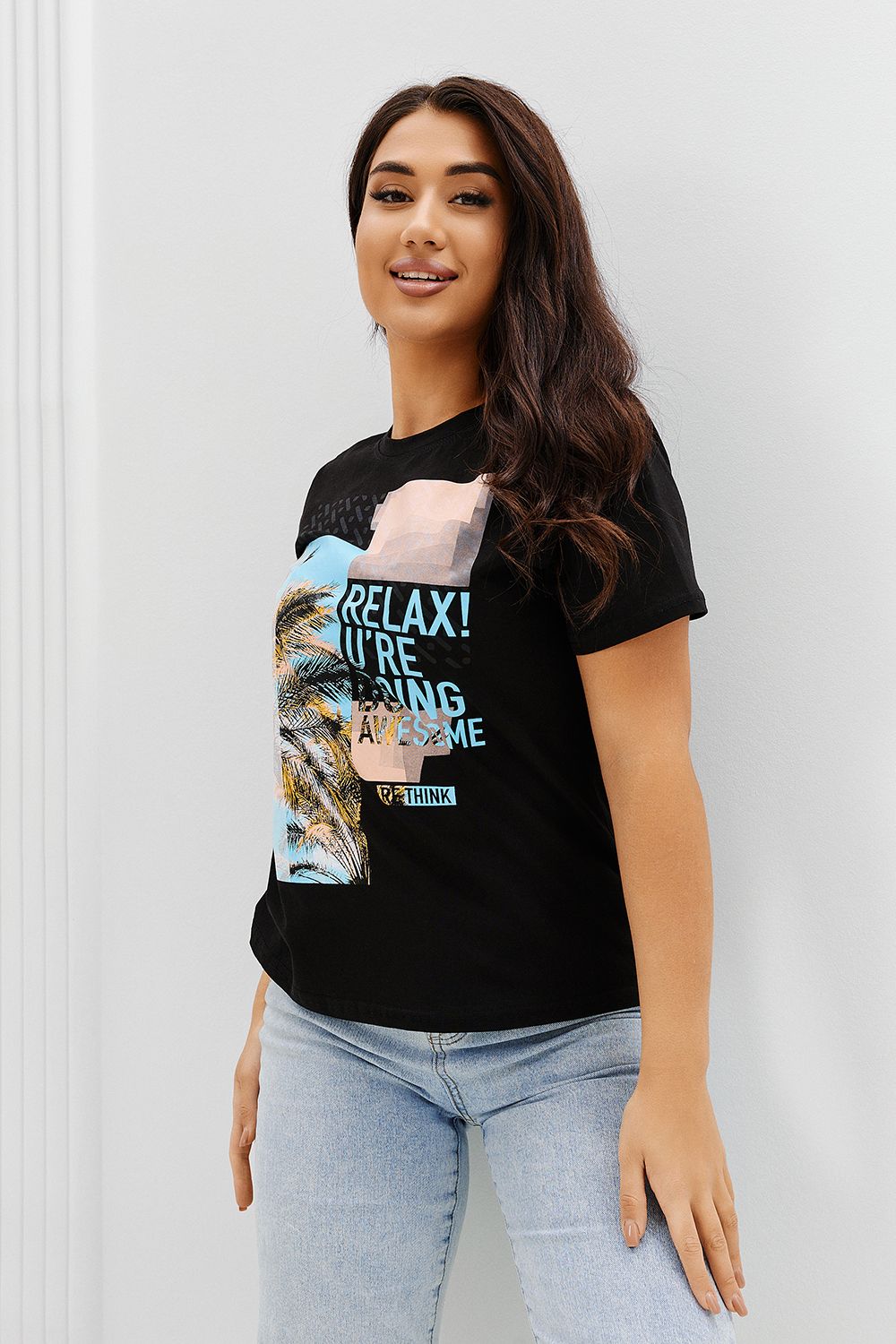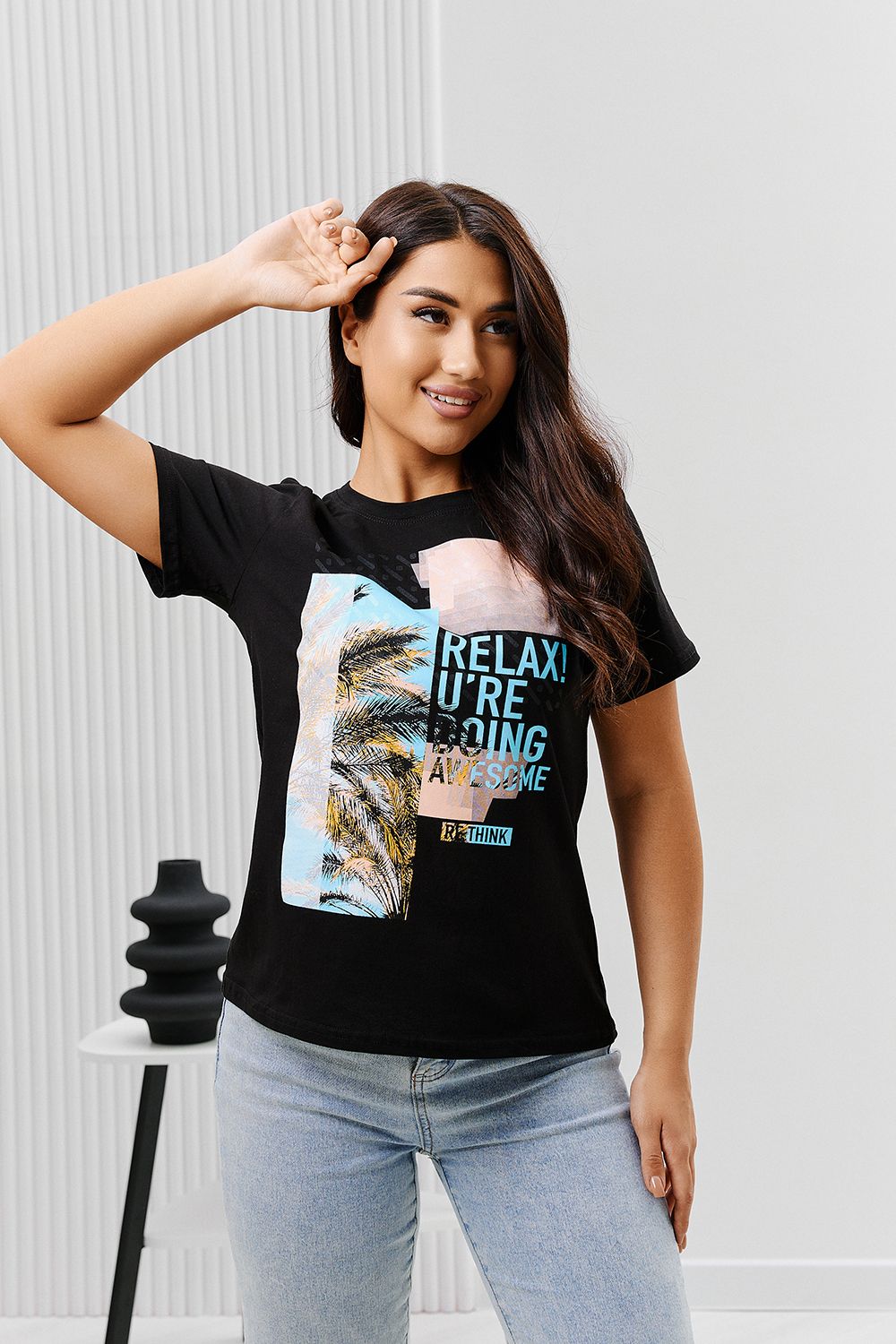Футболка женская - это классика женского гардероба любой девушки. Это базовая модель с ярким принтом отлично смотрится с джинсами, юбками, брюками. Прямой силуэт, втачной рукав, горловина округлой формы обработана обтачкой из основного полотна.